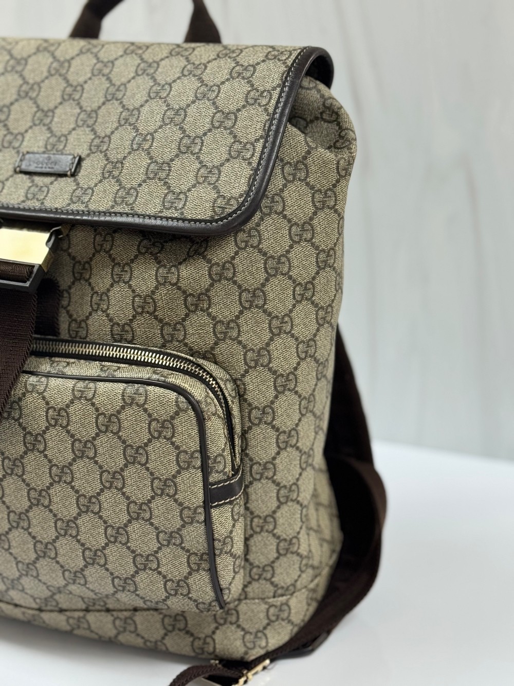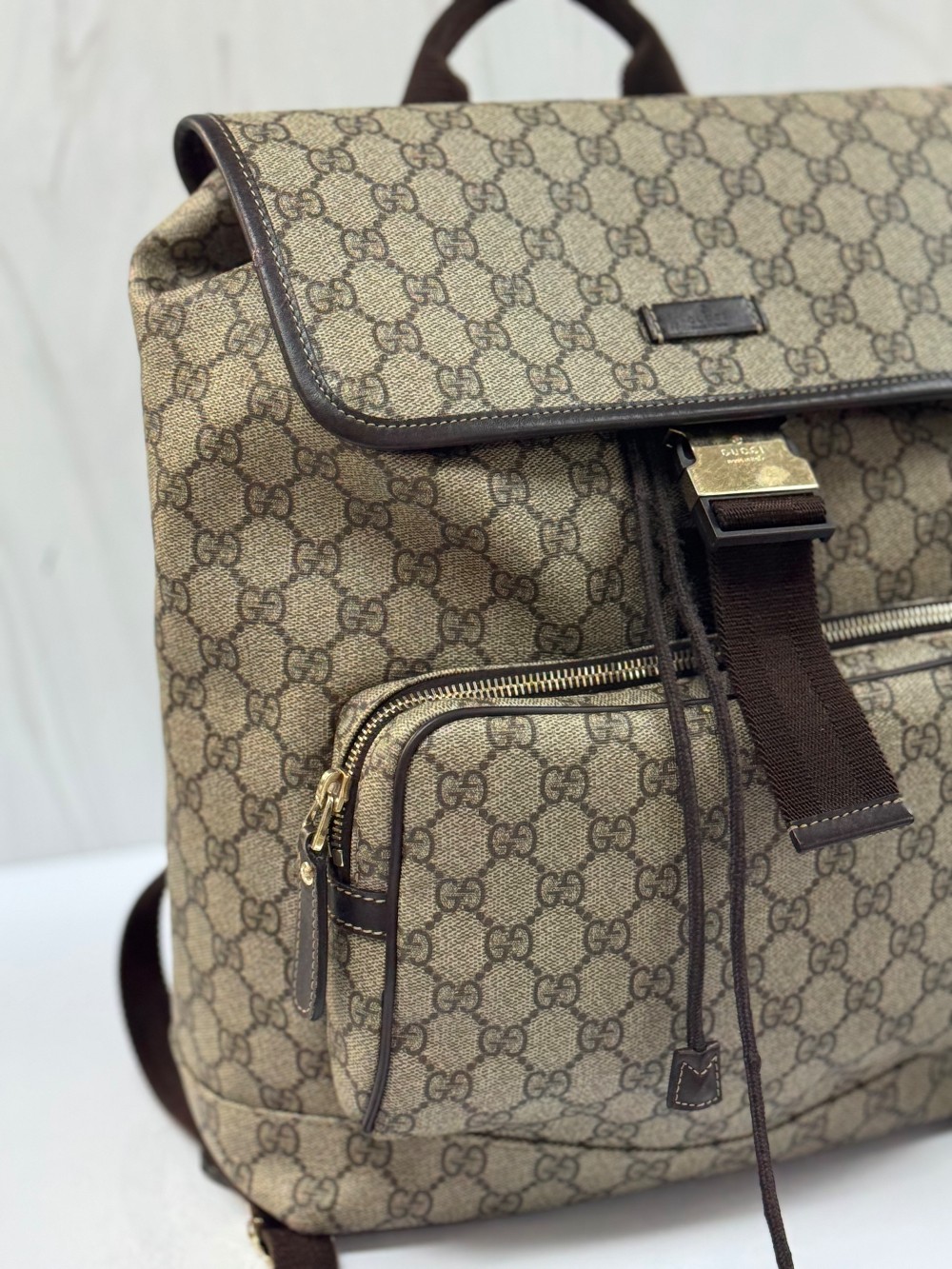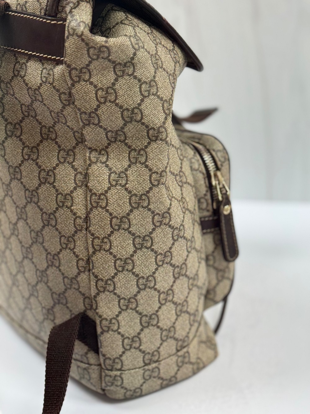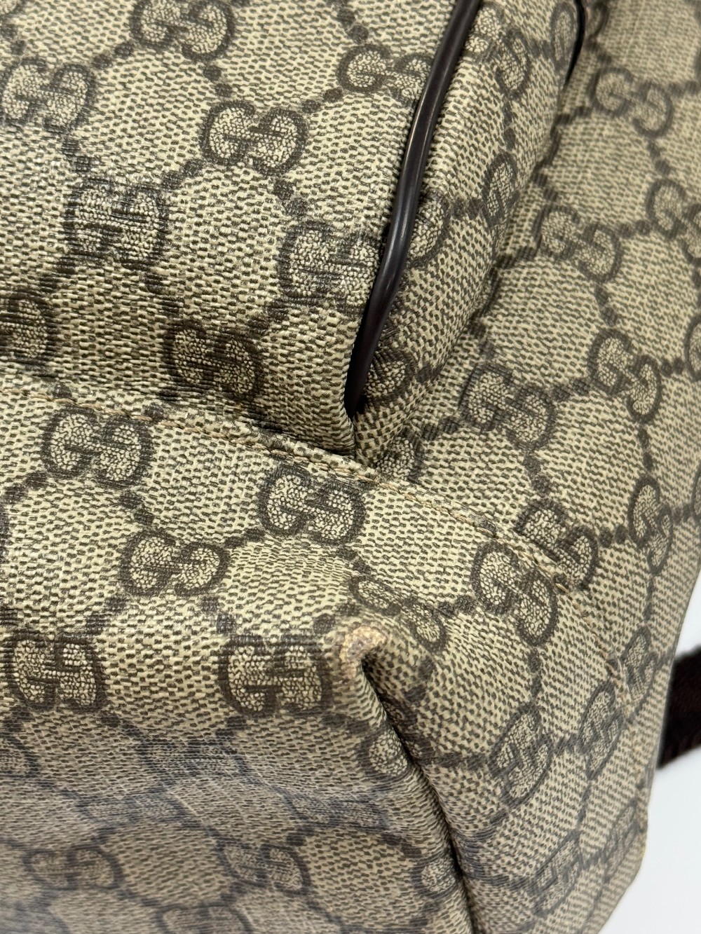 This is an authentic GUCCI GG Supreme Monogram Medium Backpack in Brown. This is a chic backpack that is as practical as it is stylish. It is constructed of classic monogram GG canvas that is reinforced with leather piping. The bag has a crossover top drawstring flap, an external zipper pocket and has nylon adjustable shoulder straps and a convenient grip. The interior is a spacious chocolate brown textile with a zipper pocket. This is superb backpack, ideal for everyday essentials, from Gucci!