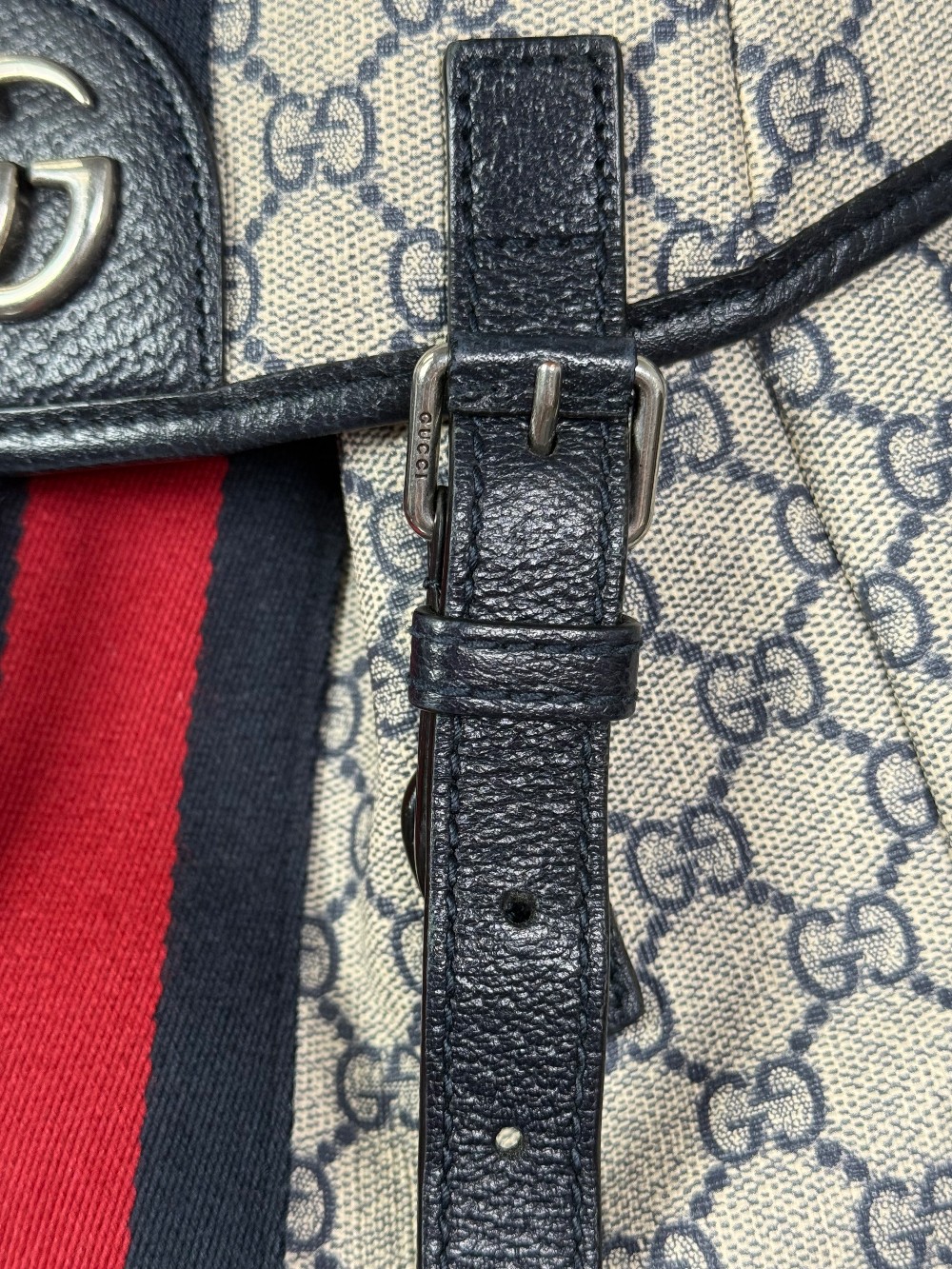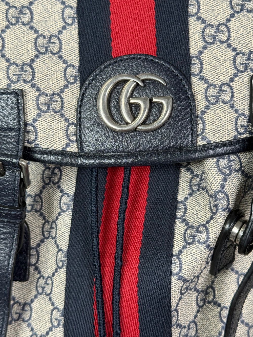 This is an authentic GUCCI GG Supreme Monogram Medium Ophidia Double Buckle Backpack in Beige, Blue, and Black. This bag is crafted of beige and blue GG monogram coated canvas, blue leather trim, and ruthenium hardware. The top opens to a beige fabric interior.