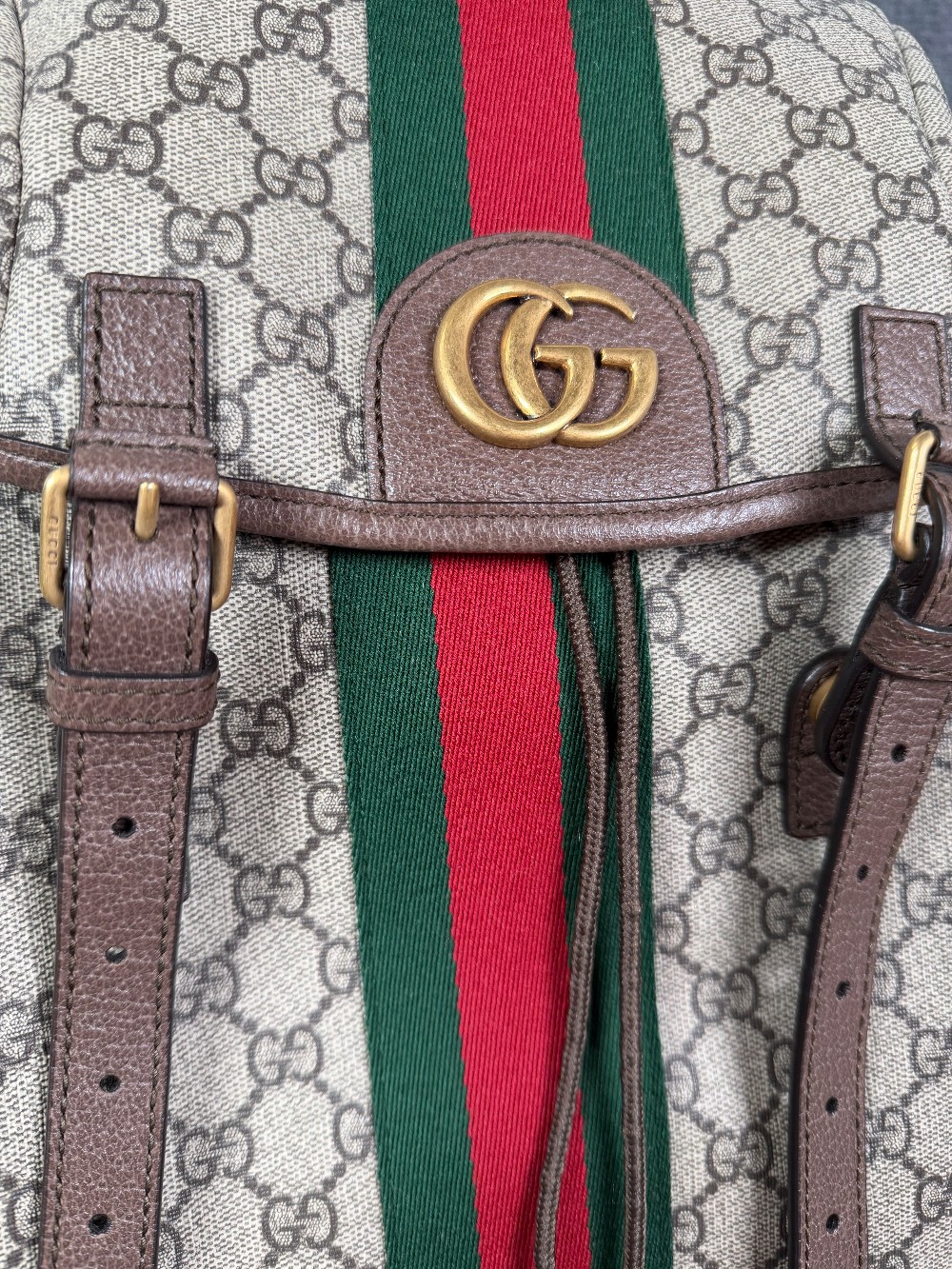 This is an authentic GUCCI GG Supreme Monogram Medium Ophidia Double Buckle Backpack in Brown. This bag is uniquely crafted in beige and brown GG monogram coated canvas. It features green and red web detail with antique gold GG logo, buckle strap and cinch strap closure, exterior flap pockets, and adjustable nylon shoulder straps. The bag opens to a spacious beige interior with a padded sleeve for an electronic device and card slots.