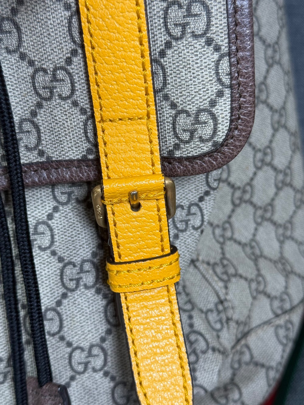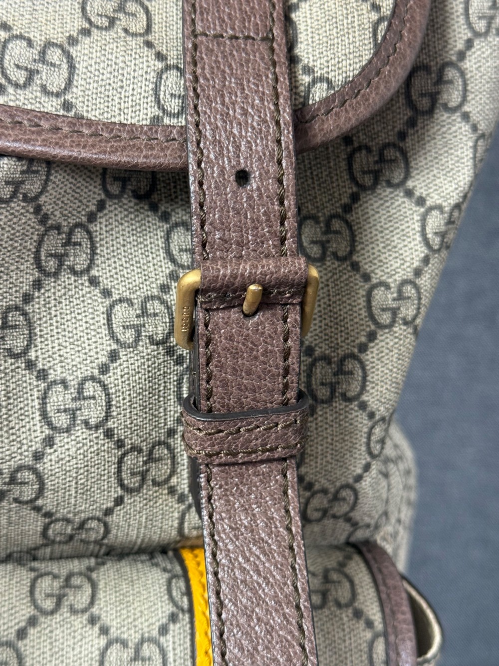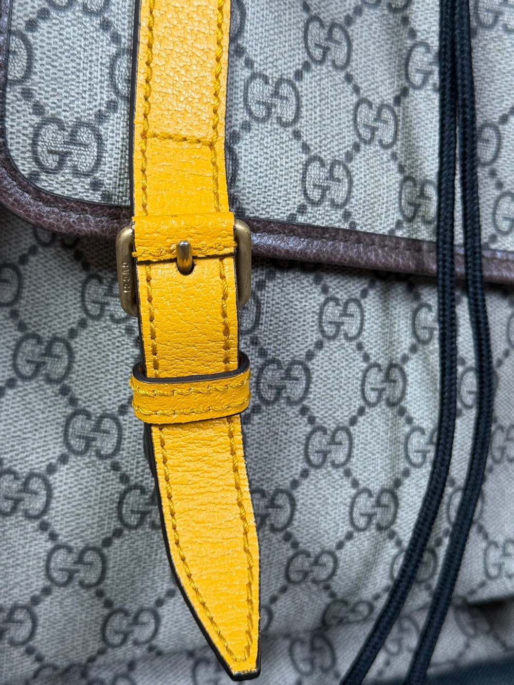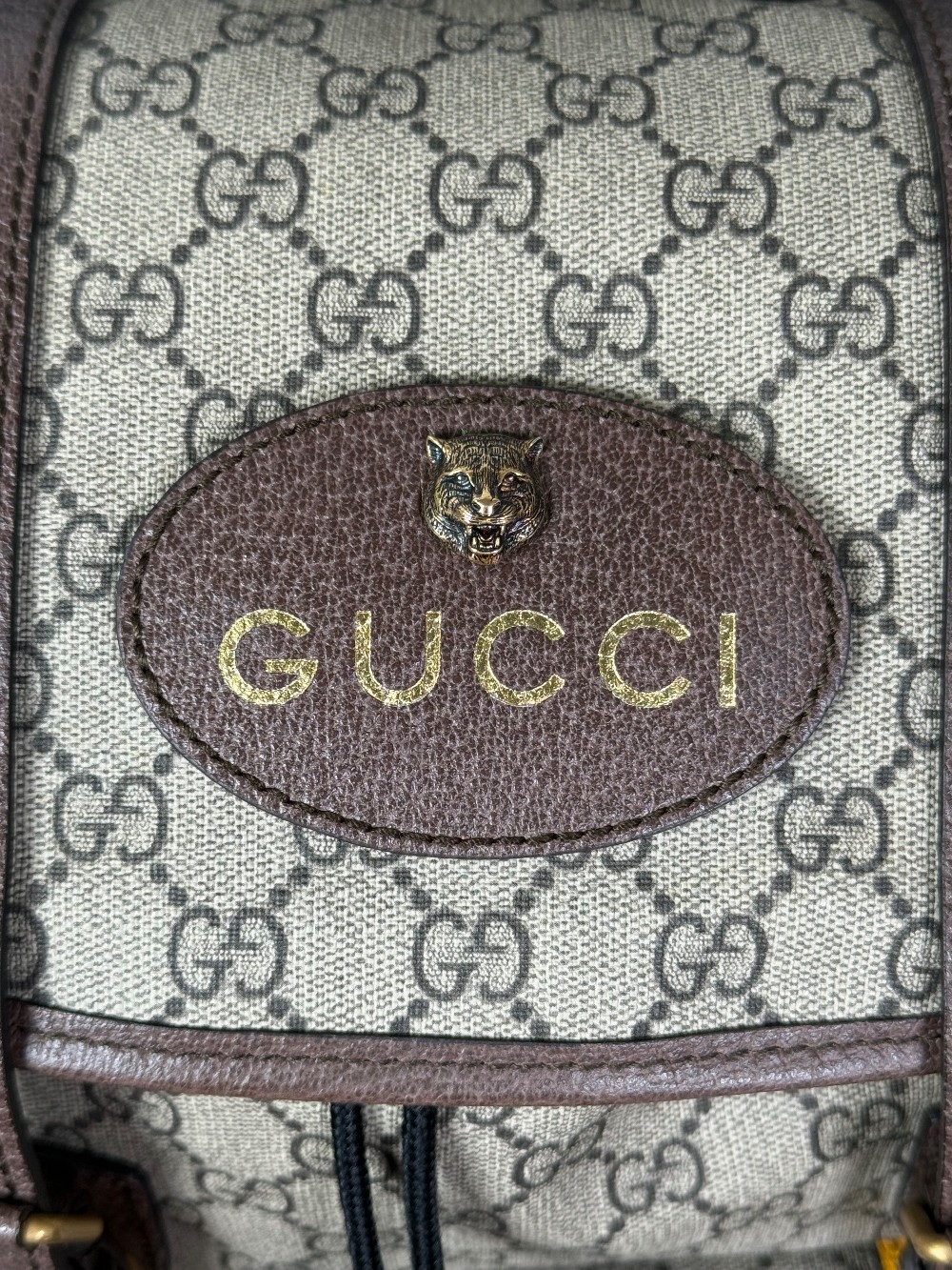 The backpack is crafted from the iconic beige and brown GG Supreme coated canvas with brown leather trim and yellow leather accents.It features a flap-top design with buckle closures. The shoulder straps are padded and feature Gucci's signature green and red web stripe on the back. The main compartment has a nylon drawstring closure.There are two side flap pockets with magnetic snap closures. The front of the bag has a large oval leather patch with the "GUCCI" logo and a tiger head motif.