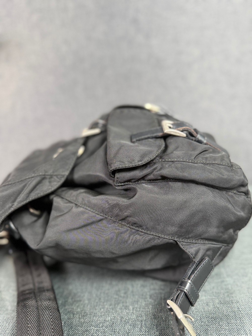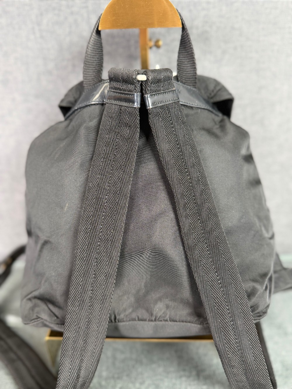 This is an authentic PRADA Tessuto Nylon Small Backpack in Black. This backpack is crafted of black nylon with black saffiano leather accents. It features front bucket pockets with functional buckles and magnetic snap closure, fabric top grip, and adjustable black nylon shoulder straps. The crossover flap opens with a function buckle, magnet, and top drawstring to a black Prada logo jacquard fabric interior with a patch pocket and zippered pocket.