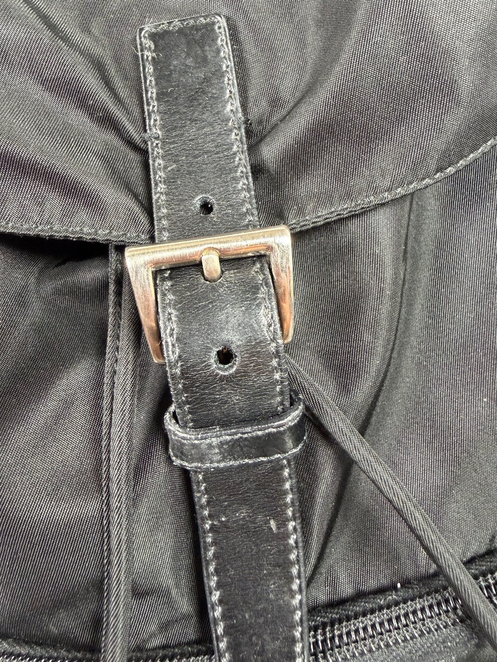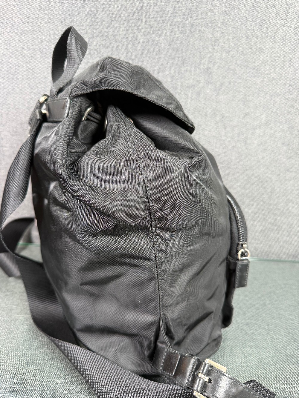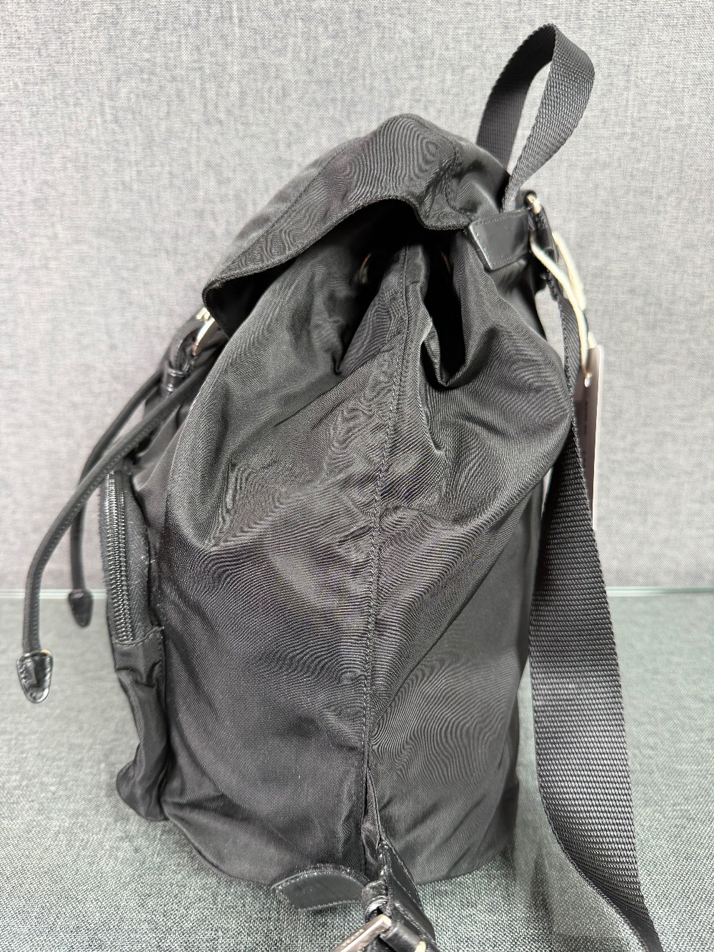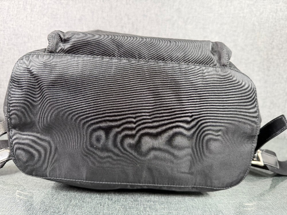This is an authentic PRADA Tessuto Nylon Vela Cinch Backpack in Black. This backpack is crafted of durable nylon in black and features a top flap and an exterior zipper pocket with silver buckles and adjustable shoulder straps. The top opens to a spacious Prada logo fabric interior with a zipper pocket.