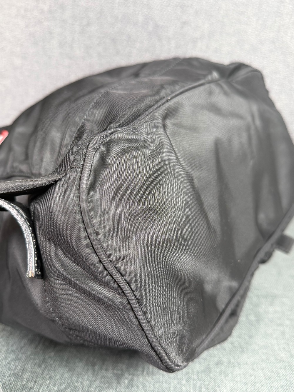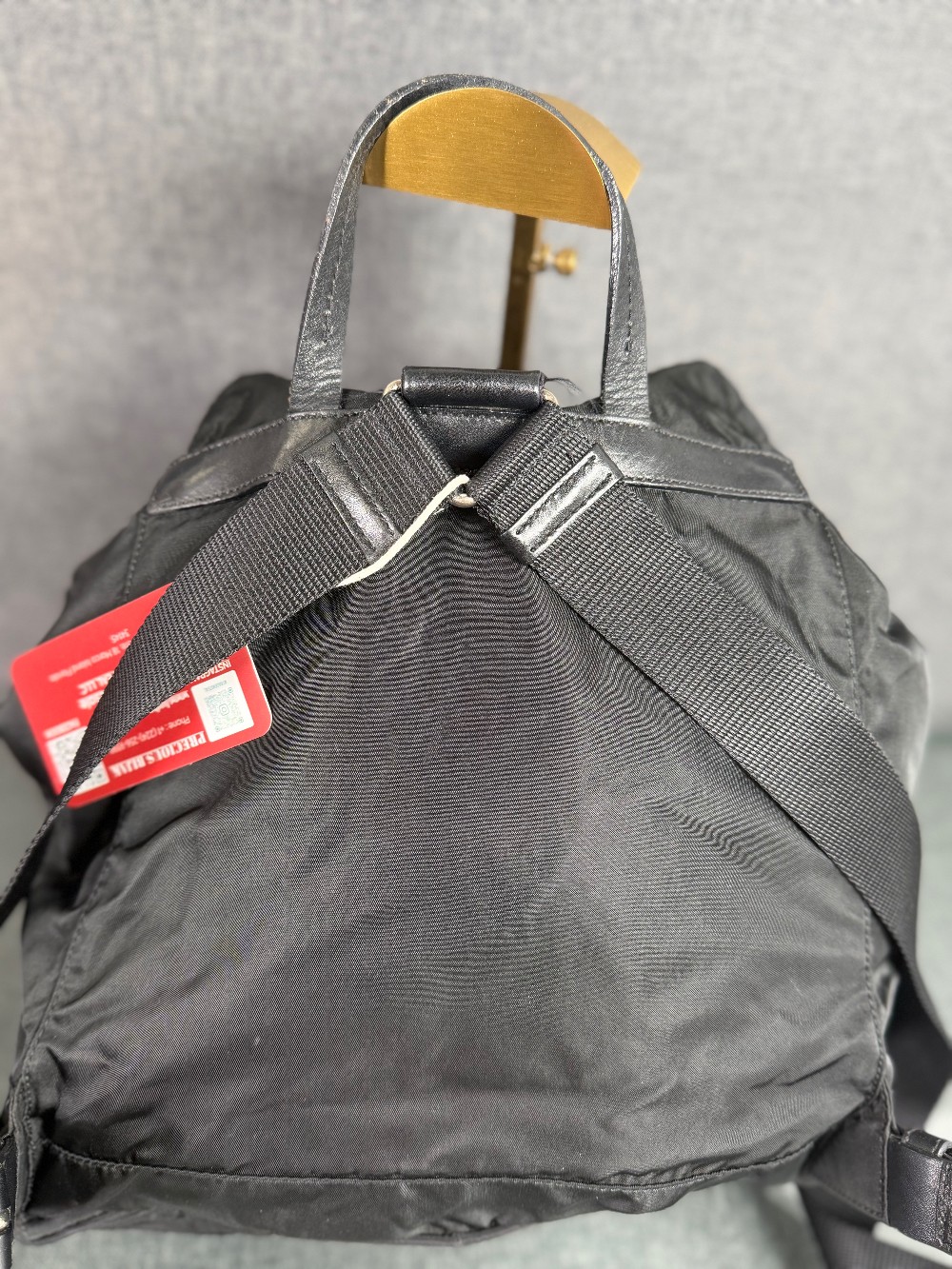 This is an authentic PRADA Tessuto Nylon Backpack in Black. This backpack is crafted of black nylon with black saffiano leather accents. It features front bucket pockets with functional buckles and magnetic snap closure, fabric top grip, and adjustable black nylon shoulder straps. The crossover flap opens with a function buckle, magnet, and top drawstring to a black Prada logo jacquard fabric interior with a patch pocket and zippered pocket.