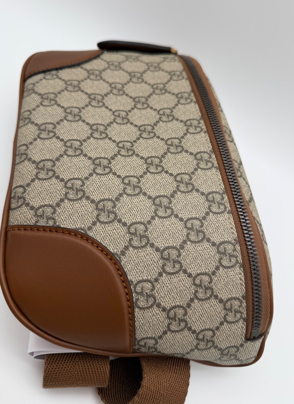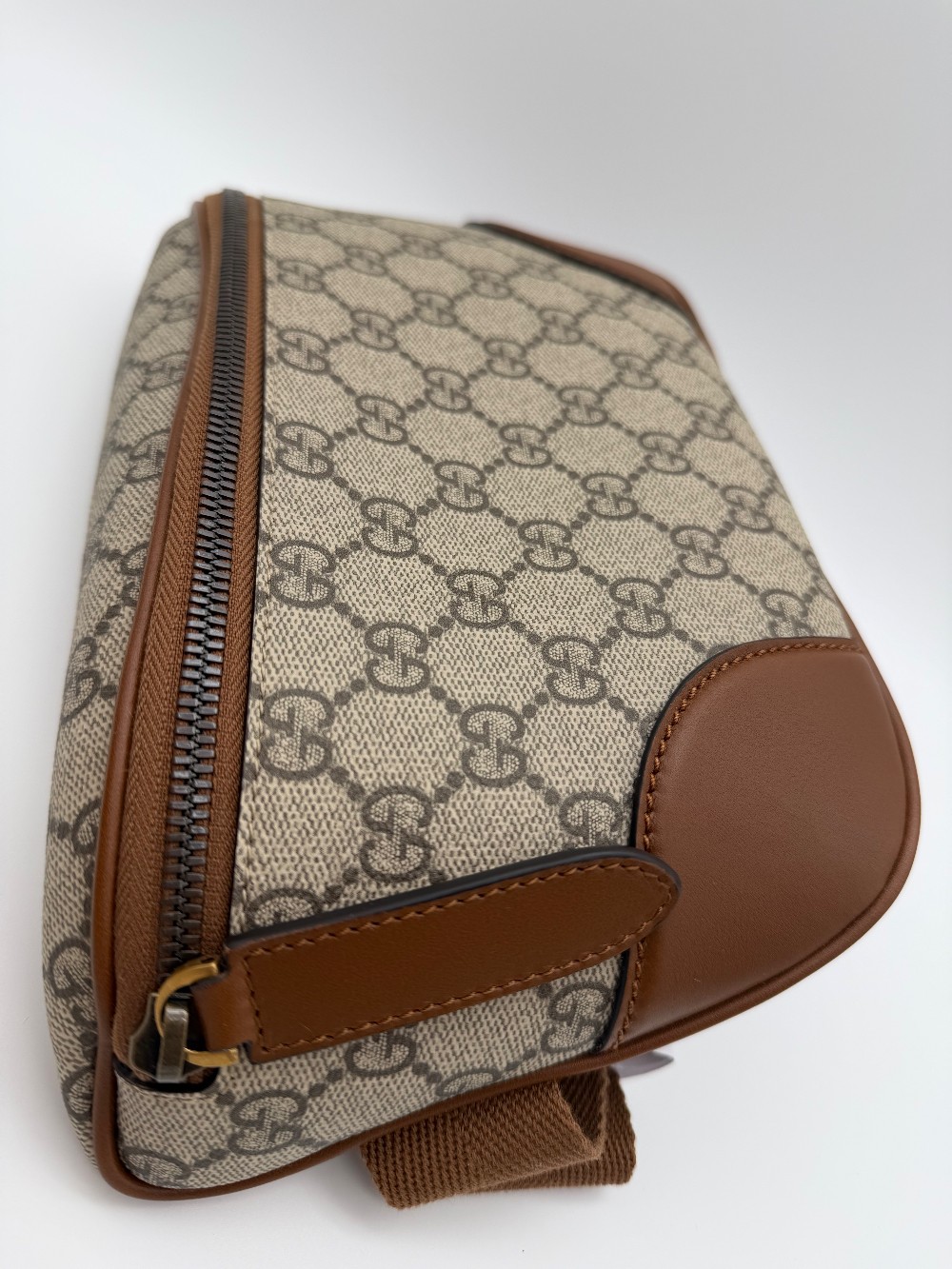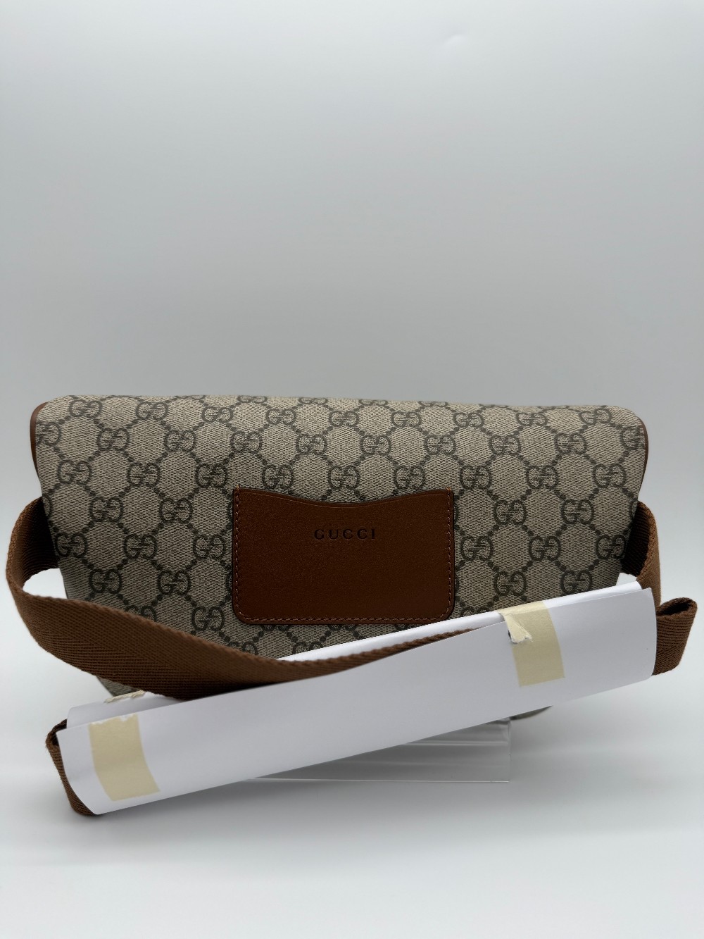 This is an authentic GUCCI GG Supreme Monogram Emblem Calfskin medium Belt Bag in Beige and Dark Brown. This belt bag is crafted of Gucci monogram coated canvas with brown leather trim. It features an adjustable brown canvas belt strap and a rear leather patch pocket. The zipper opens to a natural canvas interior.