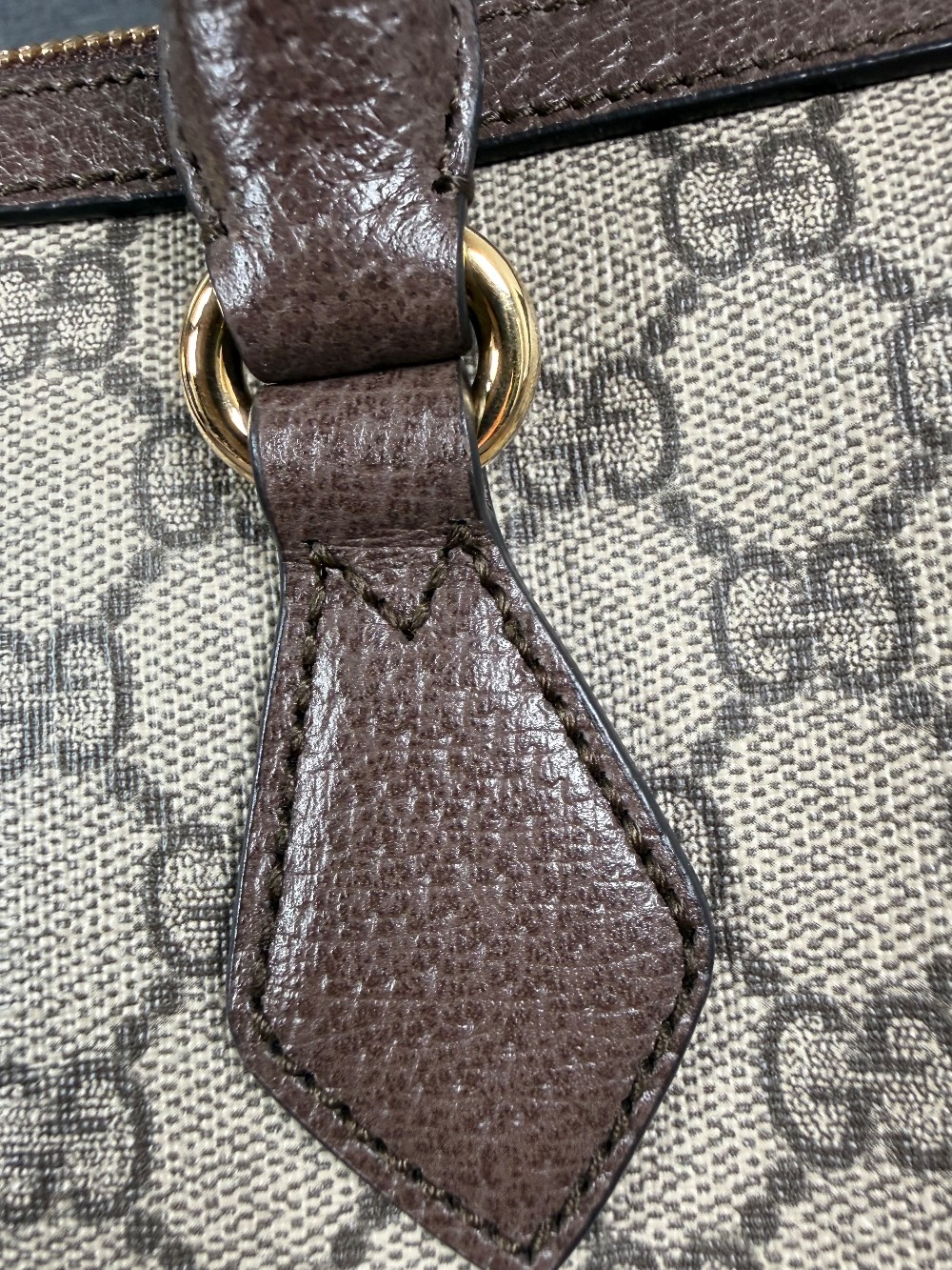 It is crafted from beige and brown GG Supreme coated canvas with brown leather trim.