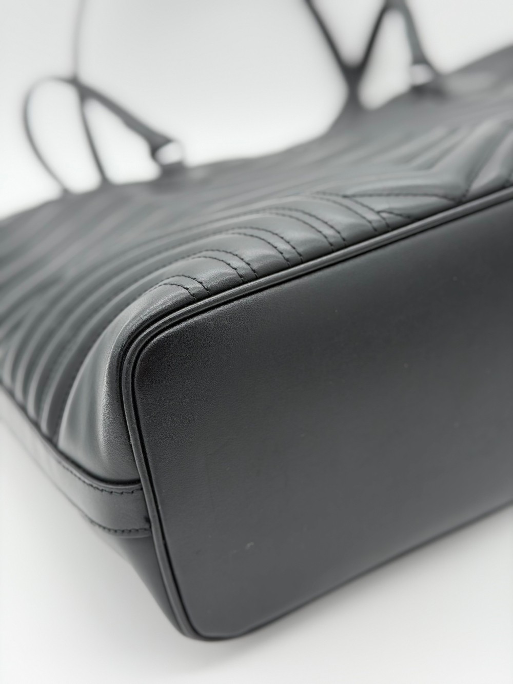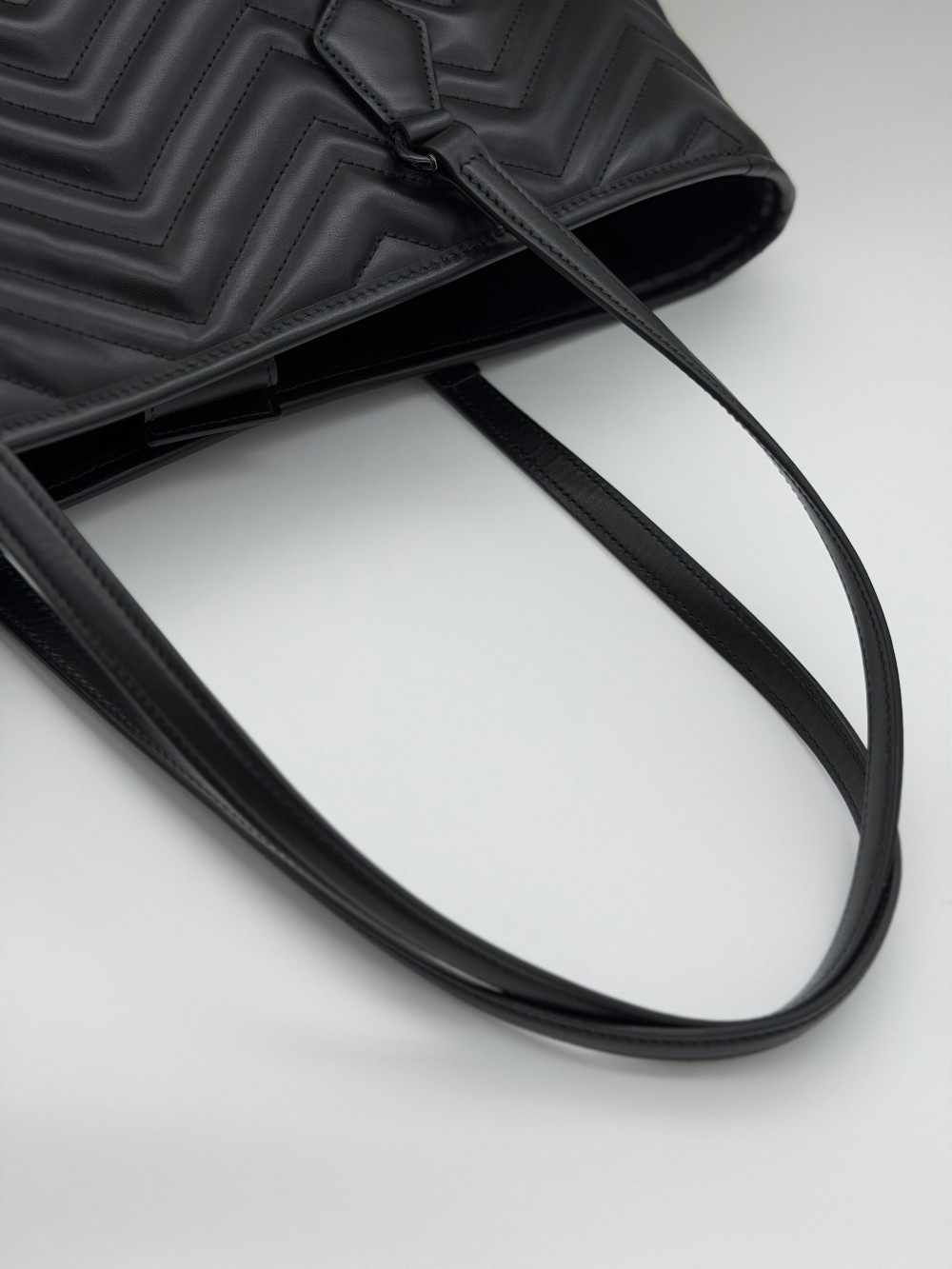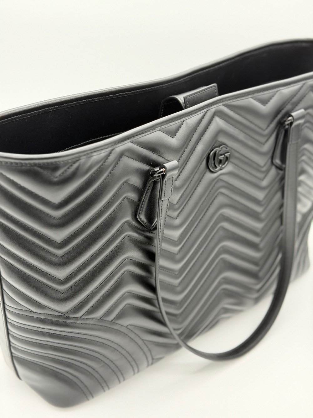 This is an authentic GUCCI Calfskin Matelasse Monochrome Large GG Marmont Tote Bag in Black. This shoulder bag is crafted of calfskin leather with a quilted pattern in black. This bag features top handles and a black GG logo on the front. The top opens to a black canvas interior with pockets.