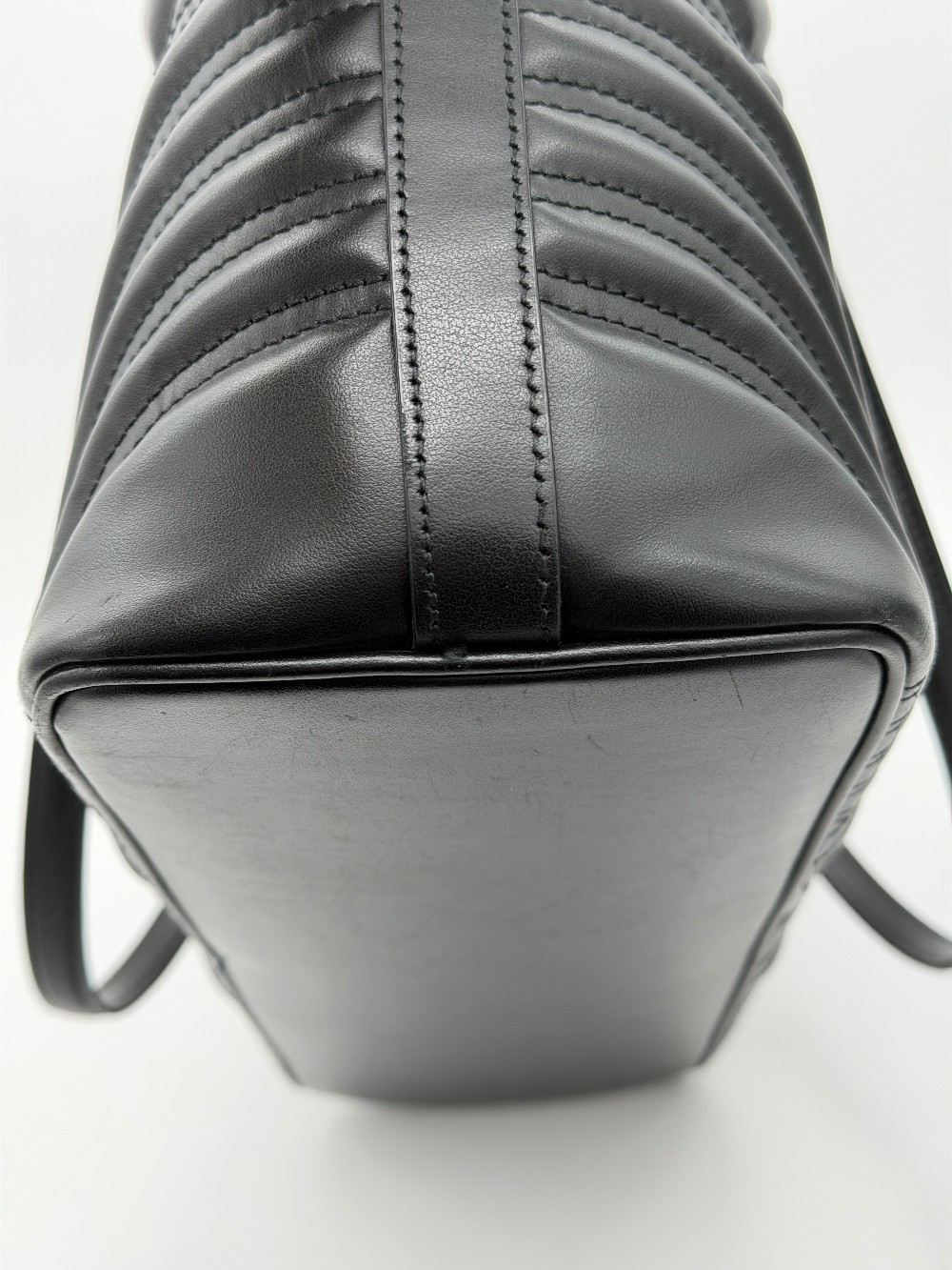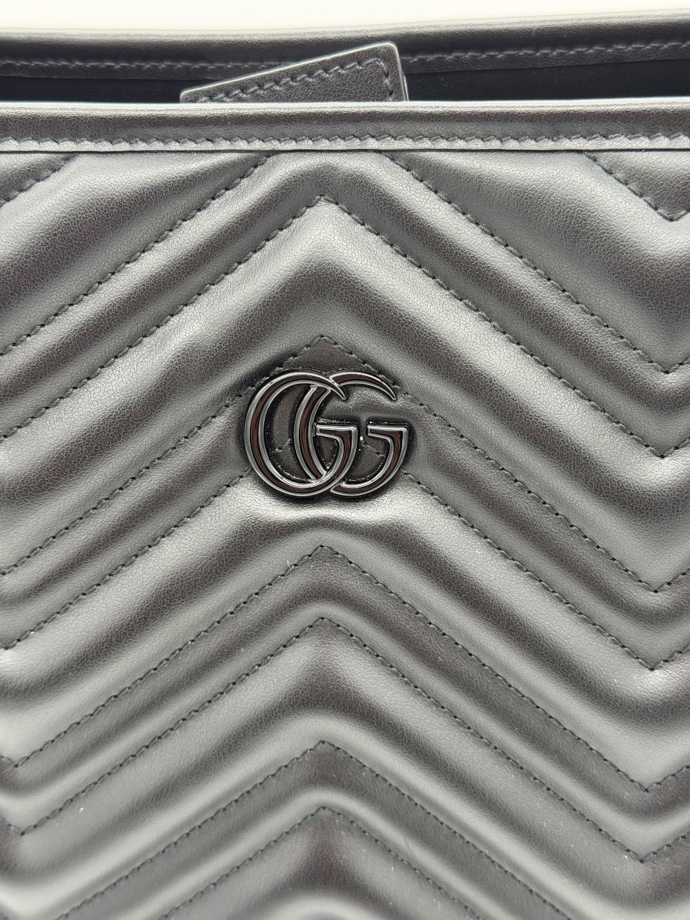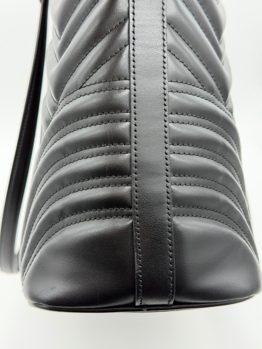 This is an authentic GUCCI Calfskin Matelasse Monochrome Large GG Marmont Tote Bag in Black. This shoulder bag is crafted of calfskin leather with a quilted pattern in black. This bag features top handles and a black GG logo on the front. The top opens to a black canvas interior with pockets.