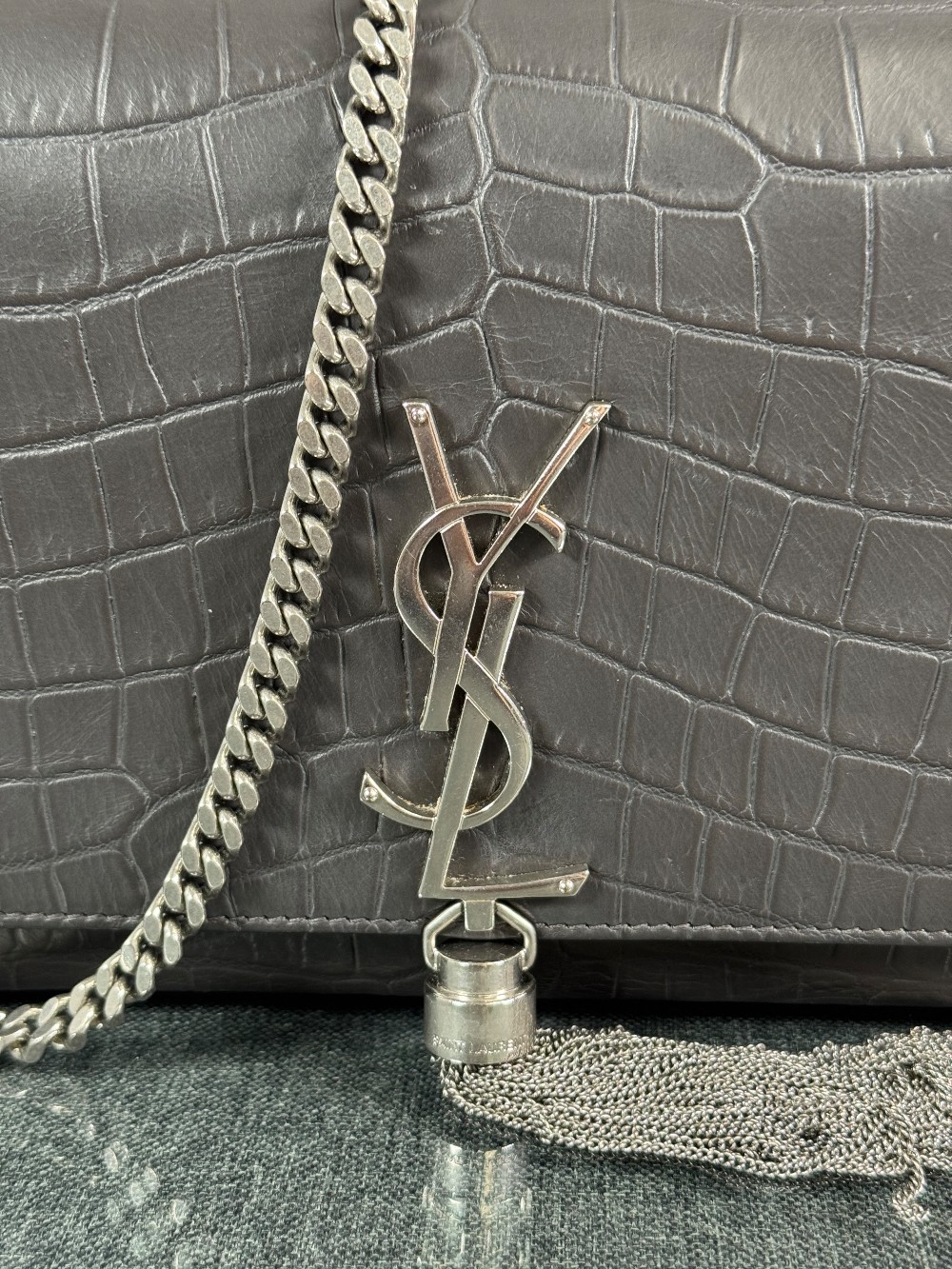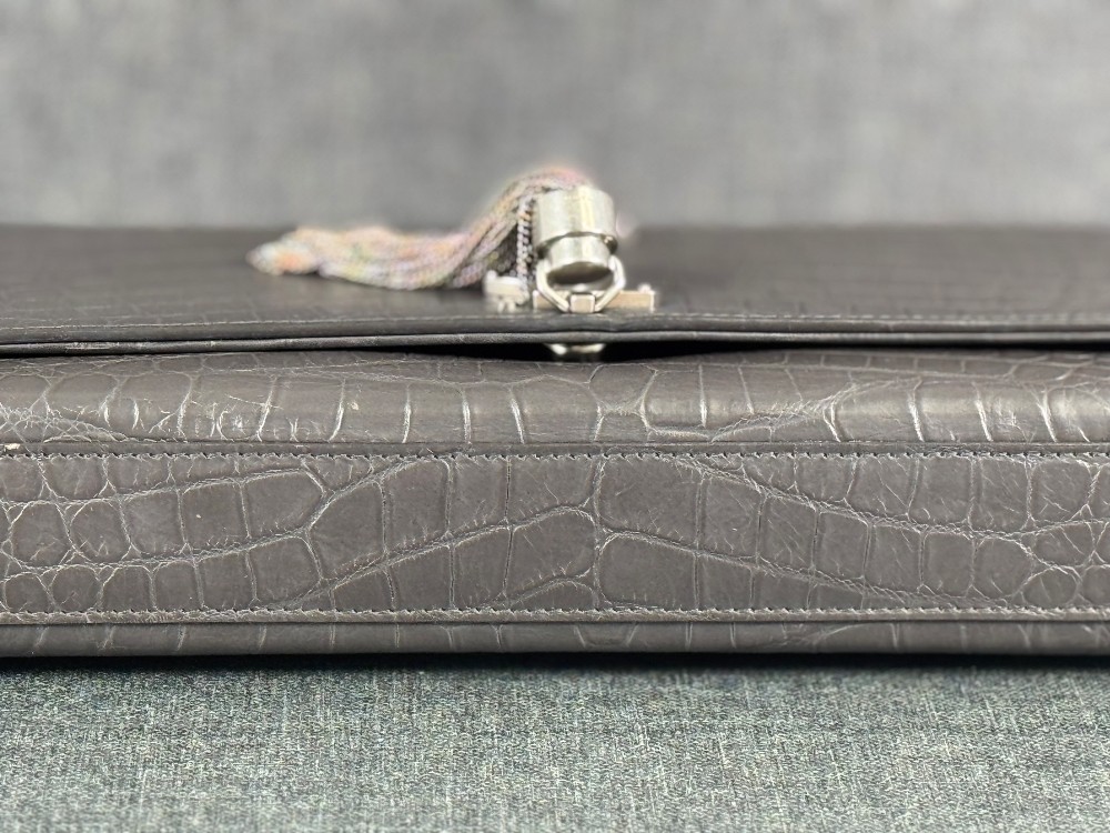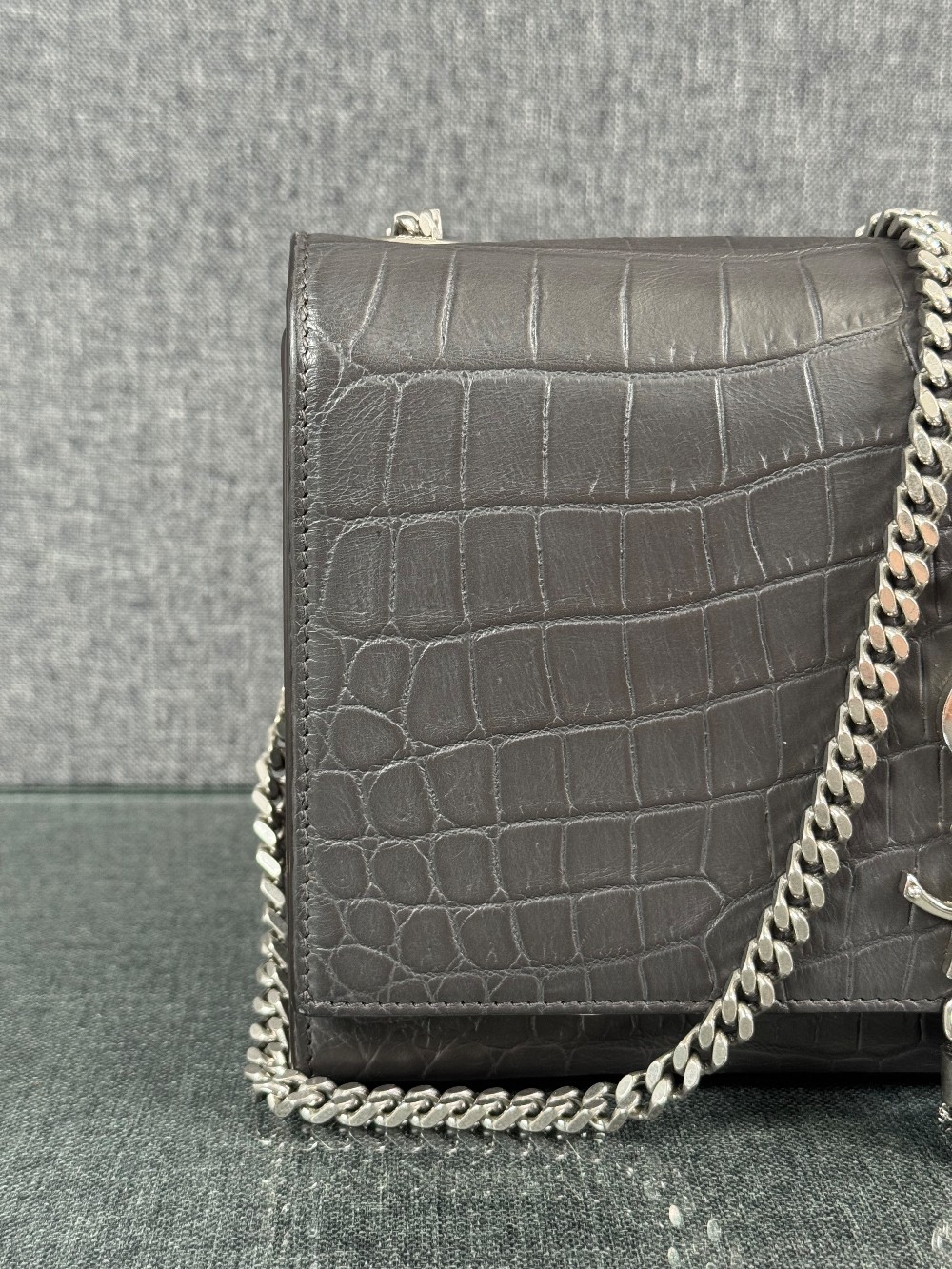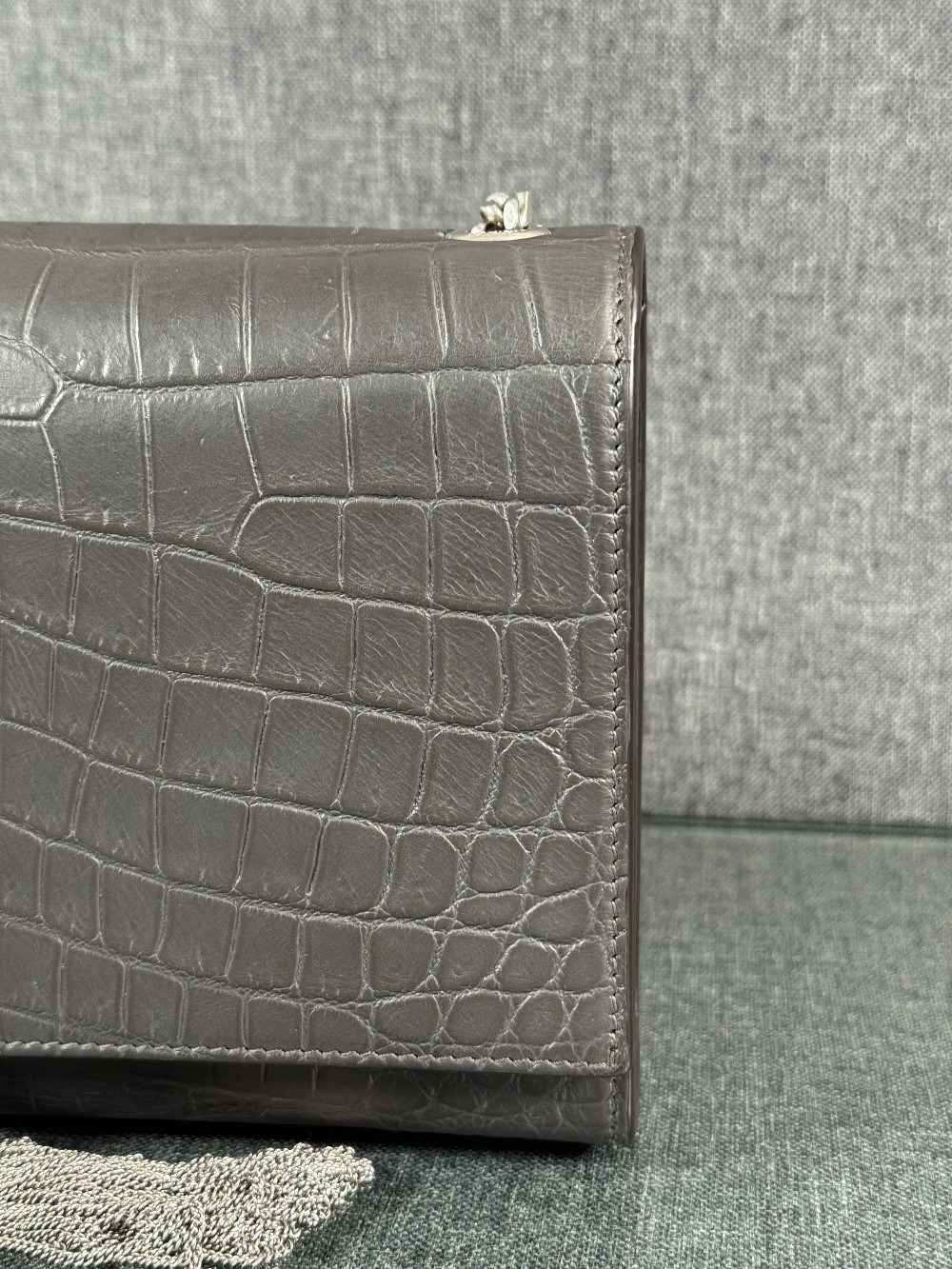 This is an authentic SAINT LAURENT Calfskin Crocodile Embossed Medium Classic Monogram Kate Tassel Satchel in Dark Grey. The bag features a polished silver chain link crossbody shoulder strap and a facing flap with a polished silver YSL logo and a gold knobbed miniature silver chain tassel. The flap opens to a black fabric interior with a patch pocket.