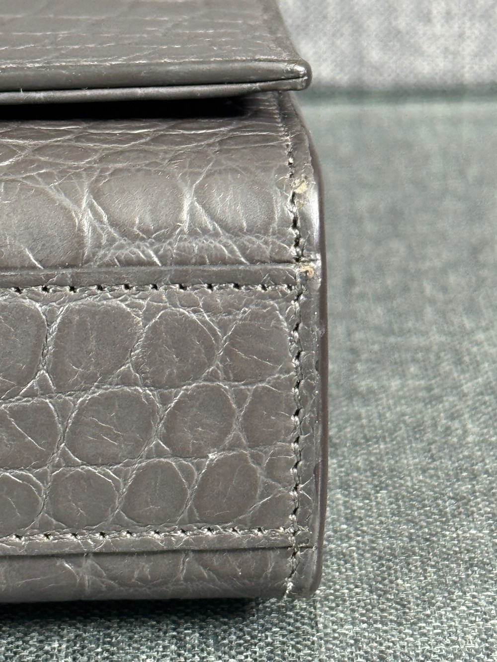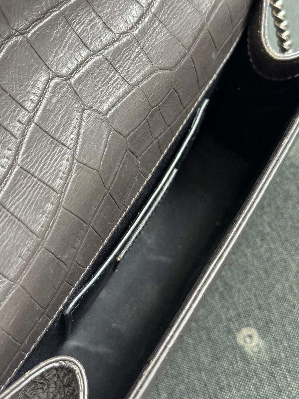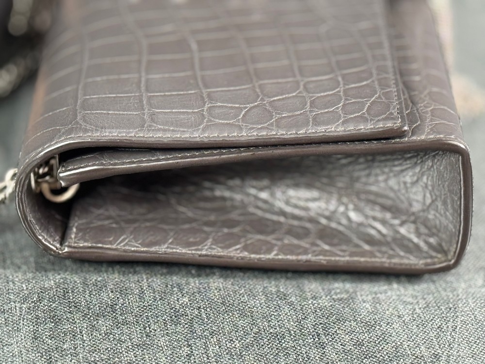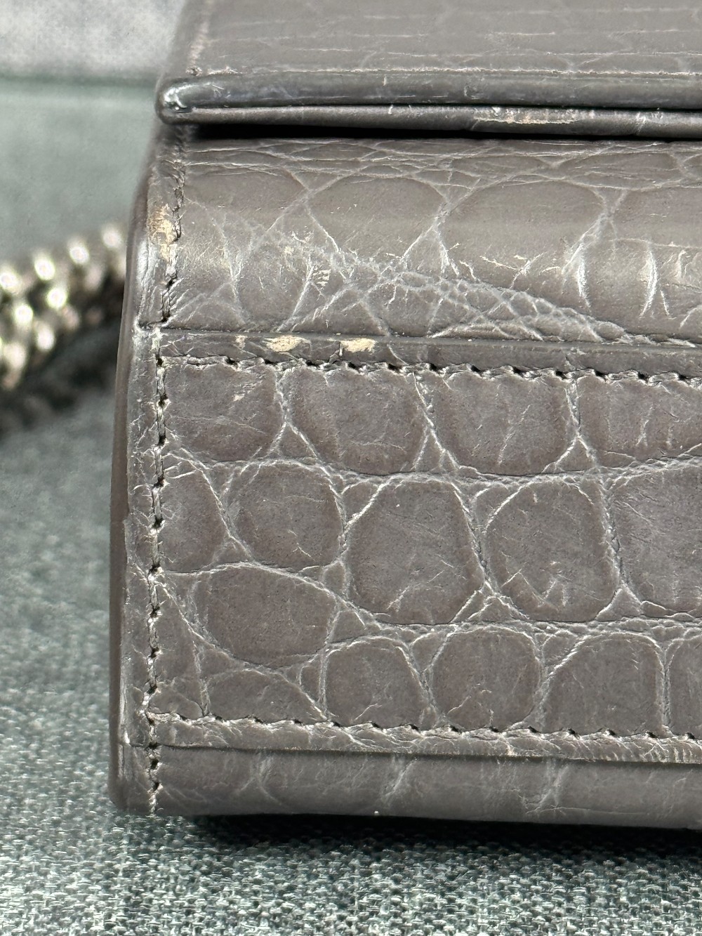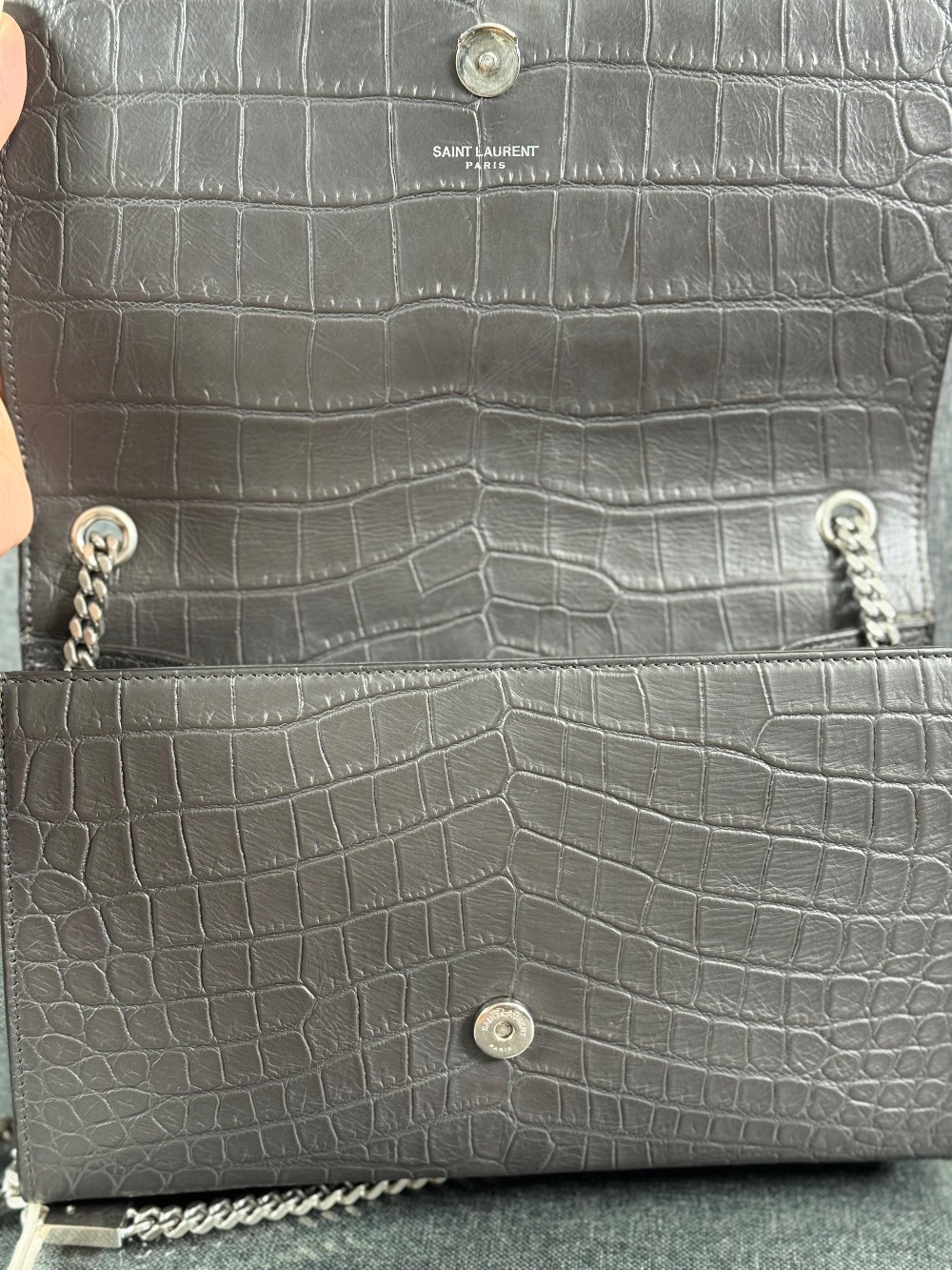 This is an authentic SAINT LAURENT Calfskin Crocodile Embossed Medium Classic Monogram Kate Tassel Satchel in Dark Grey. The bag features a polished silver chain link crossbody shoulder strap and a facing flap with a polished silver YSL logo and a gold knobbed miniature silver chain tassel. The flap opens to a black fabric interior with a patch pocket.
