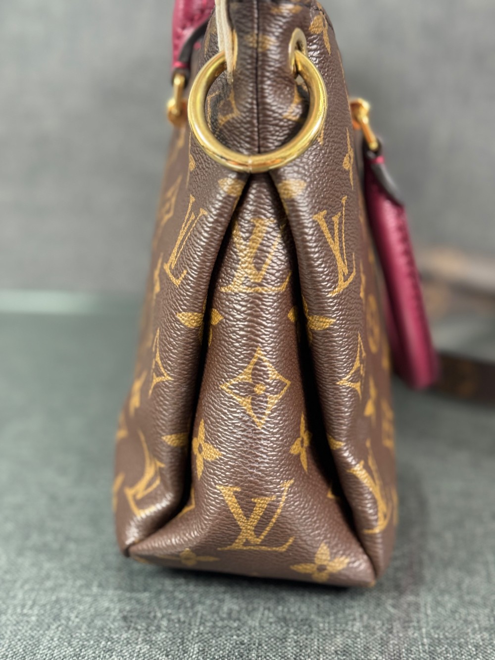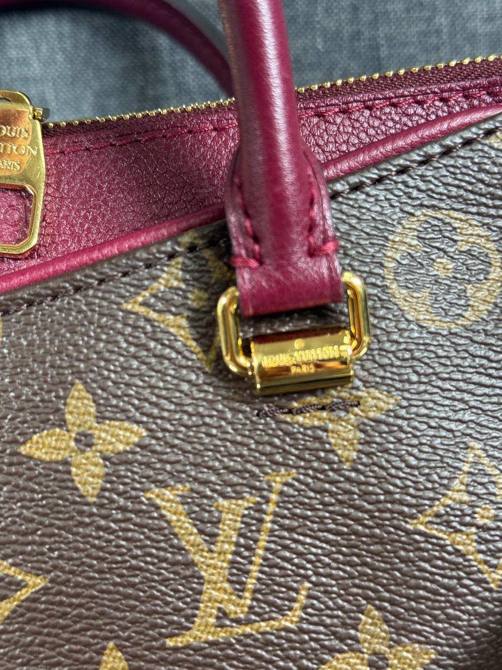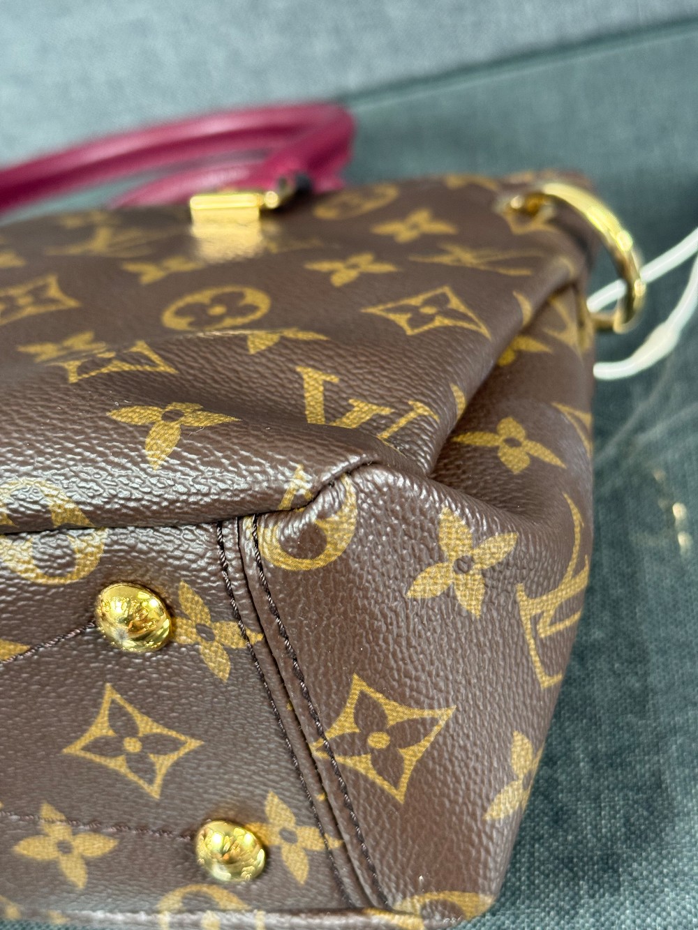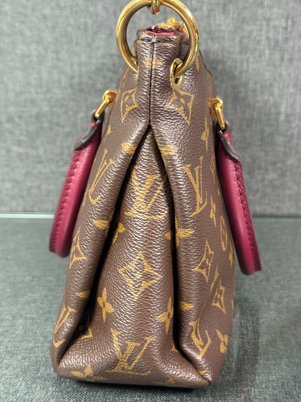 This is an authentic LOUIS VUITTON Monogram Pallas Full BB in Raisin. This petite tote is finely crafted of traditional Louis Vuitton monogram on toile coated canvas, accented by a plum leather peeping top crest. The bag features rolled leather top handles with polished brass links, an optional monogram canvas shoulder strap, and two side compartments for extra storage. The top zipper opens the bag to a plum microfiber interior with a patch pocket.