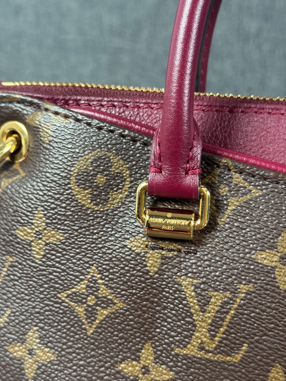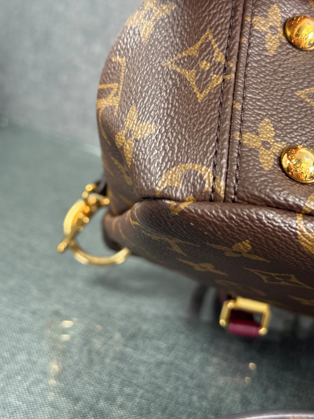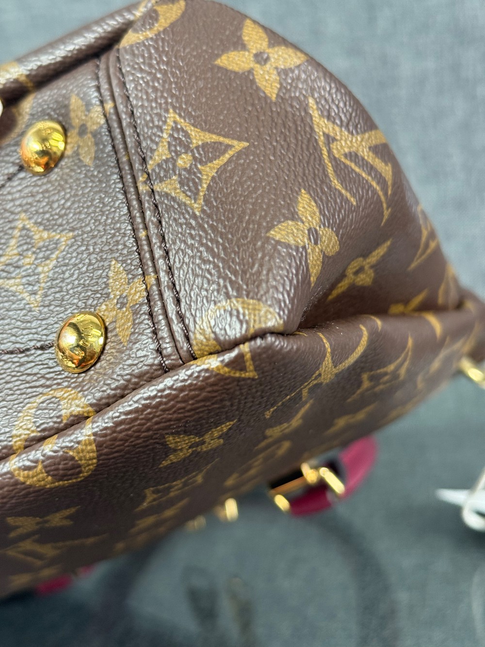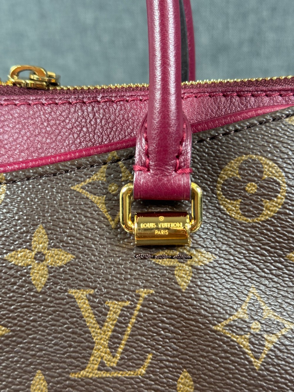This is an authentic LOUIS VUITTON Monogram Pallas Full BB in Raisin. This petite tote is finely crafted of traditional Louis Vuitton monogram on toile coated canvas, accented by a plum leather peeping top crest. The bag features rolled leather top handles with polished brass links, an optional monogram canvas shoulder strap, and two side compartments for extra storage. The top zipper opens the bag to a plum microfiber interior with a patch pocket.