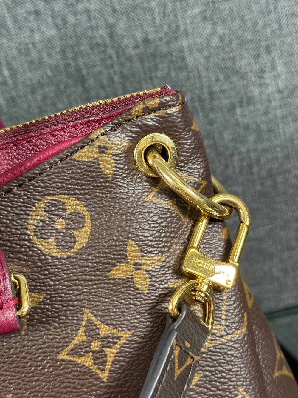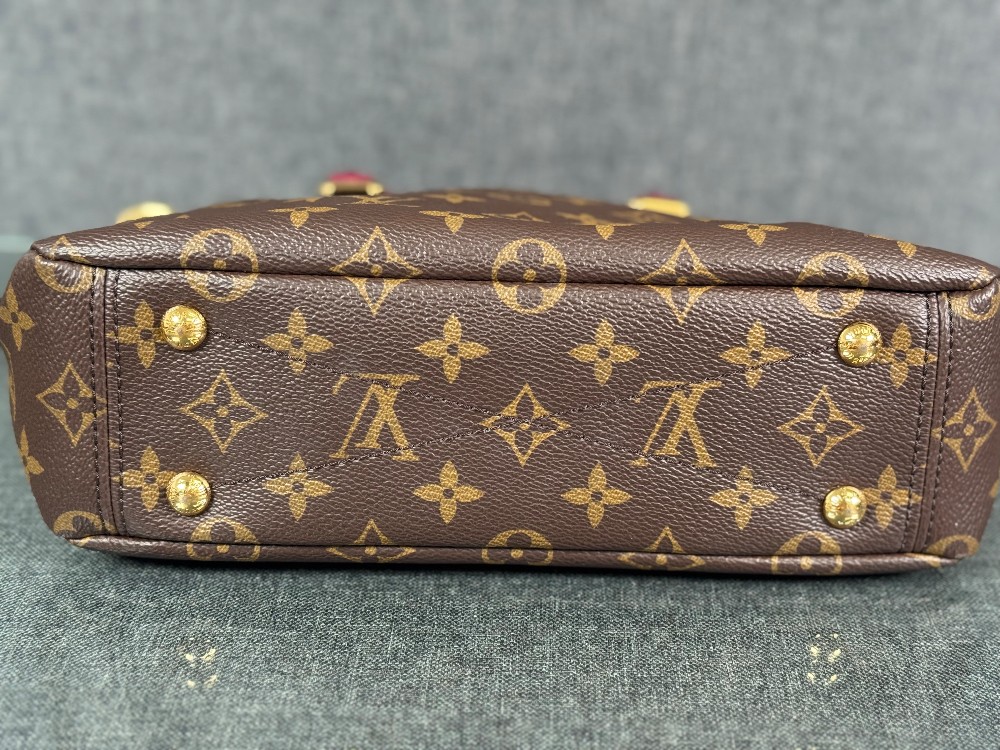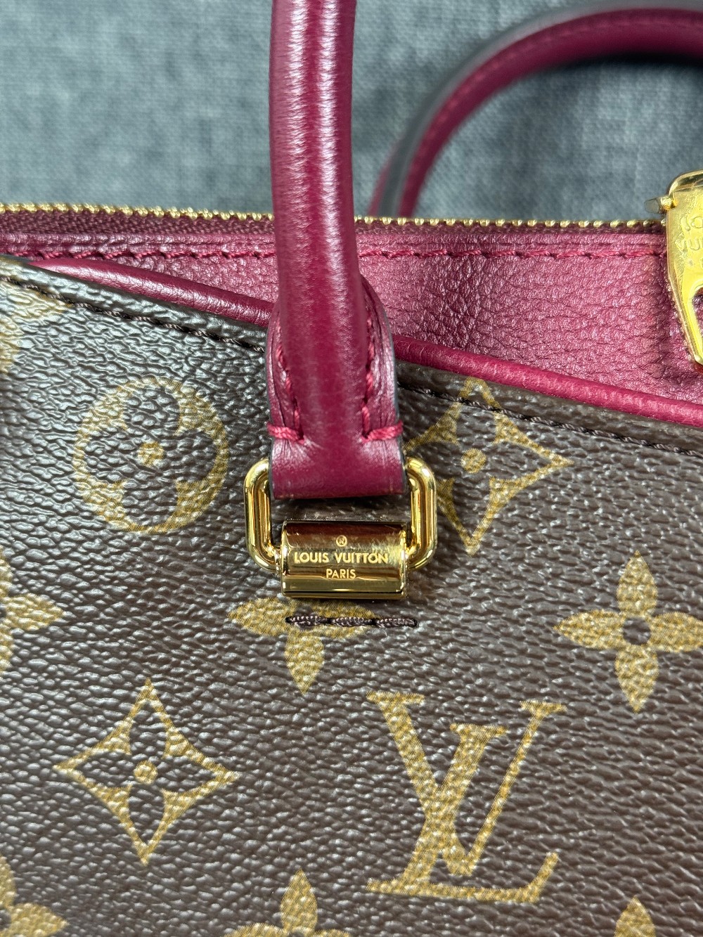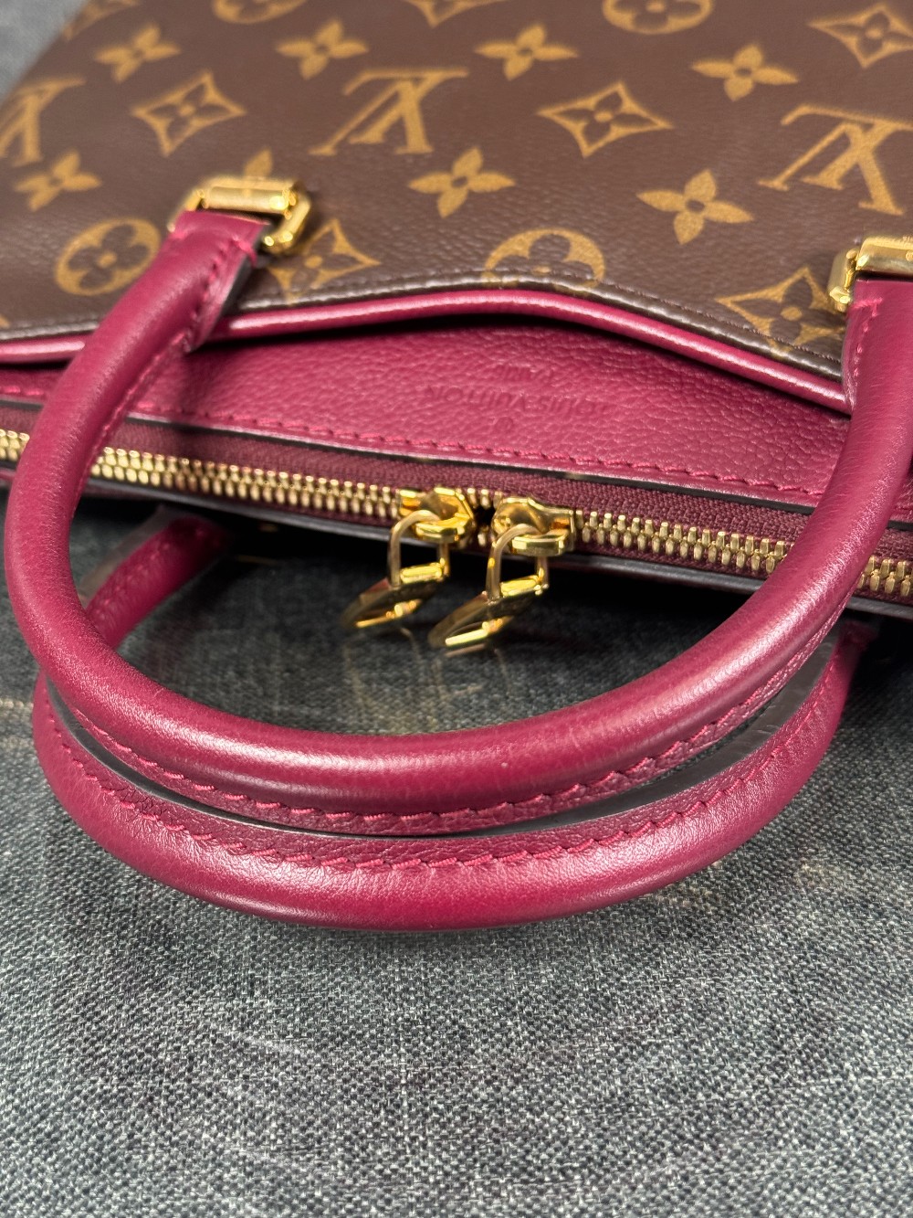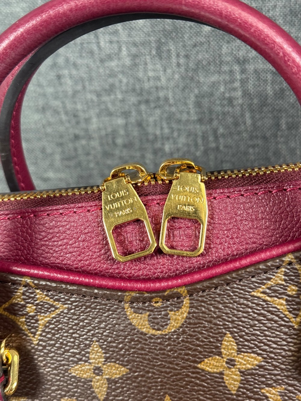 This is an authentic LOUIS VUITTON Monogram Pallas Full BB in Raisin. This petite tote is finely crafted of traditional Louis Vuitton monogram on toile coated canvas, accented by a plum leather peeping top crest. The bag features rolled leather top handles with polished brass links, an optional monogram canvas shoulder strap, and two side compartments for extra storage. The top zipper opens the bag to a plum microfiber interior with a patch pocket.