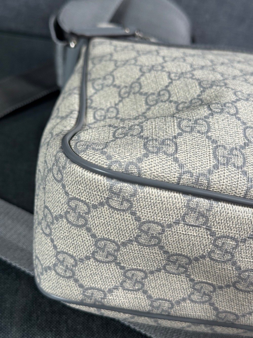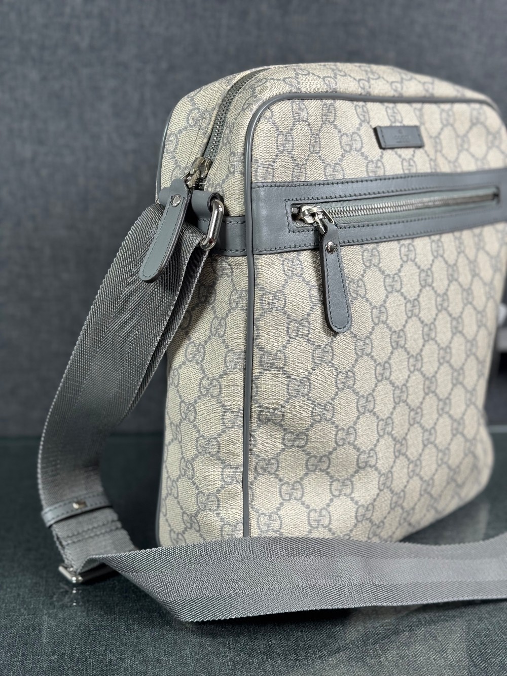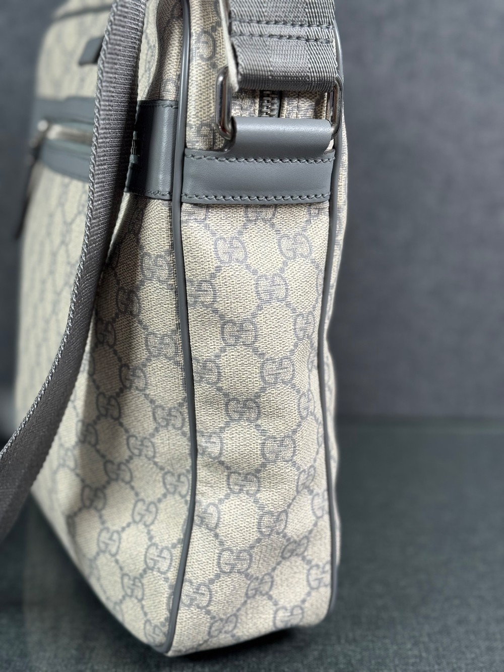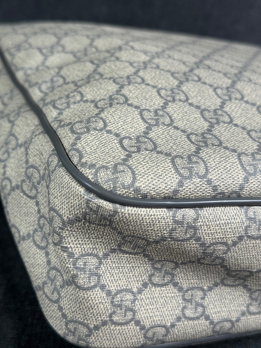 This is an authentic GUCCI GG Plus Monogram Medium Messenger Bag in Grey. This chic messenger bag is crafted of Gucci GG monogram coated canvas in beige and grey. It features an adjustable cross-body fabric shoulder strap, front zipper pocket, and leather trim. This opens to a fabric interior with a patch pocket. This bag is ideal for everyday utility with the sophisticated style of Gucci!
