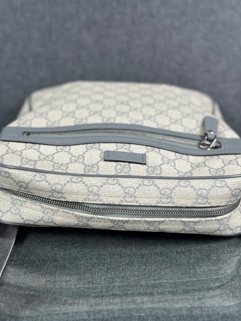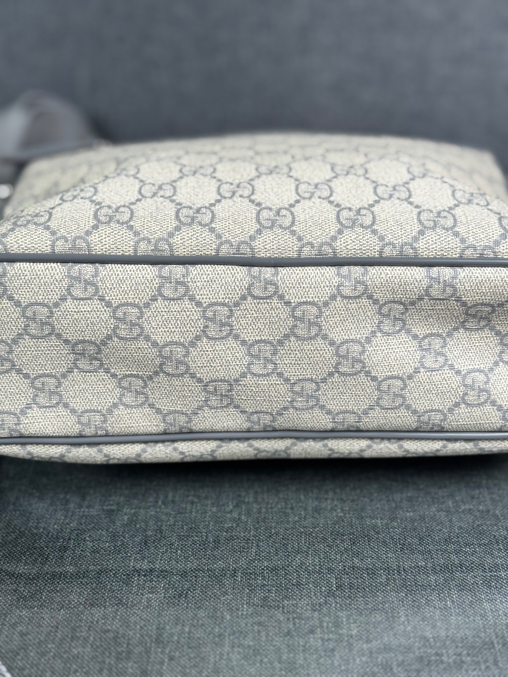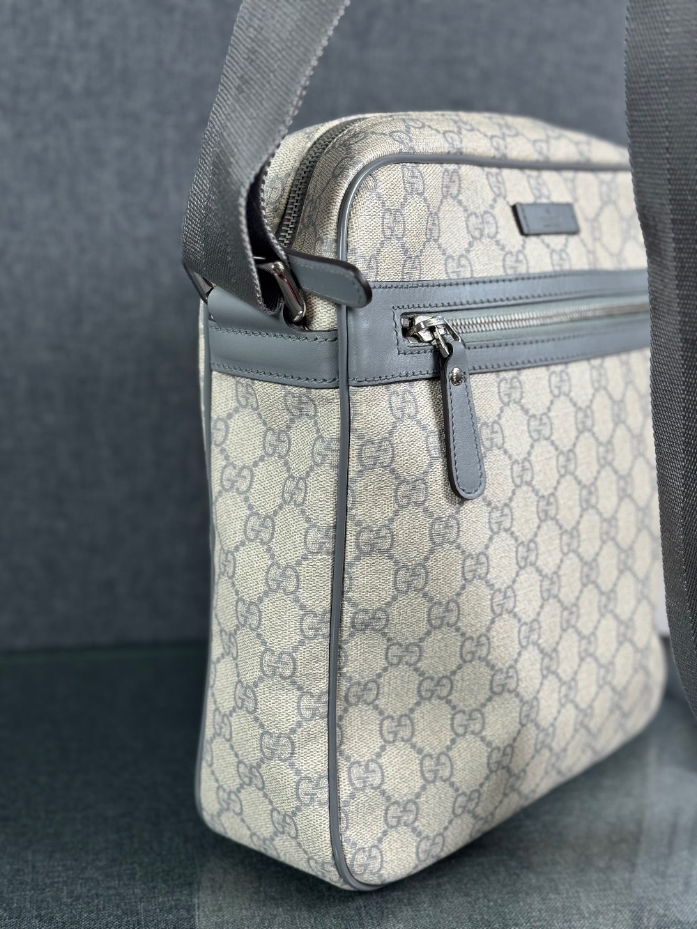This is an authentic GUCCI GG Plus Monogram Medium Messenger Bag in Grey. This chic messenger bag is crafted of Gucci GG monogram coated canvas in beige and grey. It features an adjustable cross-body fabric shoulder strap, front zipper pocket, and leather trim. This opens to a fabric interior with a patch pocket. This bag is ideal for everyday utility with the sophisticated style of Gucci!