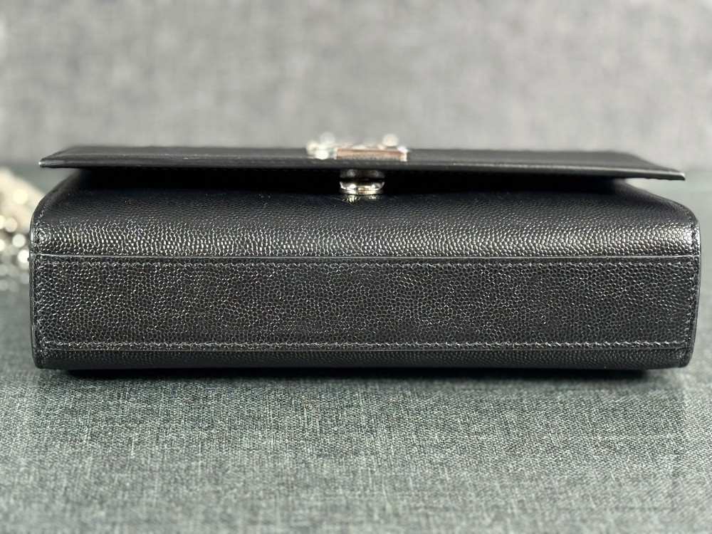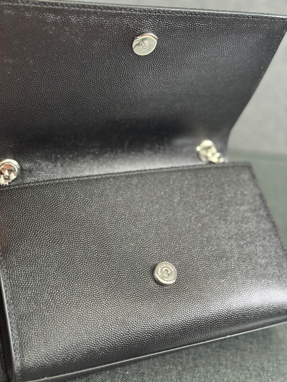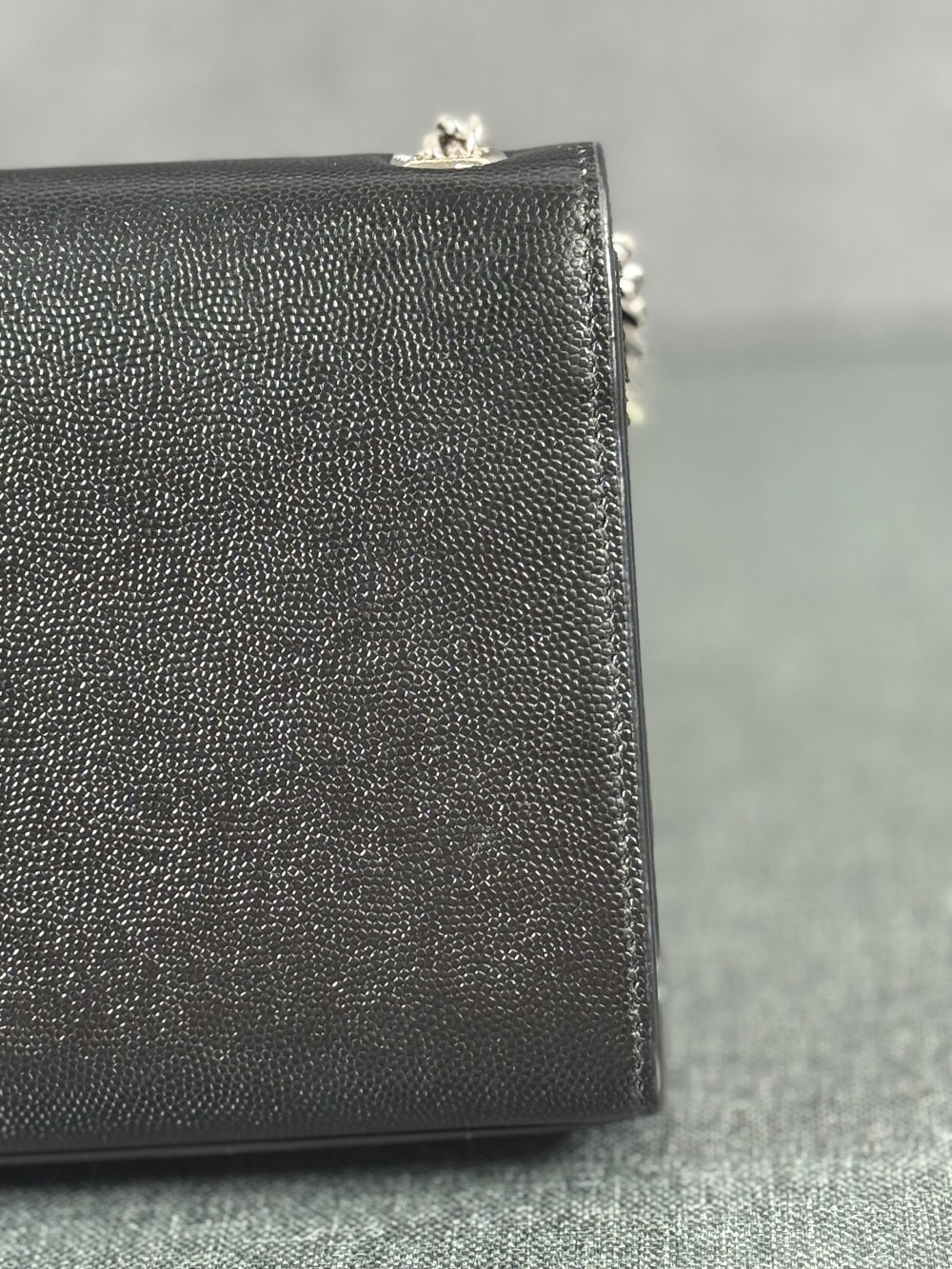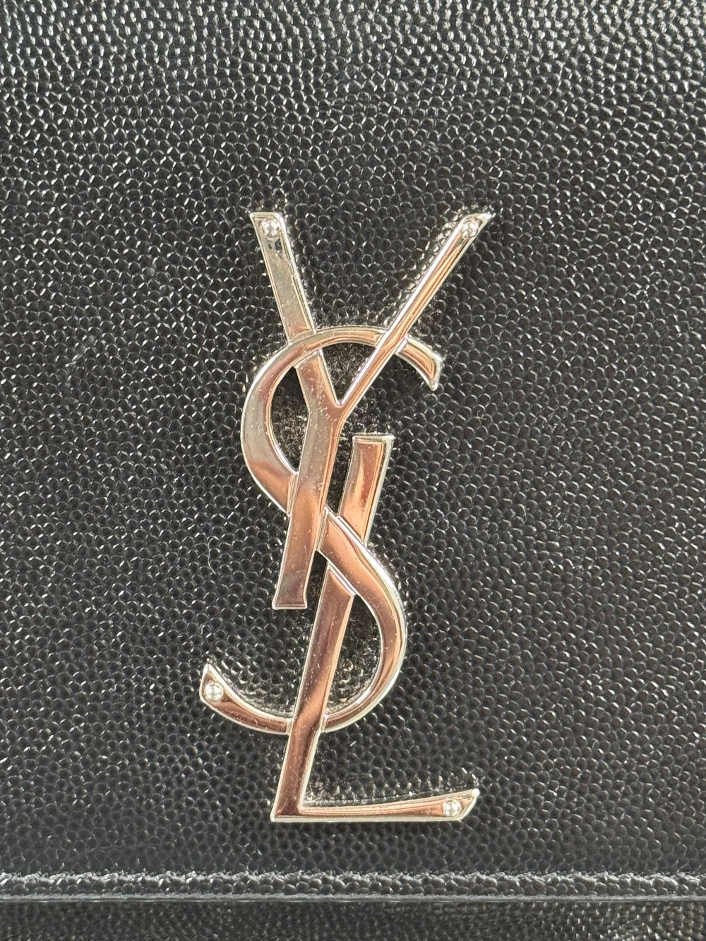 This is an authentic SAINT LAURENT Grain De Poudre Small Classic Monogram Kate Satchel in Black. This stylish shoulder bag is crafted of finely textured calfskin leather in black. The bag features a silver chain-link shoulder strap and a matching YSL logo on the front. The crossover flap opens to a black fabric interior with a patch pocket.