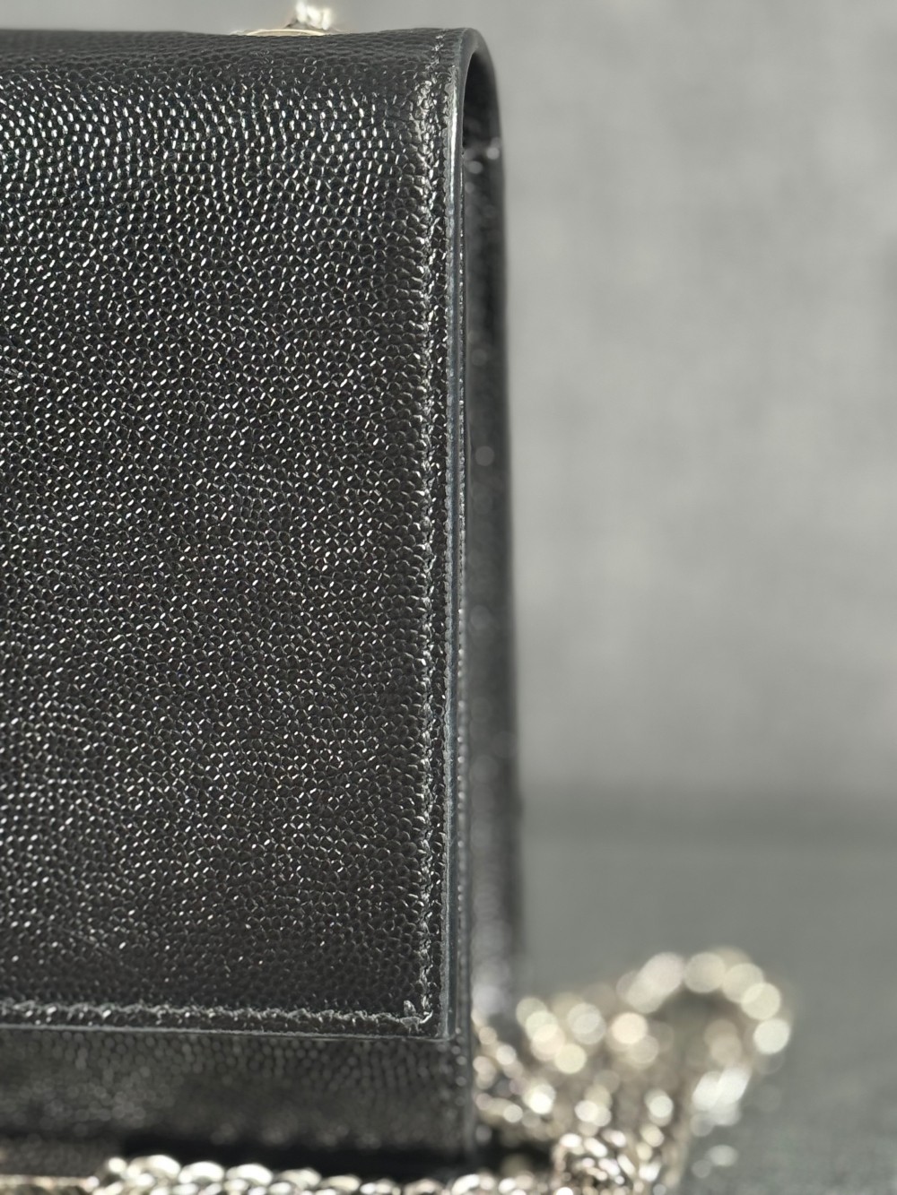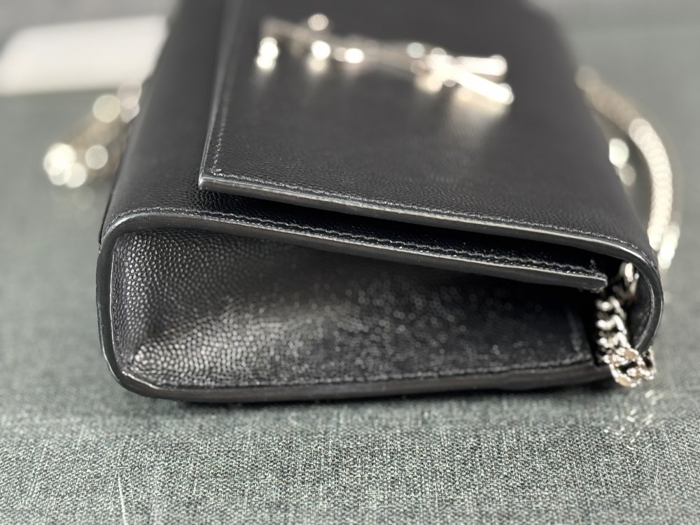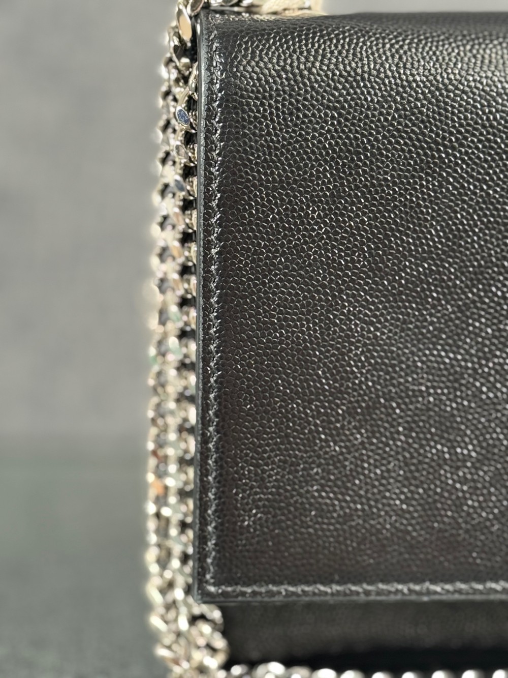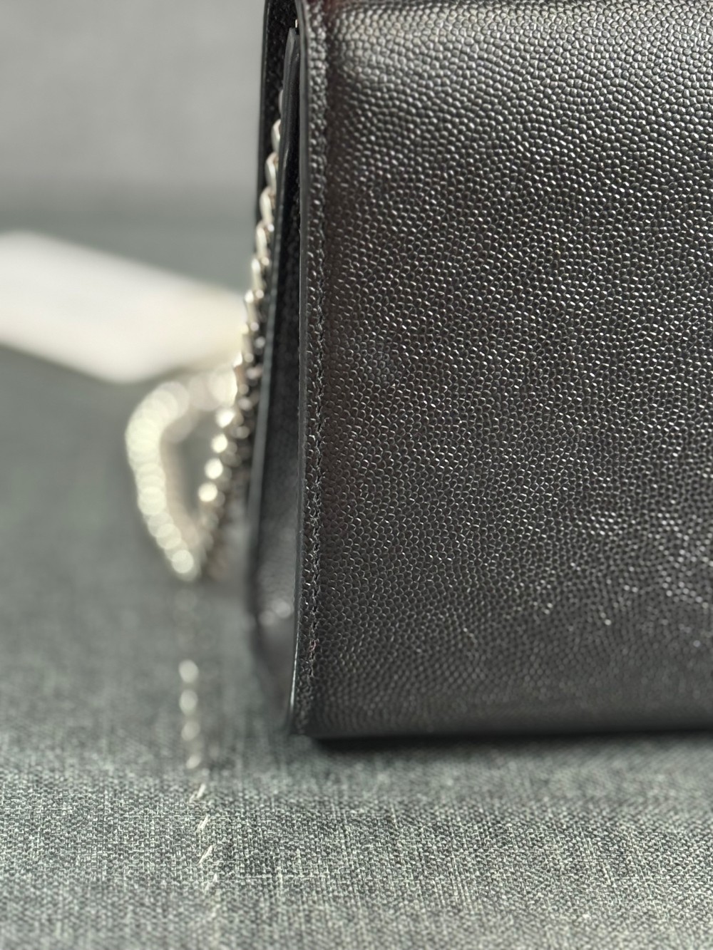 This is an authentic SAINT LAURENT Grain De Poudre Small Classic Monogram Kate Satchel in Black. This stylish shoulder bag is crafted of finely textured calfskin leather in black. The bag features a silver chain-link shoulder strap and a matching YSL logo on the front. The crossover flap opens to a black fabric interior with a patch pocket.
