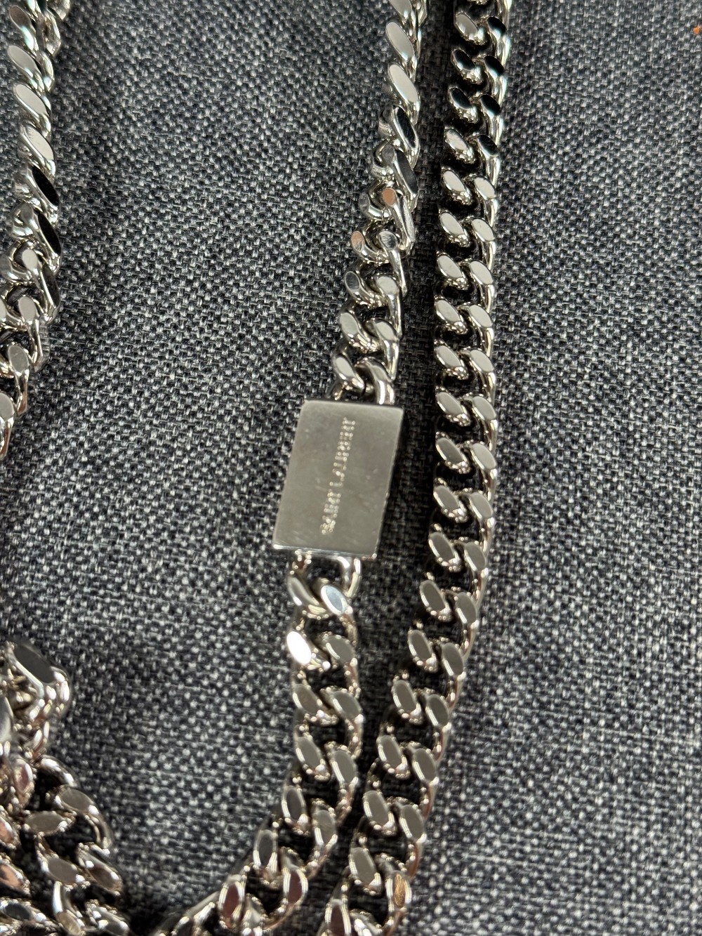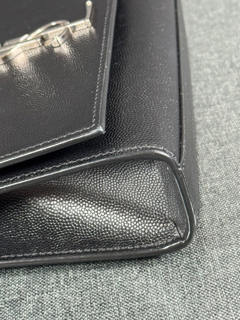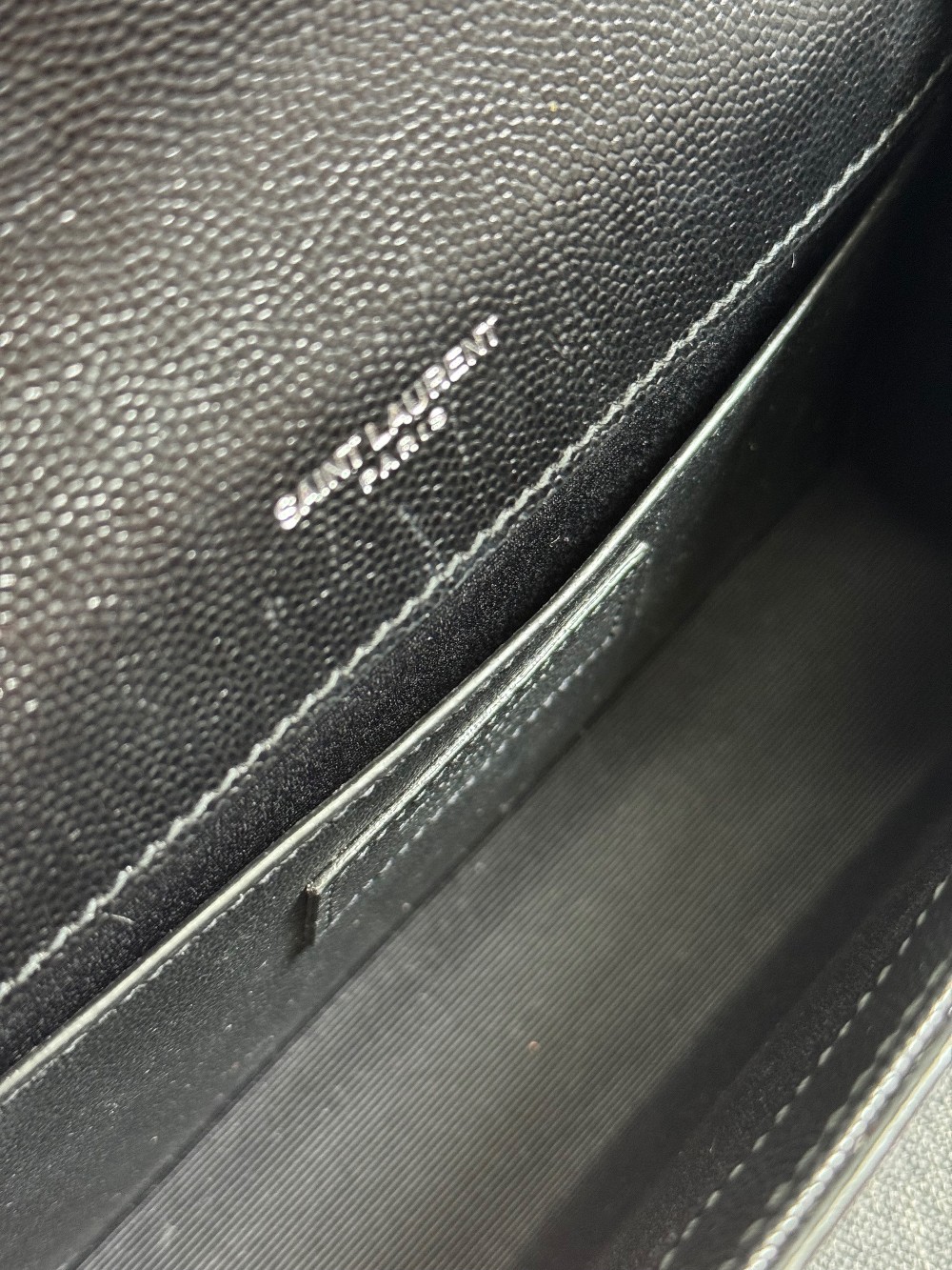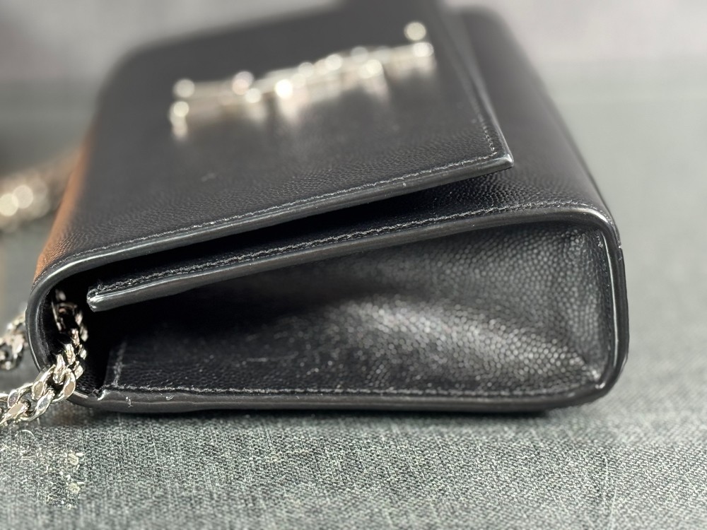 This is an authentic SAINT LAURENT Grain De Poudre Small Classic Monogram Kate Satchel in Black. This stylish shoulder bag is crafted of finely textured calfskin leather in black. The bag features a silver chain-link shoulder strap and a matching YSL logo on the front. The crossover flap opens to a black fabric interior with a patch pocket.