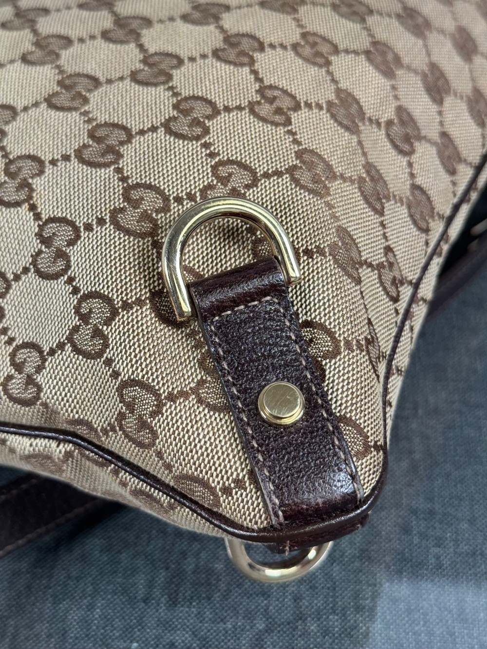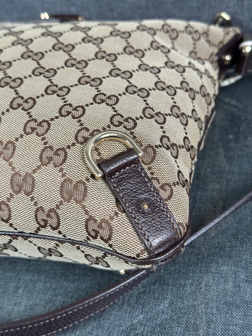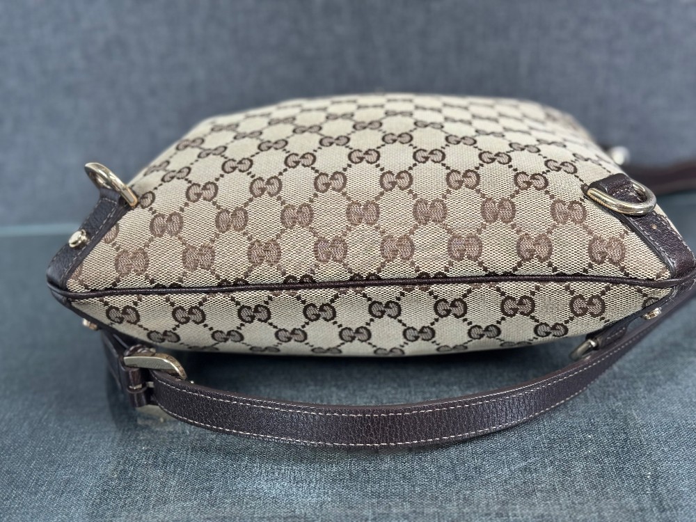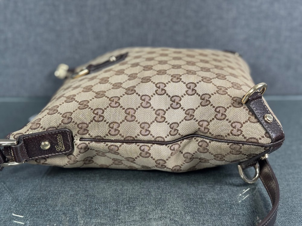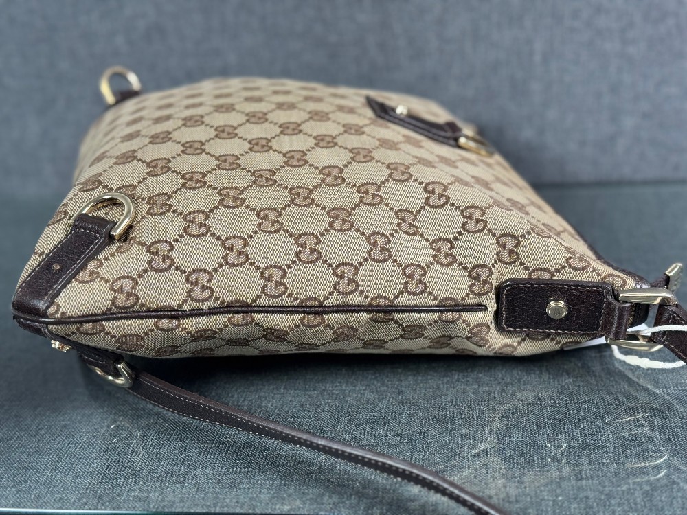 This is an authentic GUCCI Monogram Abbey Messenger Bag in Brown. This stylish cross-body bag is crafted of green Gucci GG monogram canvas. It features leather trim including a leather cross-body strap, and silver hardware including links and loops. The top is open to a spacious black fabric interior.