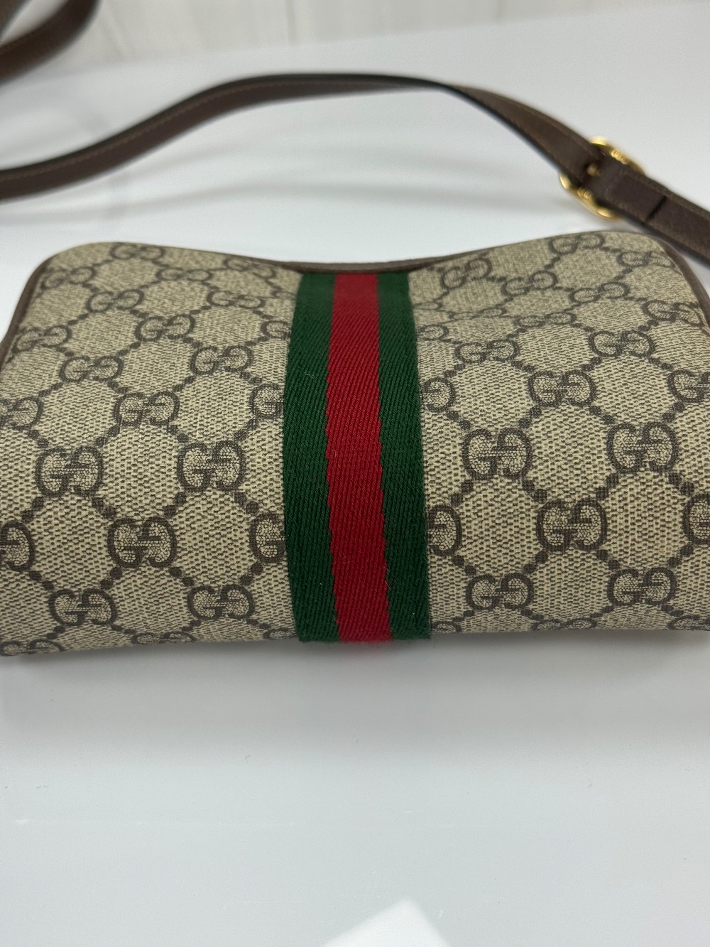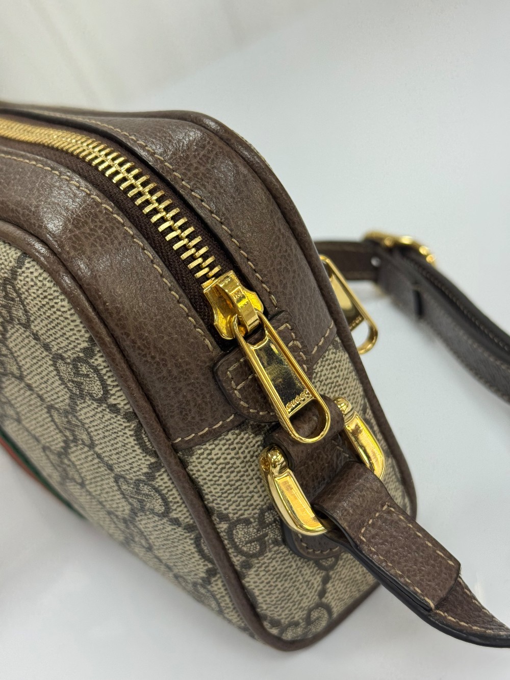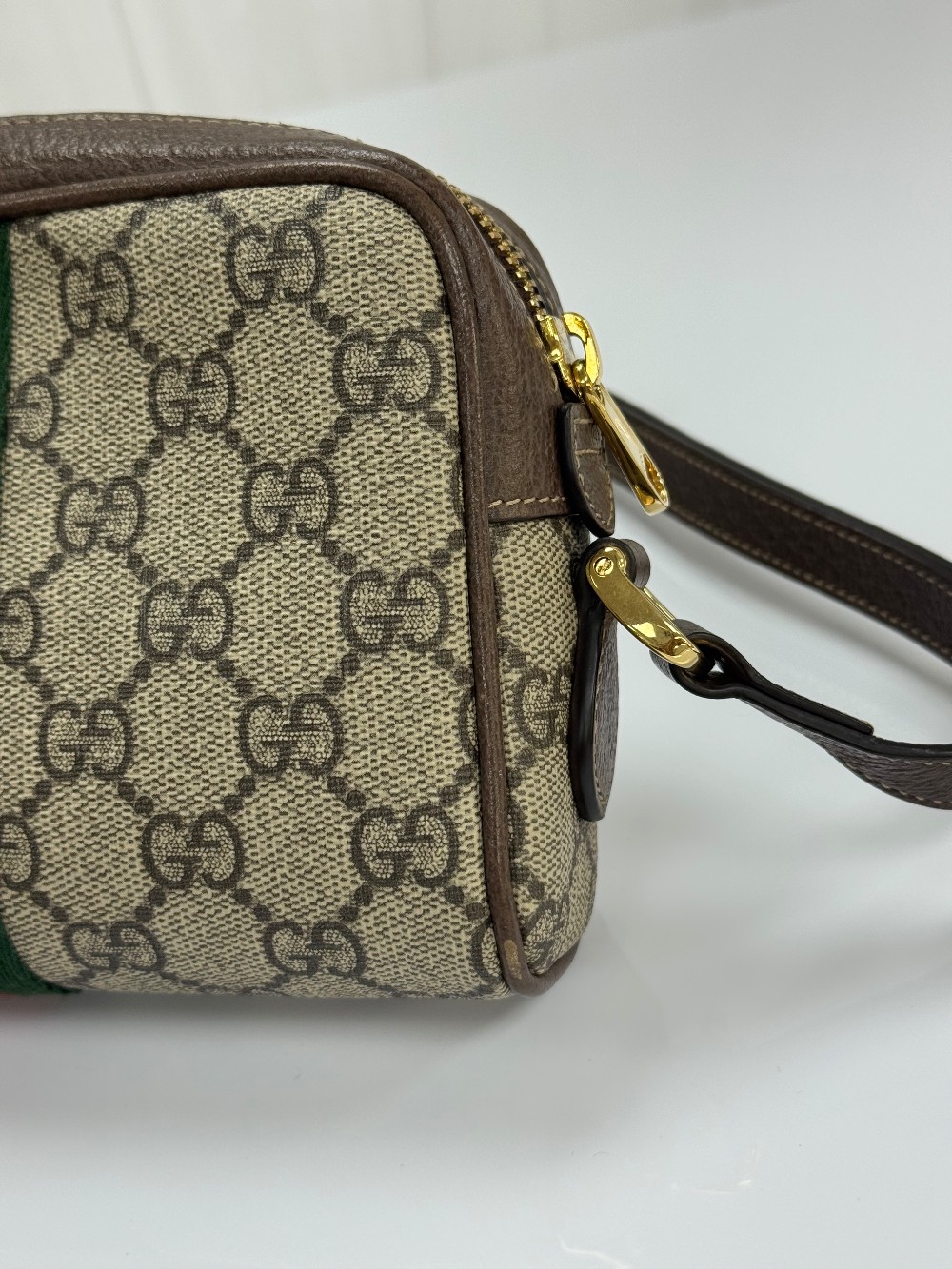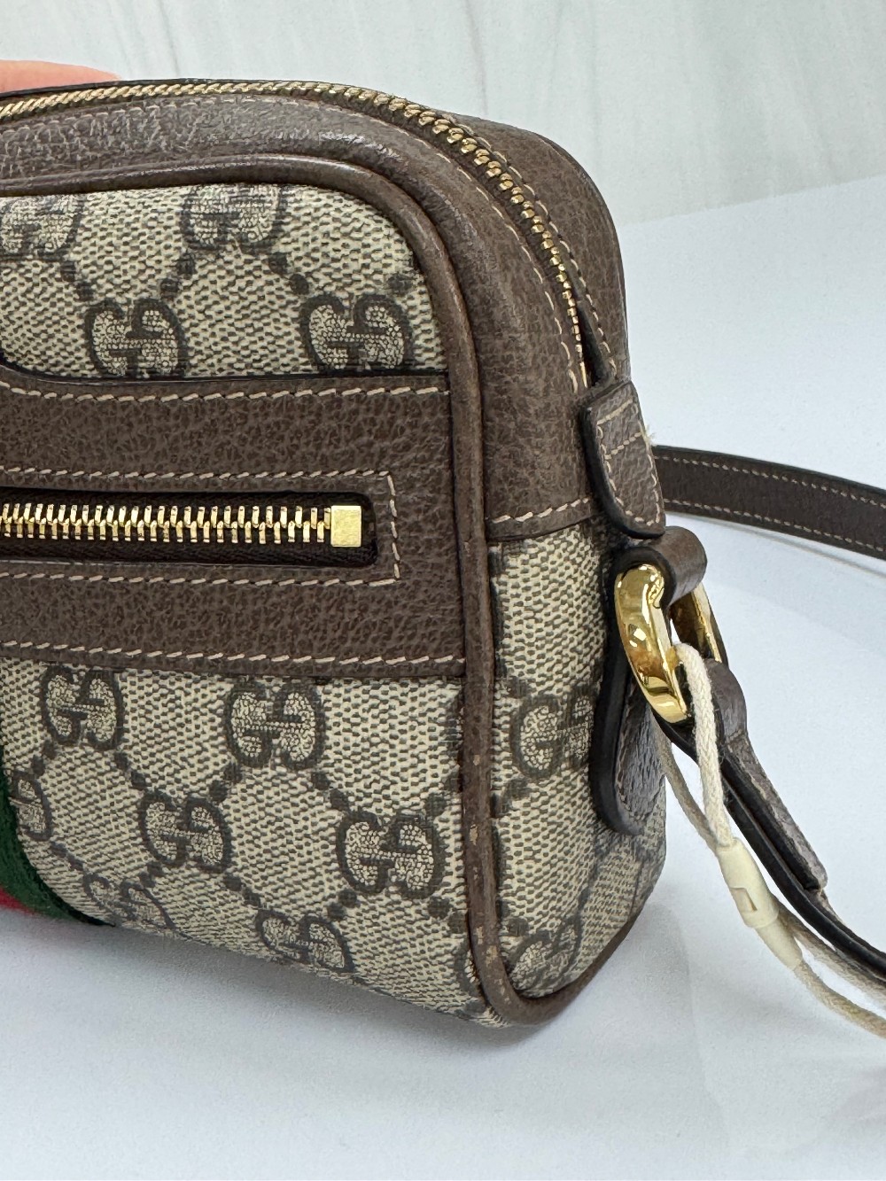 This is an authentic GUCCI GG Supreme Monogram Web Mini Ophidia Shoulder Bag in Brown. This camera-style crossbody bag is crafted of Gucci GG supreme monogram-coated canvas, with brown leather trim. The bag features a front zipper pocket with the signature green and red web stripe design and an adjustable shoulder strap with polished gold hardware. The top zipper opens to a soft beige microfiber interior with a patch pocket.