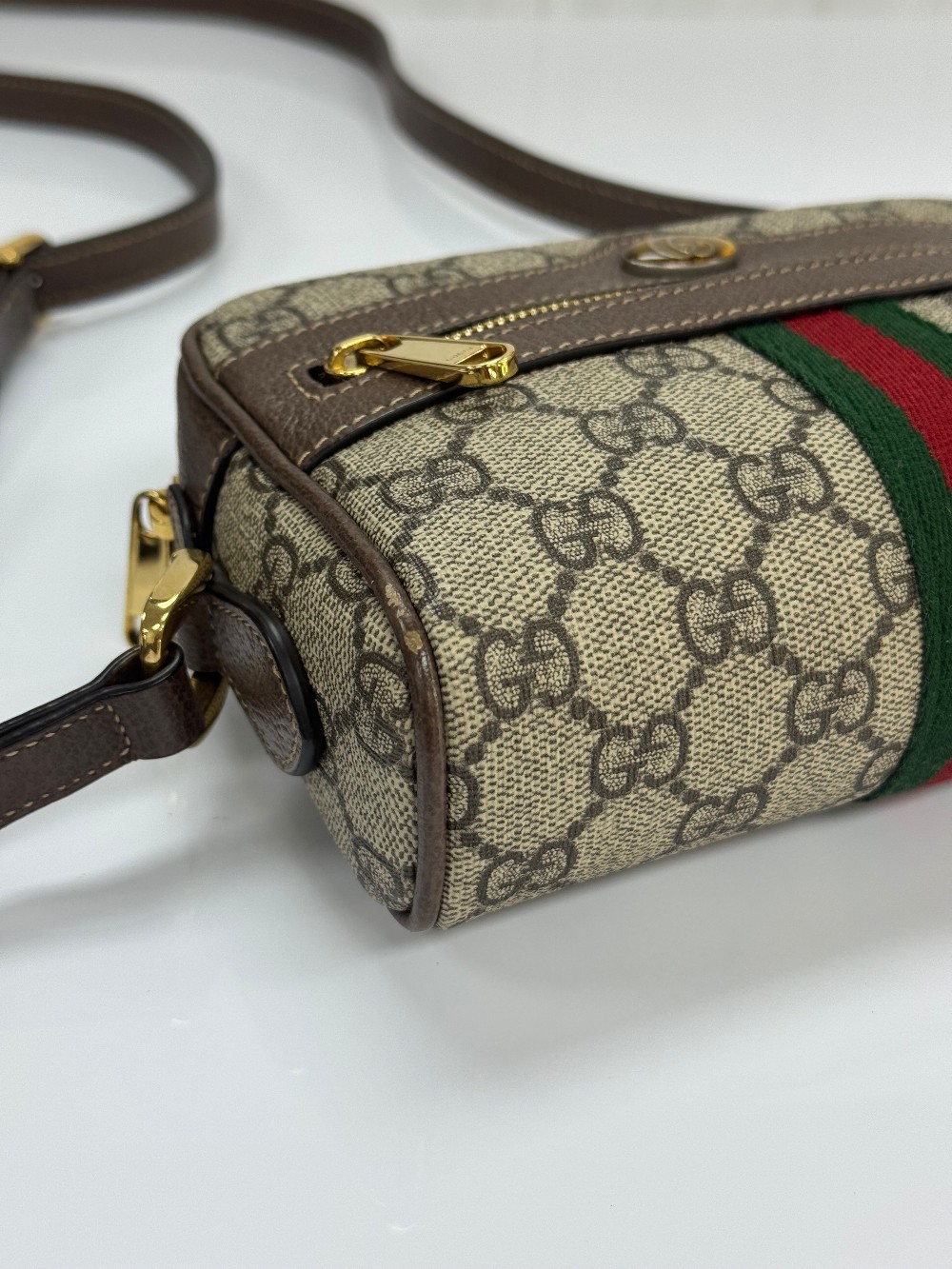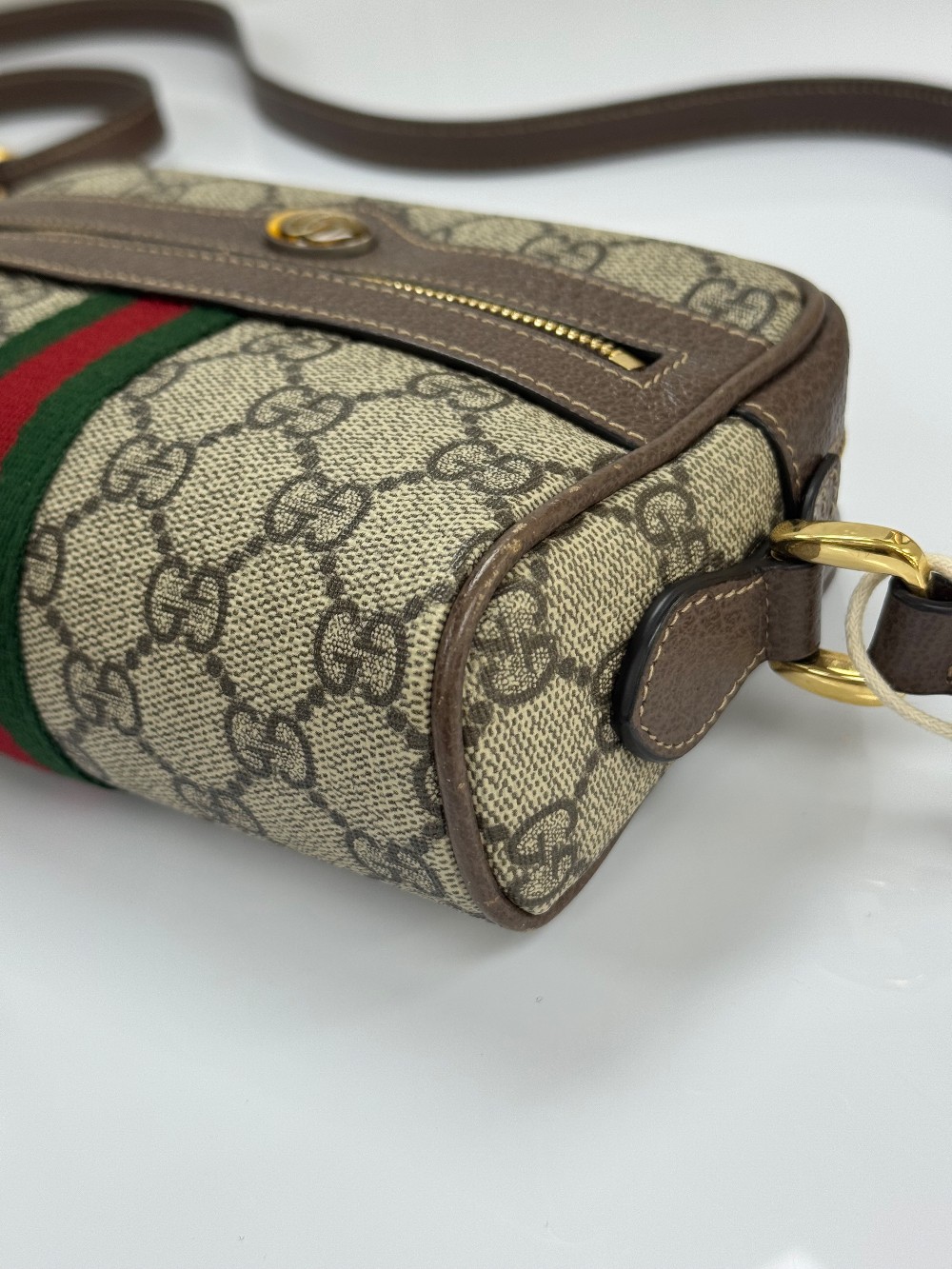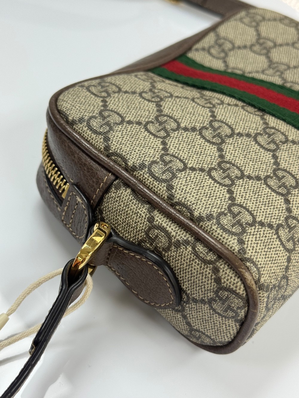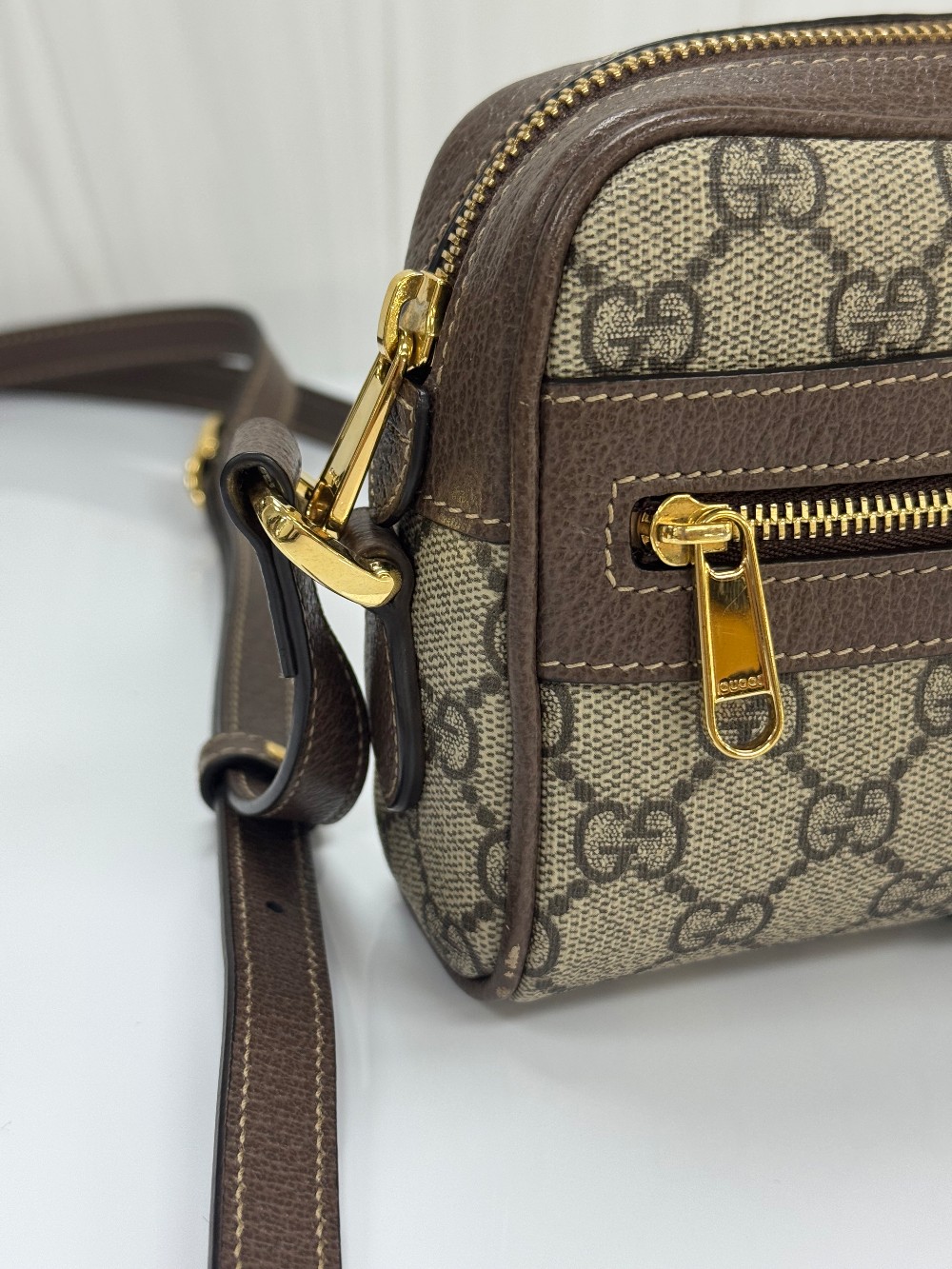 This is an authentic GUCCI GG Supreme Monogram Web Mini Ophidia Shoulder Bag in Brown. This camera-style crossbody bag is crafted of Gucci GG supreme monogram-coated canvas, with brown leather trim. The bag features a front zipper pocket with the signature green and red web stripe design and an adjustable shoulder strap with polished gold hardware. The top zipper opens to a soft beige microfiber interior with a patch pocket.