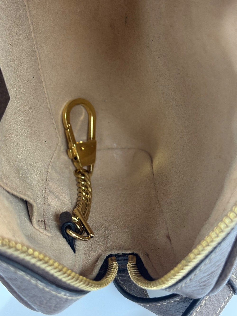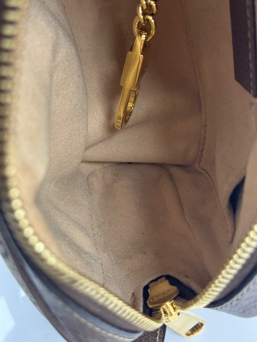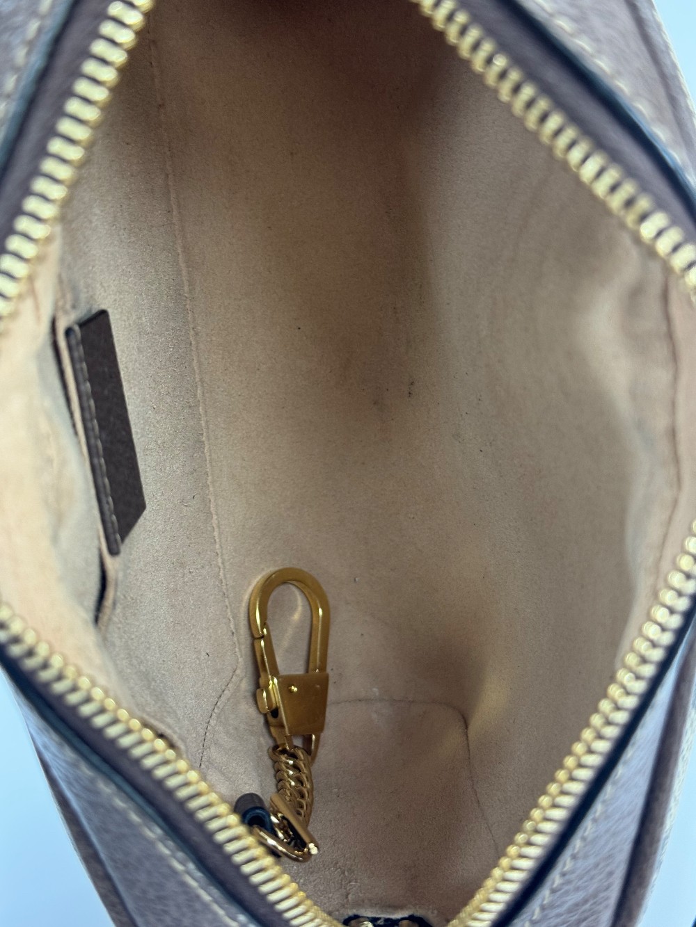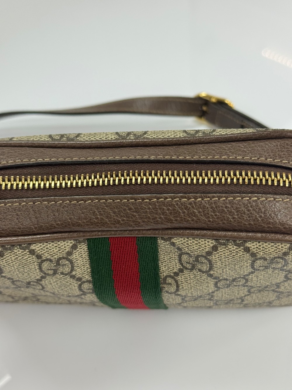 This is an authentic GUCCI GG Supreme Monogram Web Mini Ophidia Shoulder Bag in Brown. This camera-style crossbody bag is crafted of Gucci GG supreme monogram-coated canvas, with brown leather trim. The bag features a front zipper pocket with the signature green and red web stripe design and an adjustable shoulder strap with polished gold hardware. The top zipper opens to a soft beige microfiber interior with a patch pocket.