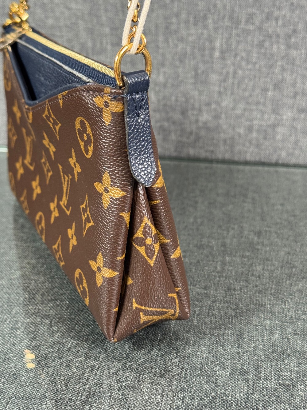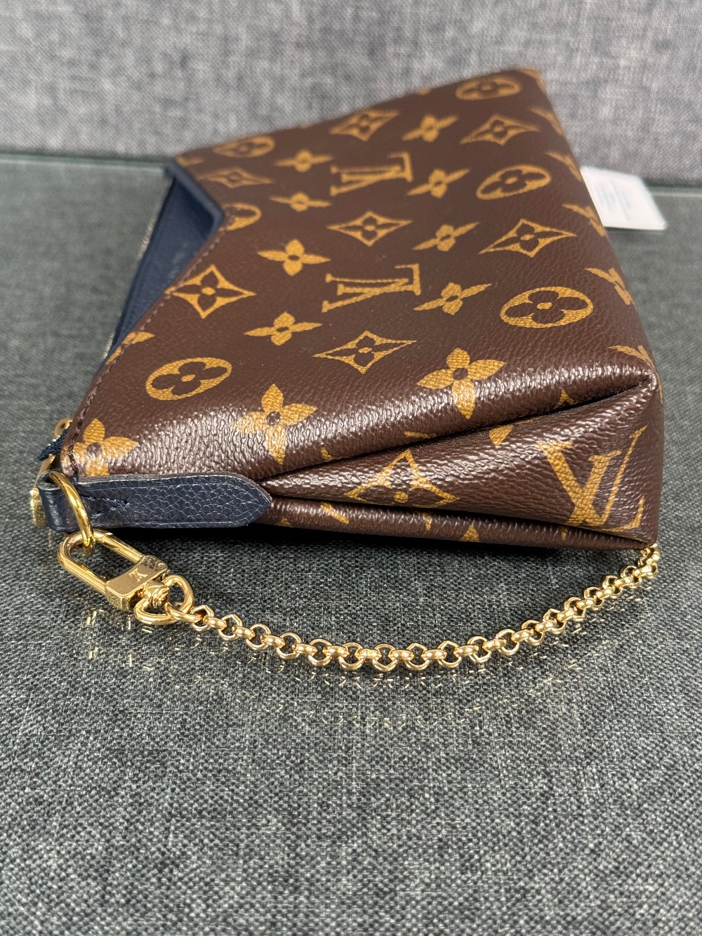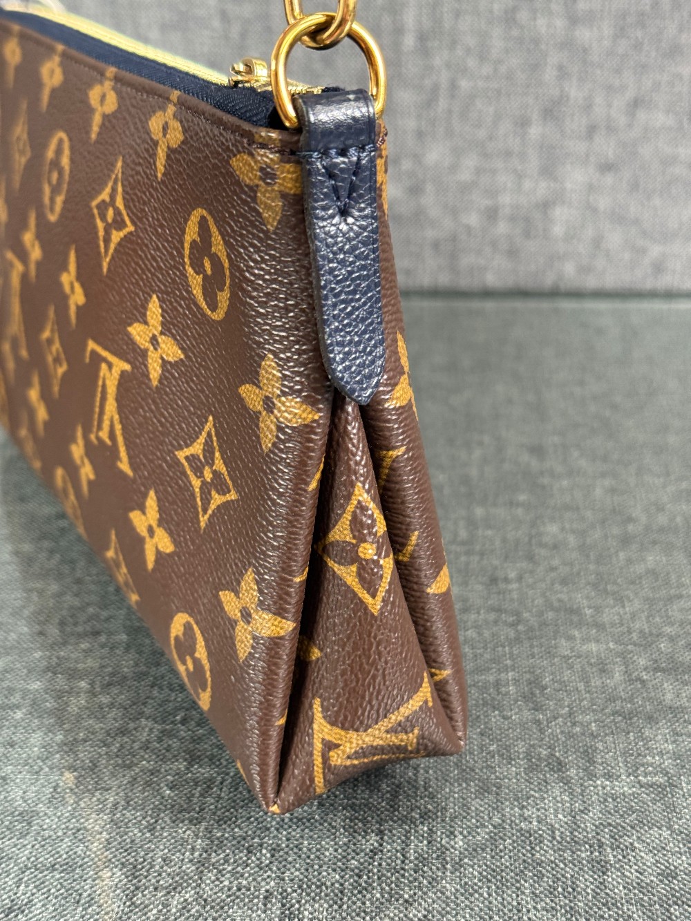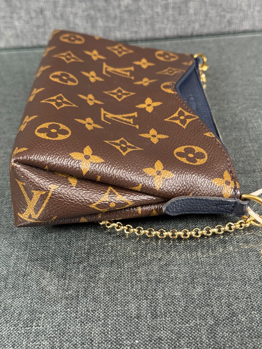 This is an authentic LOUIS VUITTON Monogram Pallas Clutch in Blue Marine. This chic shoulder bag is crafted of classic Louis Vuitton monogram on toile canvas, with textured navy blue leather trim. The bag features a front pocket, a leather shoulder strap and gold chain strap. The top zipper opens to a navy blue fabric interior with a patch pocket.