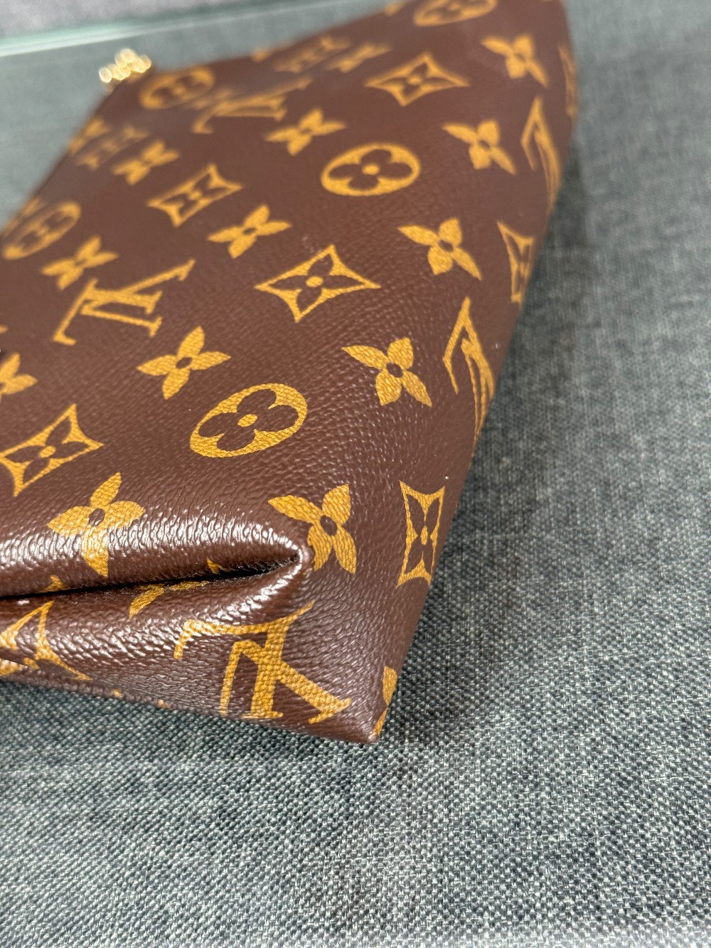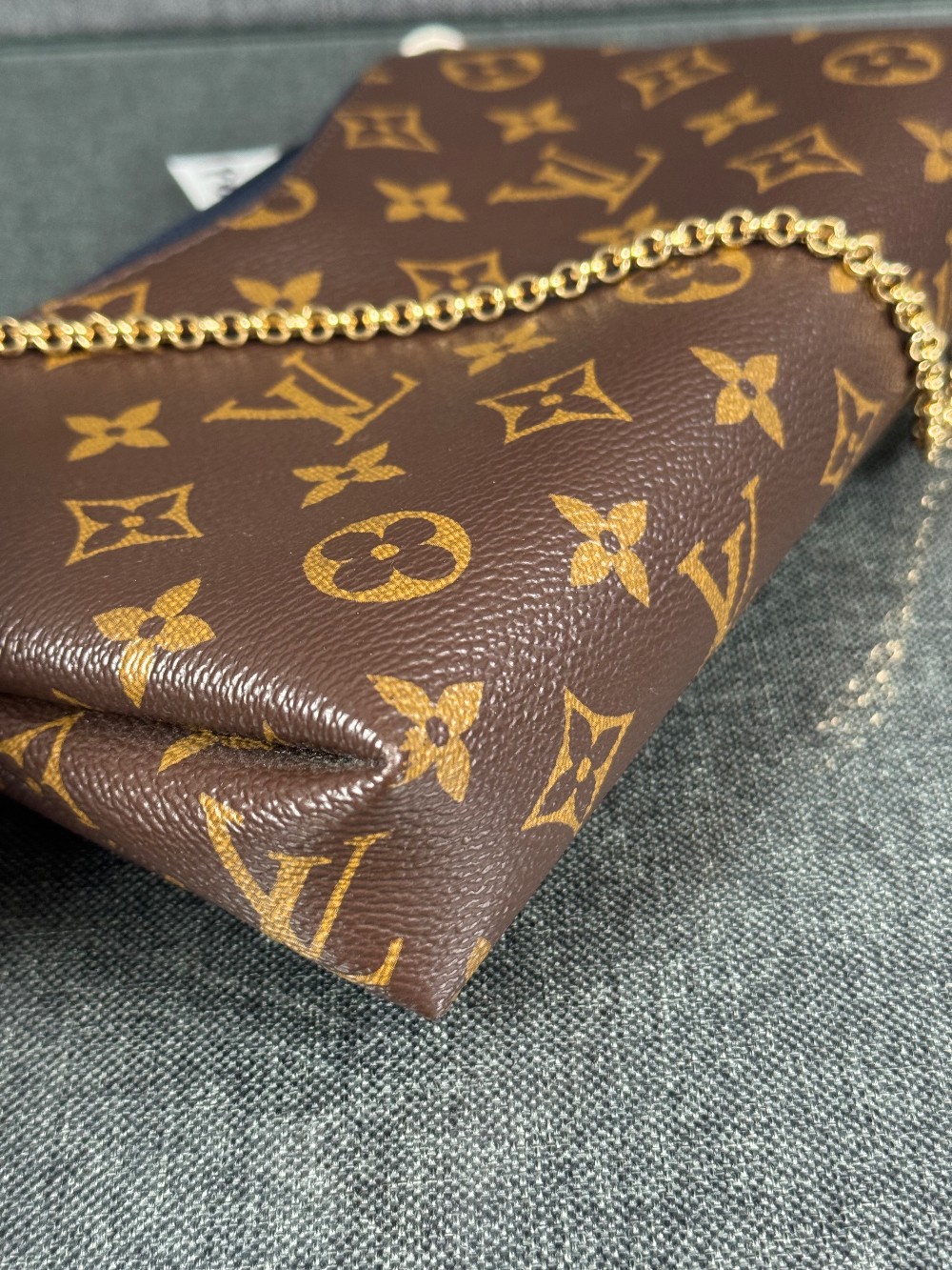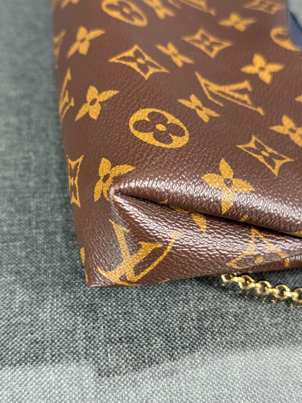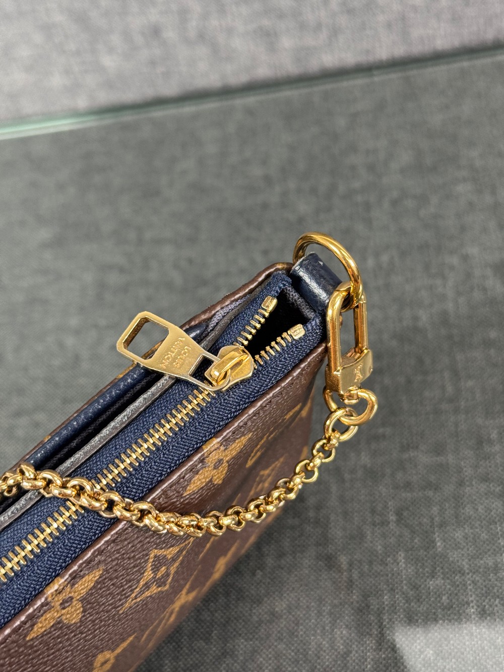 This is an authentic LOUIS VUITTON Monogram Pallas Clutch in Blue Marine. This chic shoulder bag is crafted of classic Louis Vuitton monogram on toile canvas, with textured navy blue leather trim. The bag features a front pocket, a leather shoulder strap and gold chain strap. The top zipper opens to a navy blue fabric interior with a patch pocket.