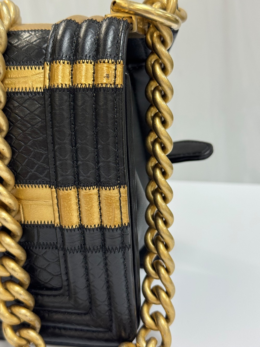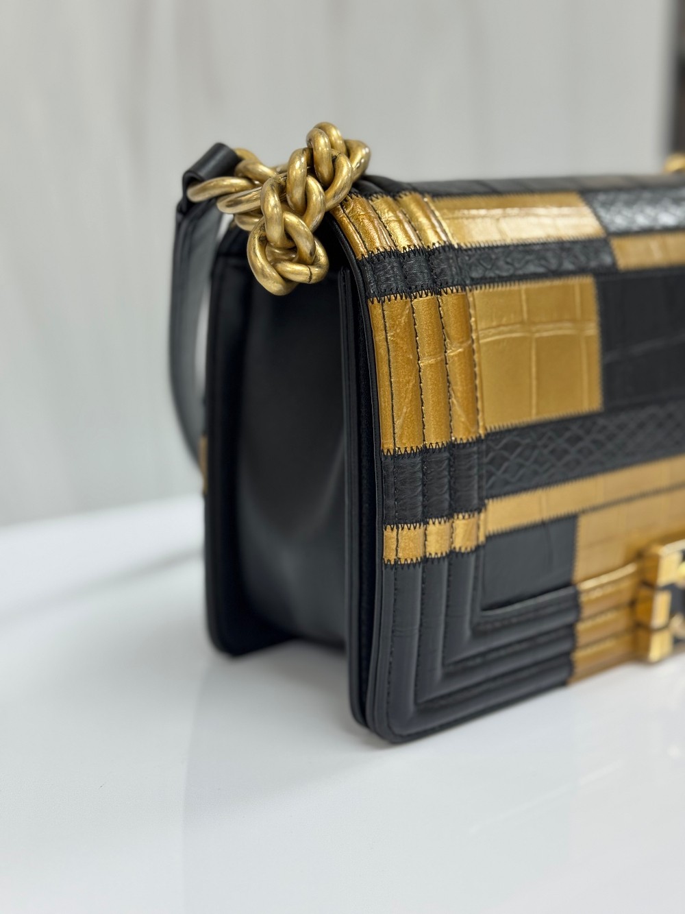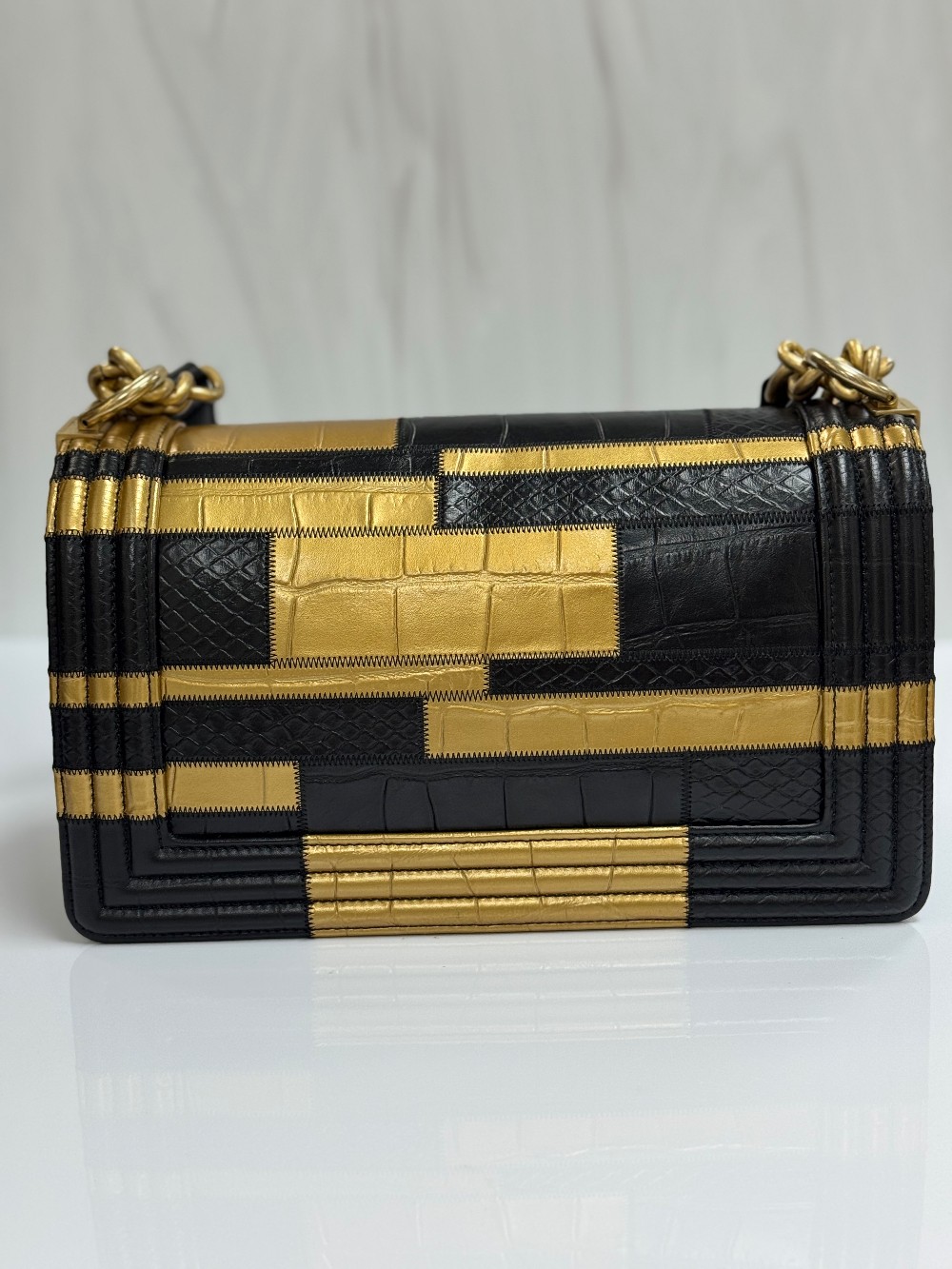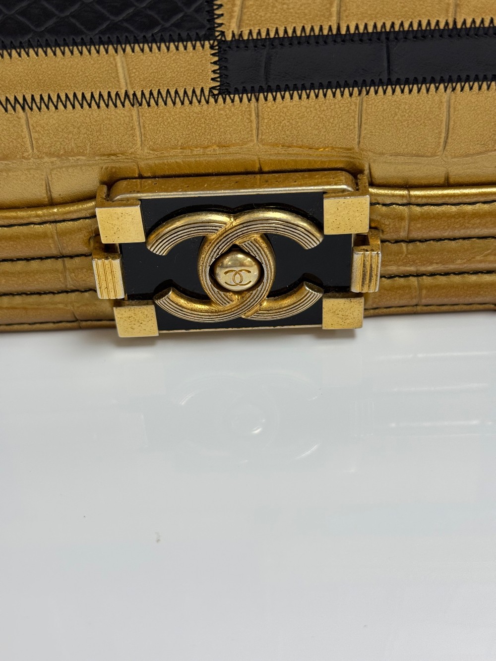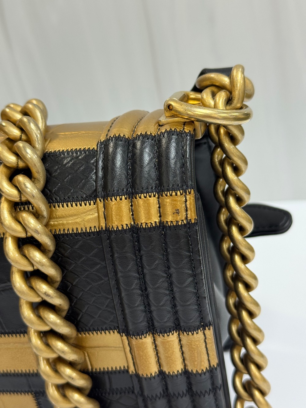 This is an authentic CHANEL Crocodile Python Calfskin Embossed Medium Boy Flap in Black and Gold. This edgy crossbody bag is crafted of calfskin leather, embossed with a crocodile print, and painted with gold rectangular patches as well as python-embossed leather in black. The hardware includes a long gold chain-link shoulder strap with a black shoulder pad and a Chanel Boy CC push lock. The single flap opens to a gold leather interior with a flat pocket.