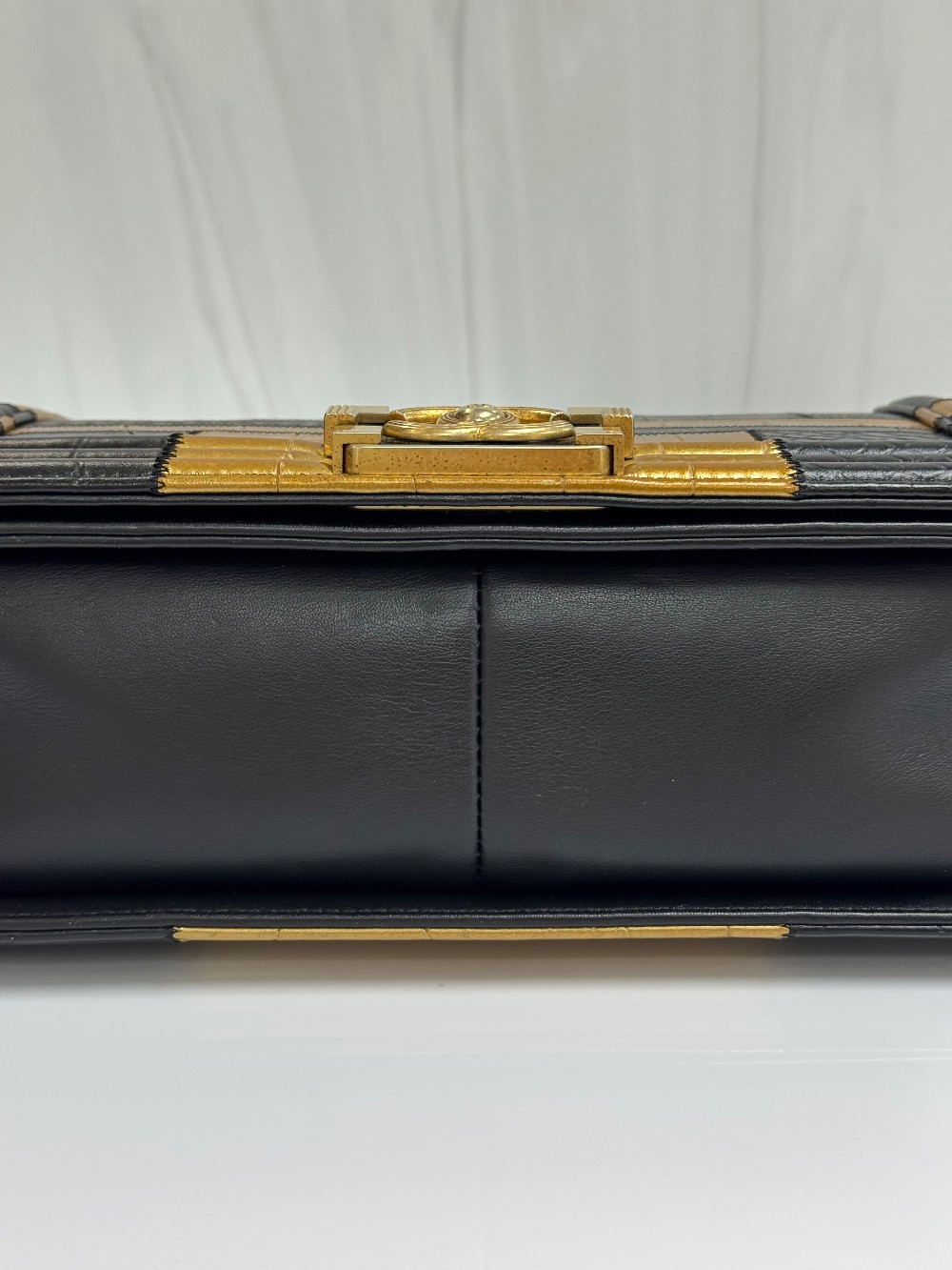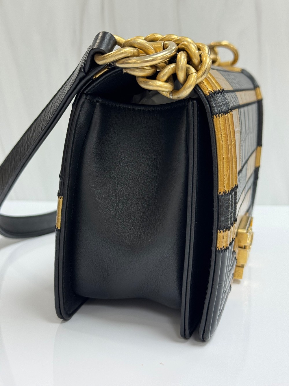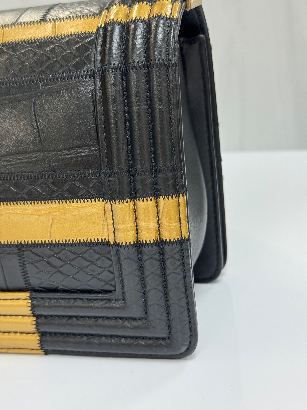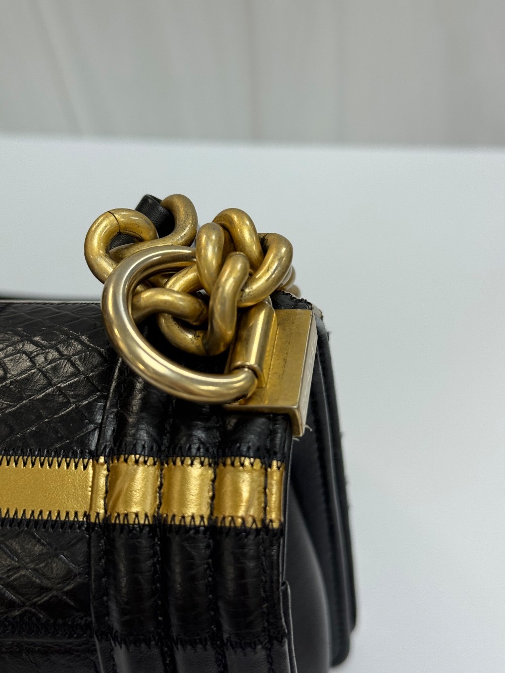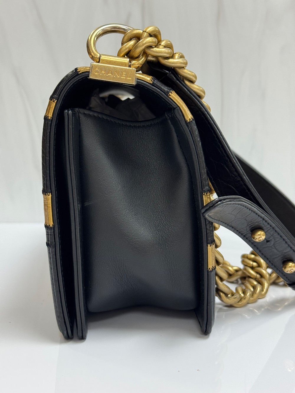 This is an authentic CHANEL Crocodile Python Calfskin Embossed Medium Boy Flap in Black and Gold. This edgy crossbody bag is crafted of calfskin leather, embossed with a crocodile print, and painted with gold rectangular patches as well as python-embossed leather in black. The hardware includes a long gold chain-link shoulder strap with a black shoulder pad and a Chanel Boy CC push lock. The single flap opens to a gold leather interior with a flat pocket.