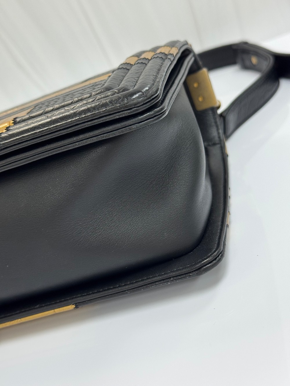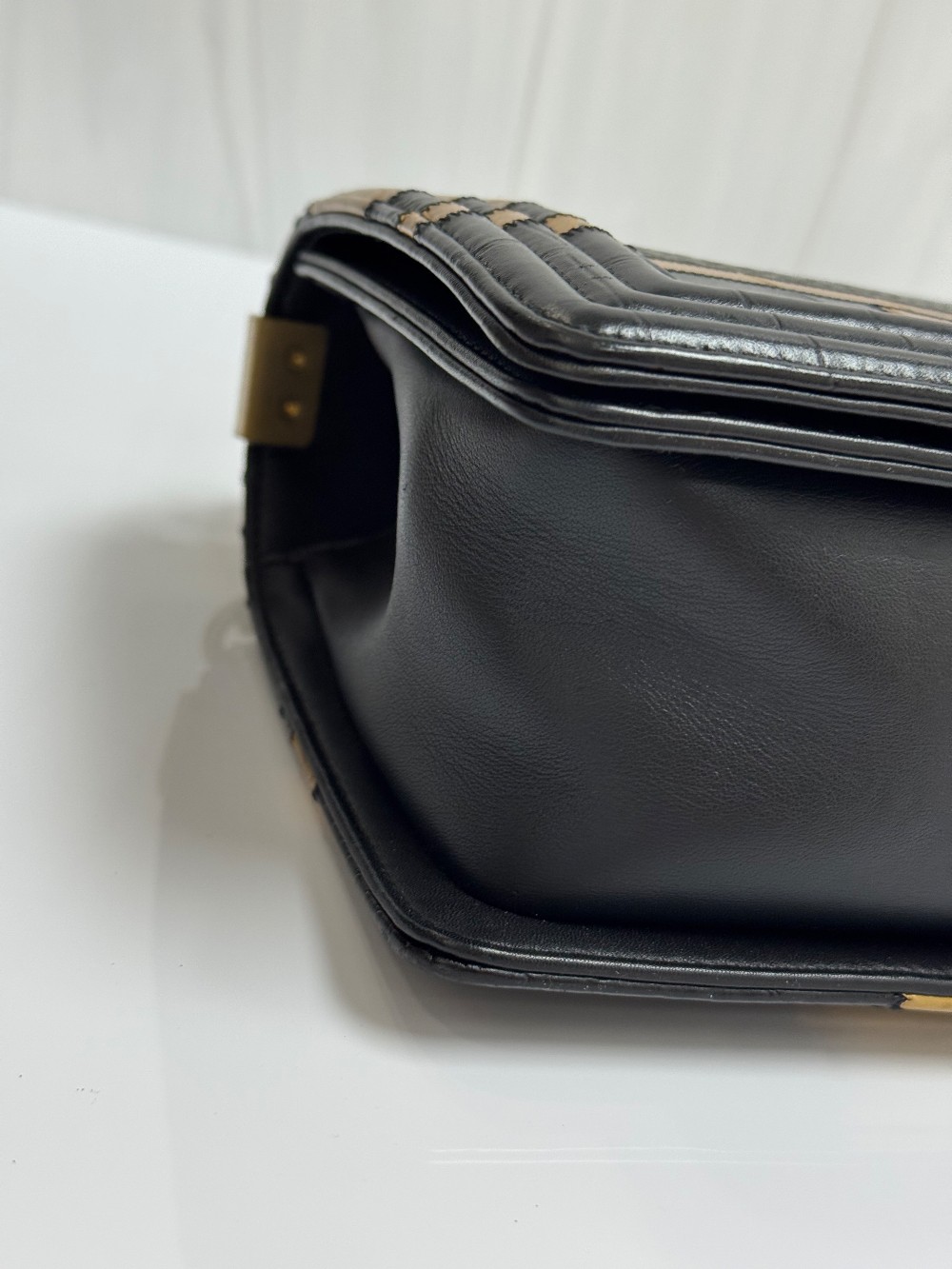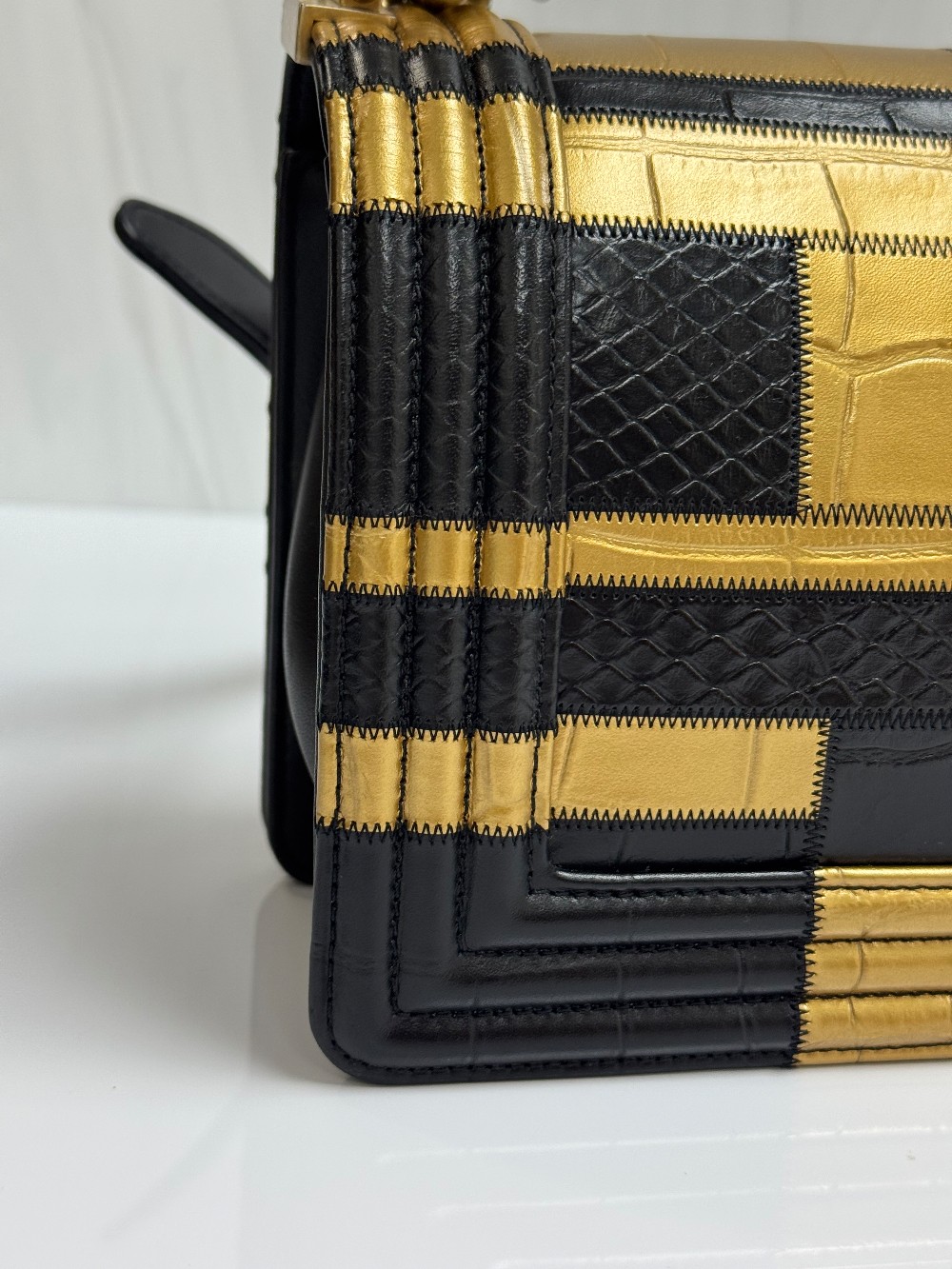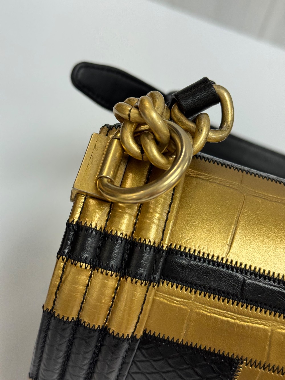 This is an authentic CHANEL Crocodile Python Calfskin Embossed Medium Boy Flap in Black and Gold. This edgy crossbody bag is crafted of calfskin leather, embossed with a crocodile print, and painted with gold rectangular patches as well as python-embossed leather in black. The hardware includes a long gold chain-link shoulder strap with a black shoulder pad and a Chanel Boy CC push lock. The single flap opens to a gold leather interior with a flat pocket.