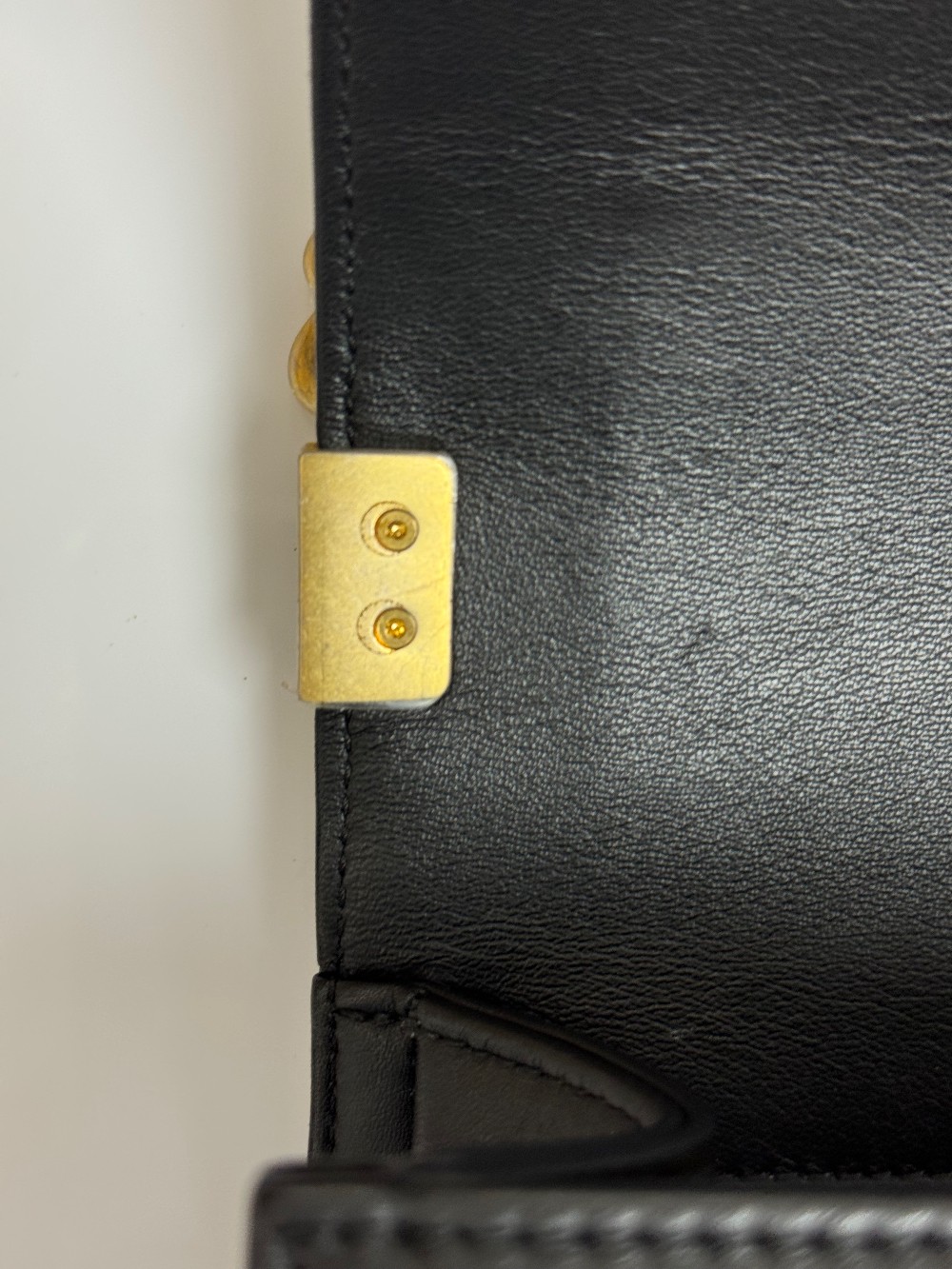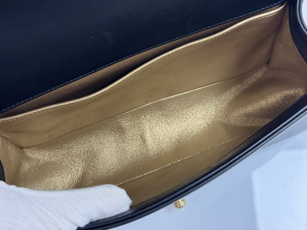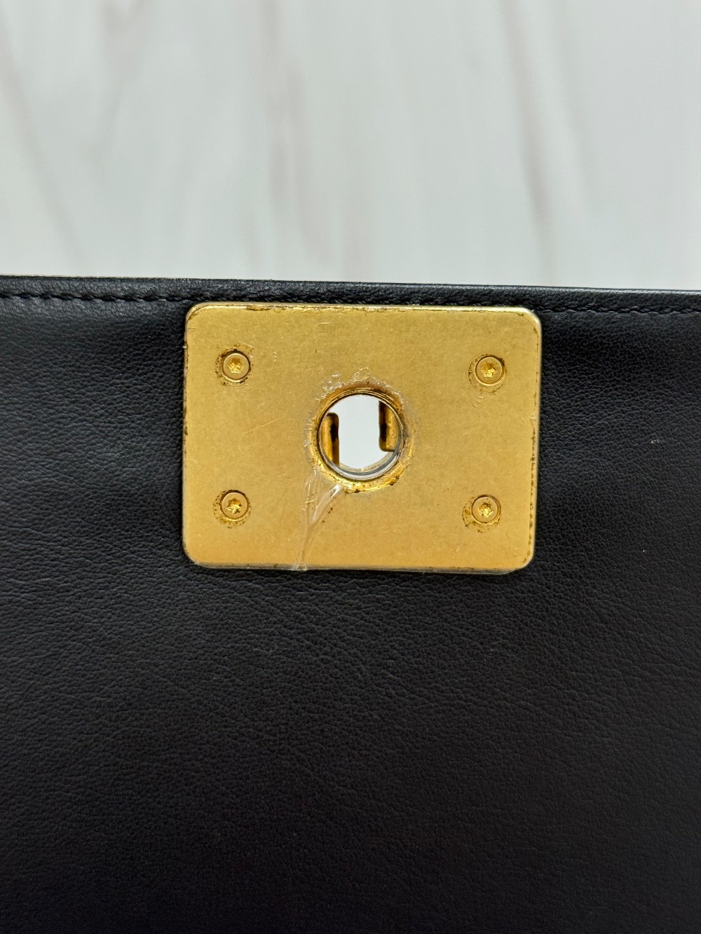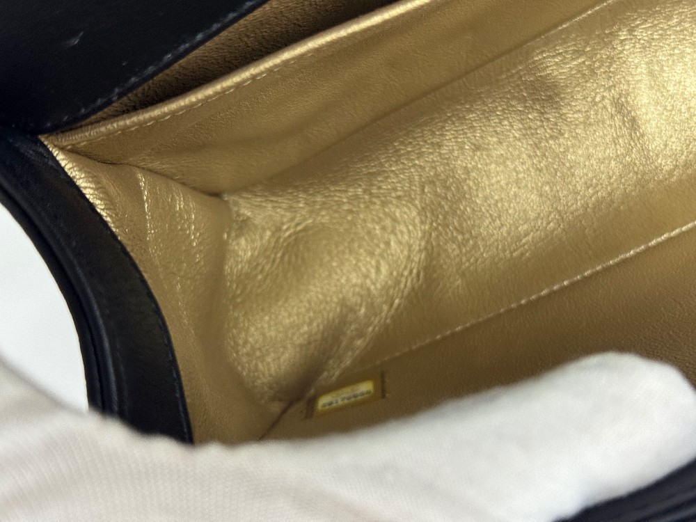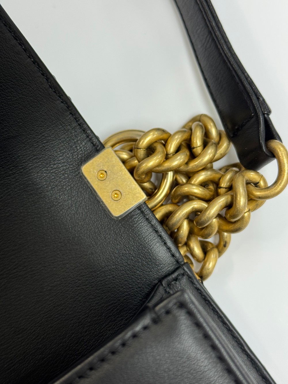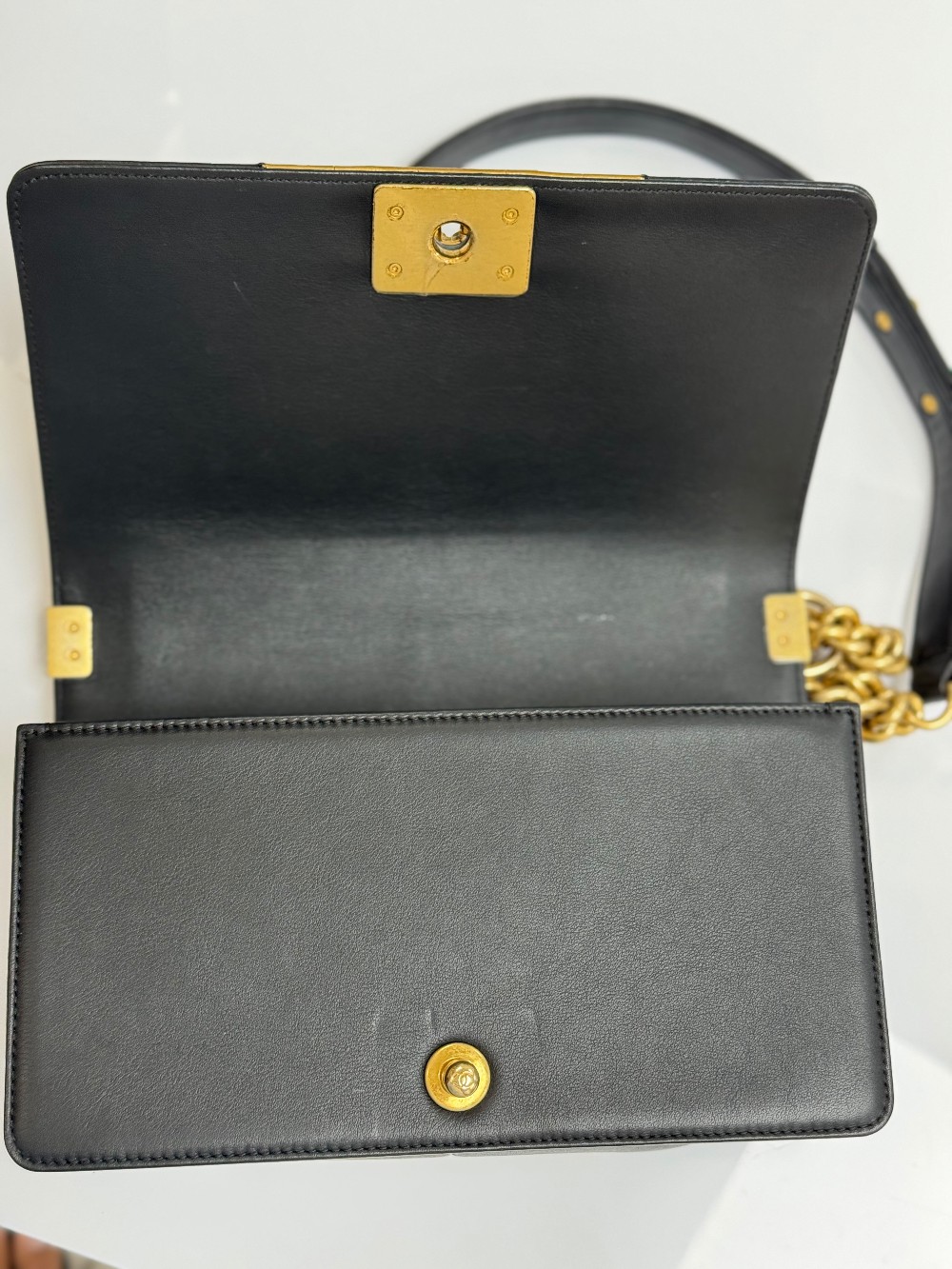 This is an authentic CHANEL Crocodile Python Calfskin Embossed Medium Boy Flap in Black and Gold. This edgy crossbody bag is crafted of calfskin leather, embossed with a crocodile print, and painted with gold rectangular patches as well as python-embossed leather in black. The hardware includes a long gold chain-link shoulder strap with a black shoulder pad and a Chanel Boy CC push lock. The single flap opens to a gold leather interior with a flat pocket.