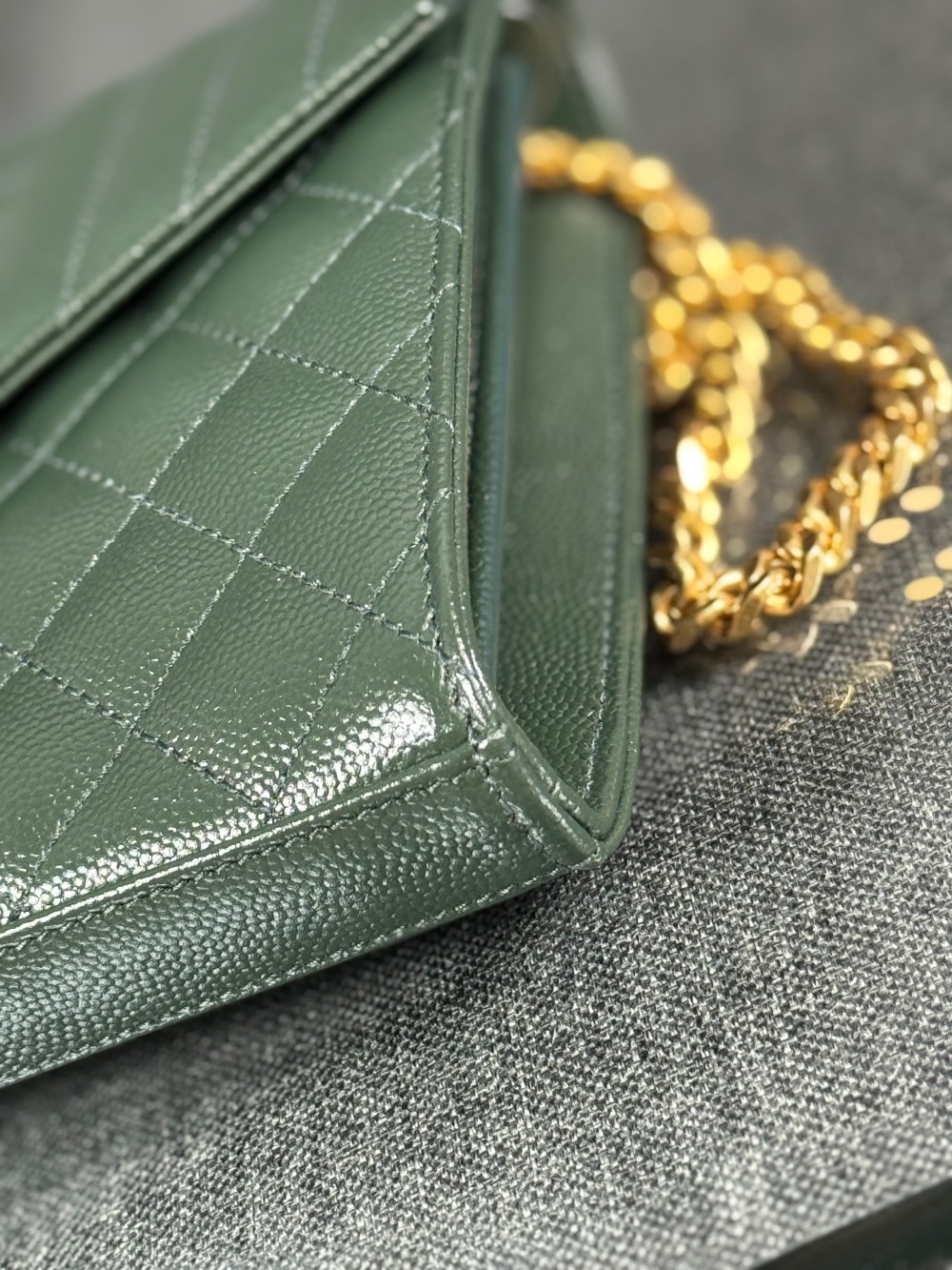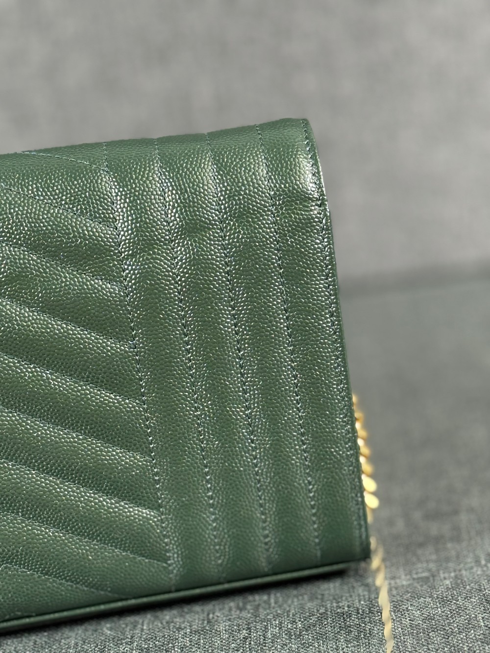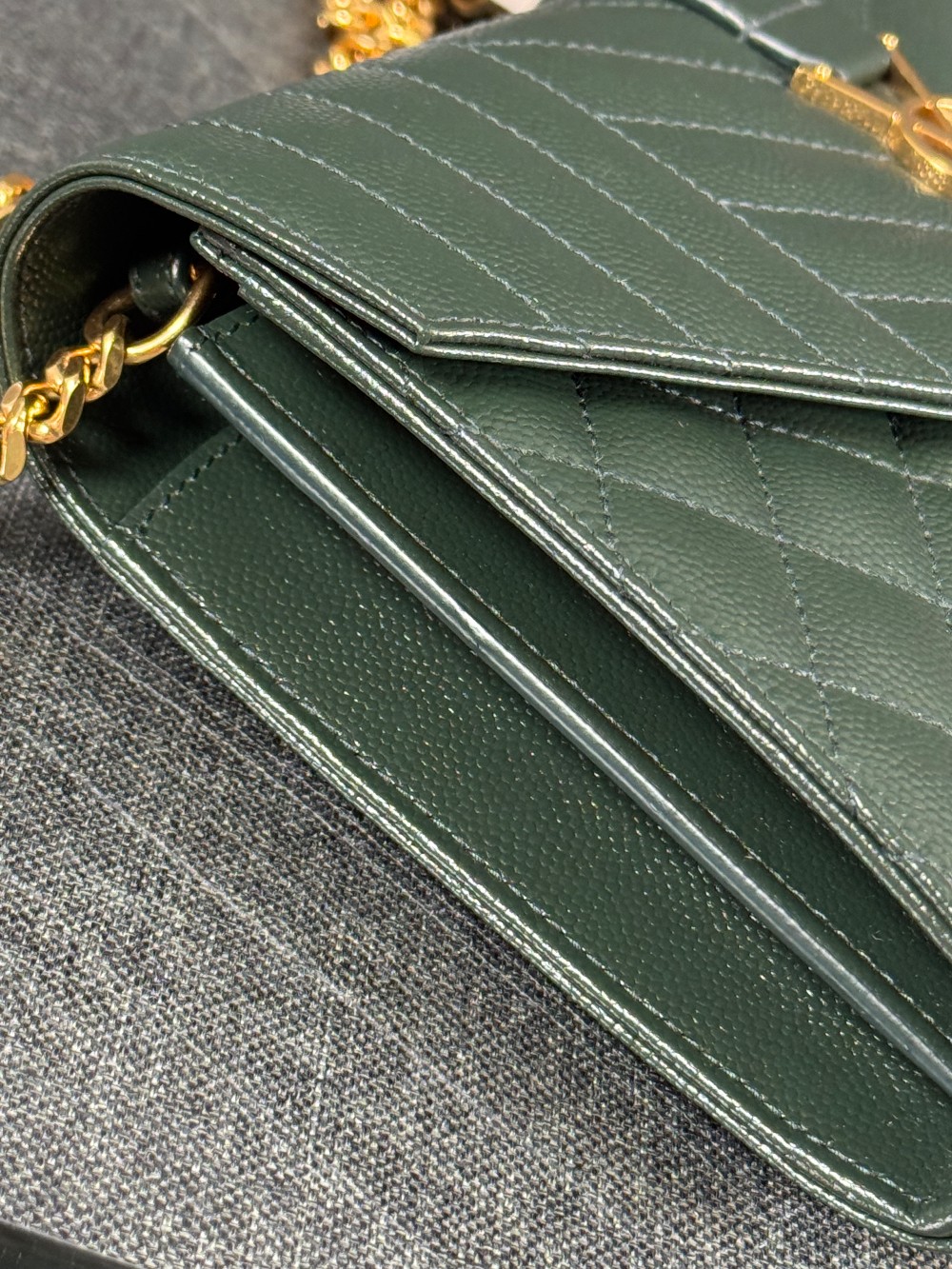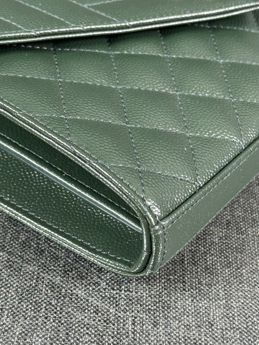 This is an authentic SAINT LAURENT Grain De Poudre Mixed Matelasse Triquilt Monogram Chain Wallet in Dark Green. This elegant shoulder tote features chic chevron-quilted leather in beige. The bag features a prominent gold YSL monogram detail on the front flap and opens to a black fabric and black leather interior with a patch pocket and central zippered pocket.