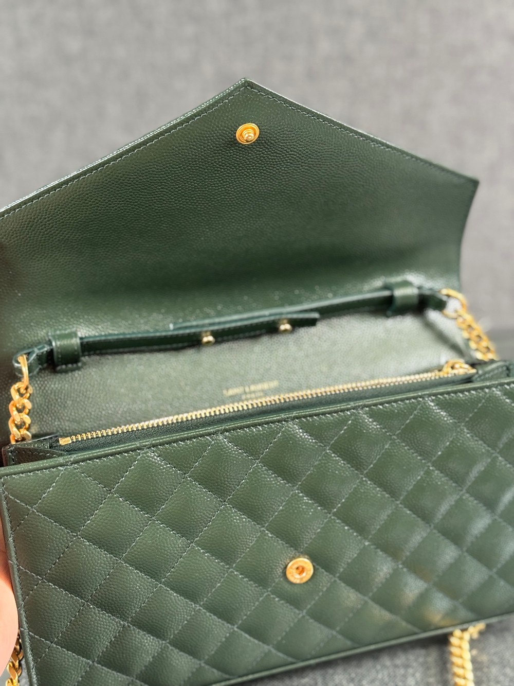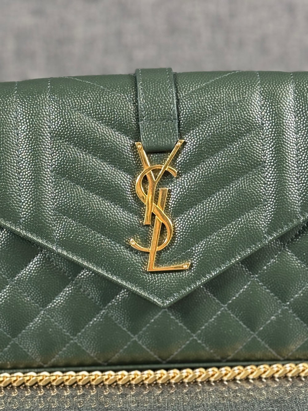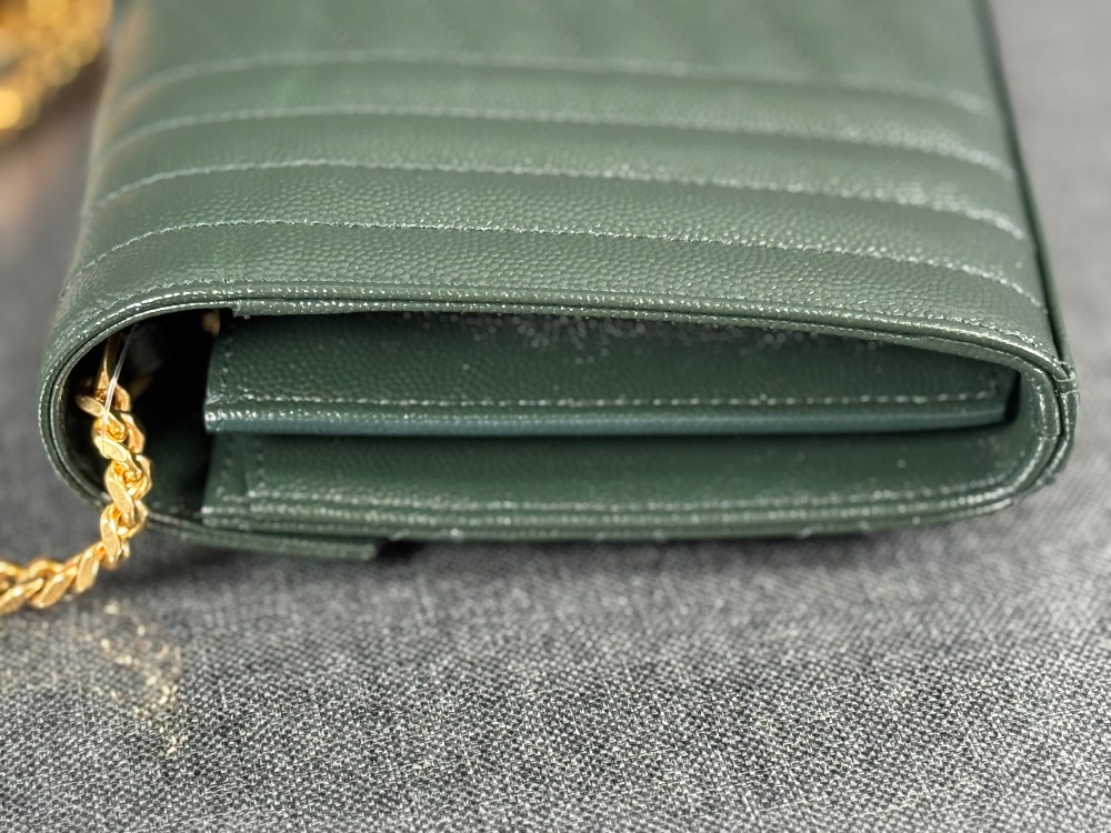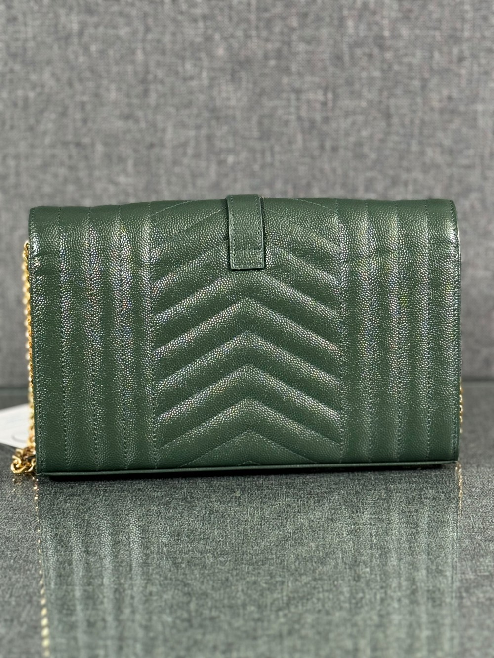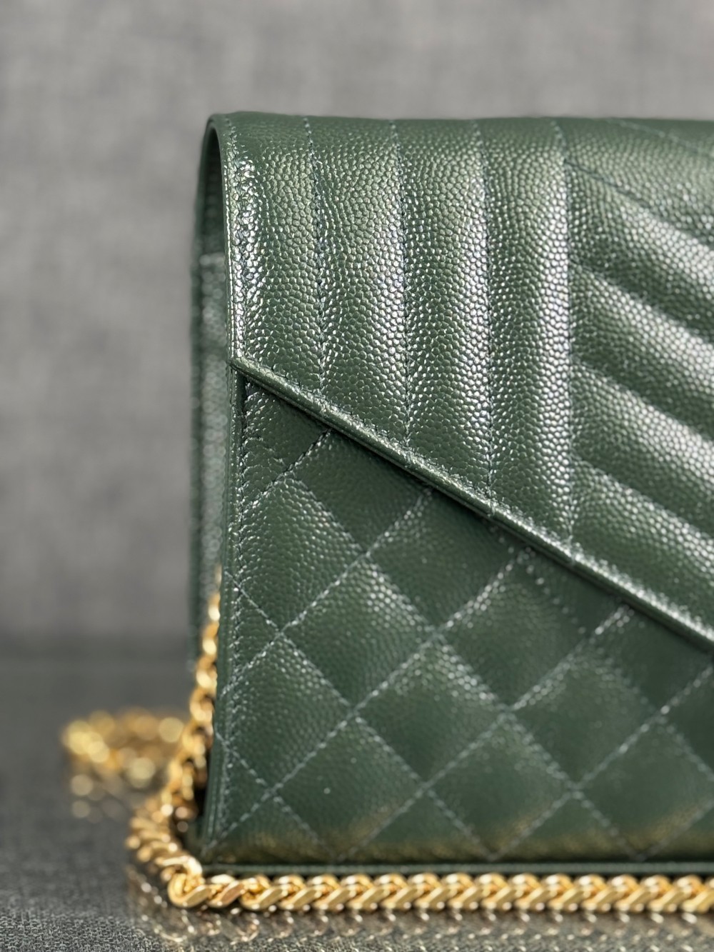 This is an authentic SAINT LAURENT Grain De Poudre Mixed Matelasse Triquilt Monogram Chain Wallet in Dark Green. This elegant shoulder tote features chic chevron-quilted leather in beige. The bag features a prominent gold YSL monogram detail on the front flap and opens to a black fabric and black leather interior with a patch pocket and central zippered pocket.