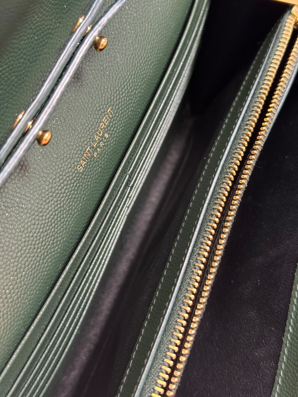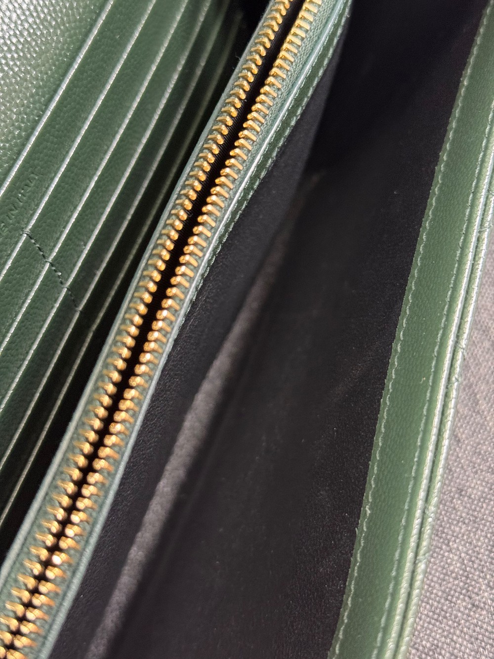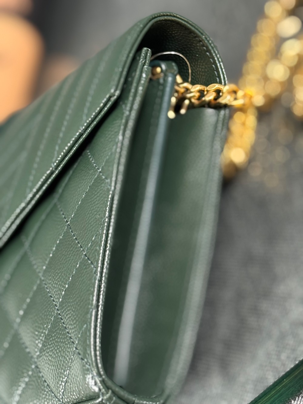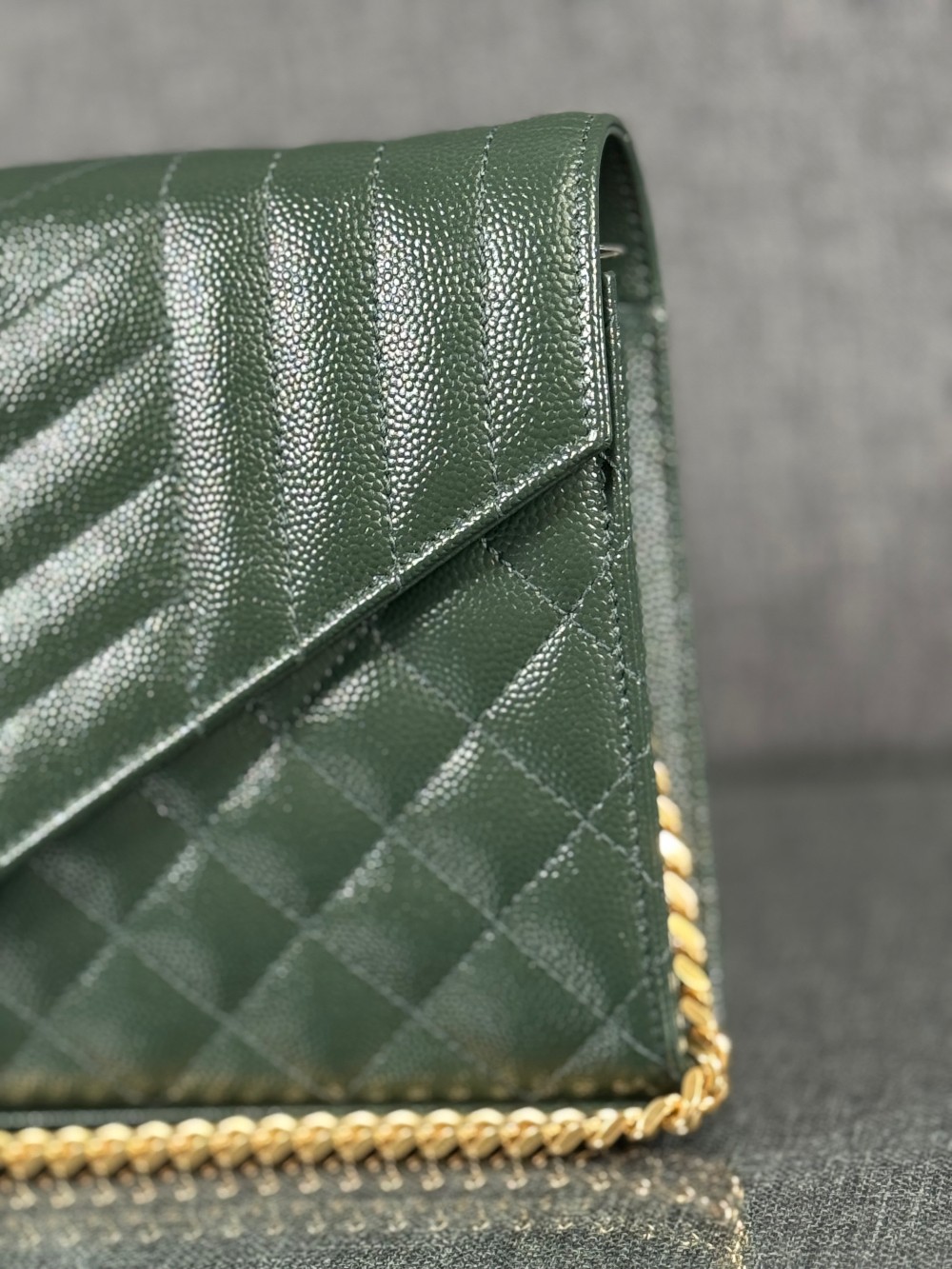 This is an authentic SAINT LAURENT Grain De Poudre Mixed Matelasse Triquilt Monogram Chain Wallet in Dark Green. This elegant shoulder tote features chic chevron-quilted leather in beige. The bag features a prominent gold YSL monogram detail on the front flap and opens to a black fabric and black leather interior with a patch pocket and central zippered pocket.