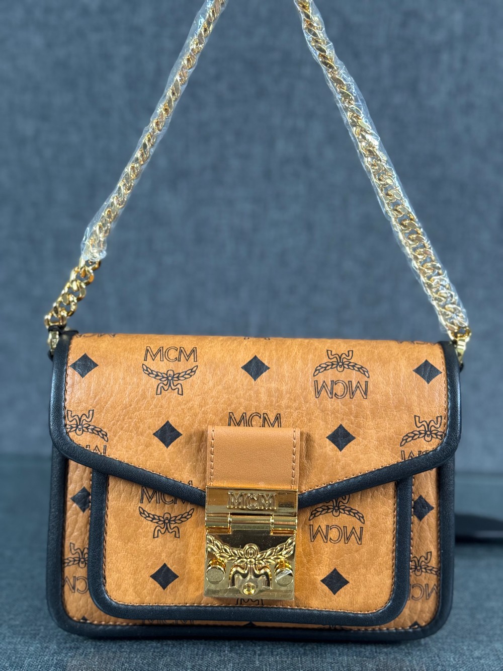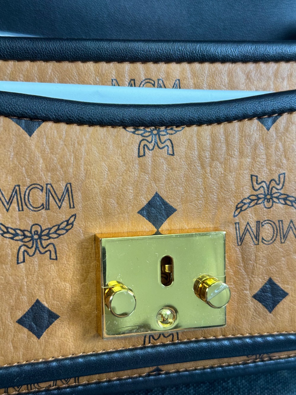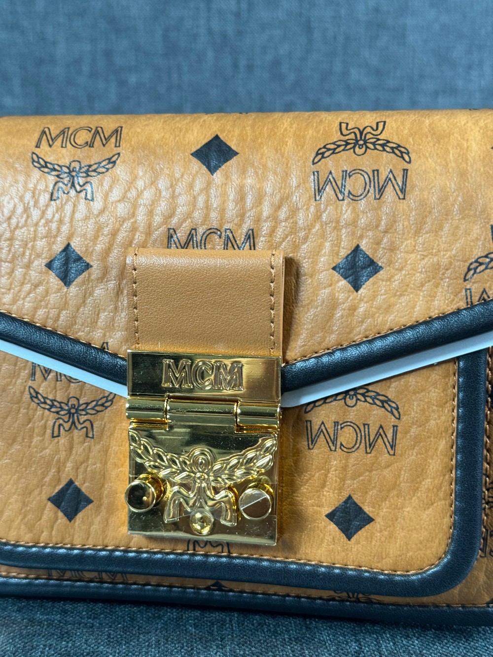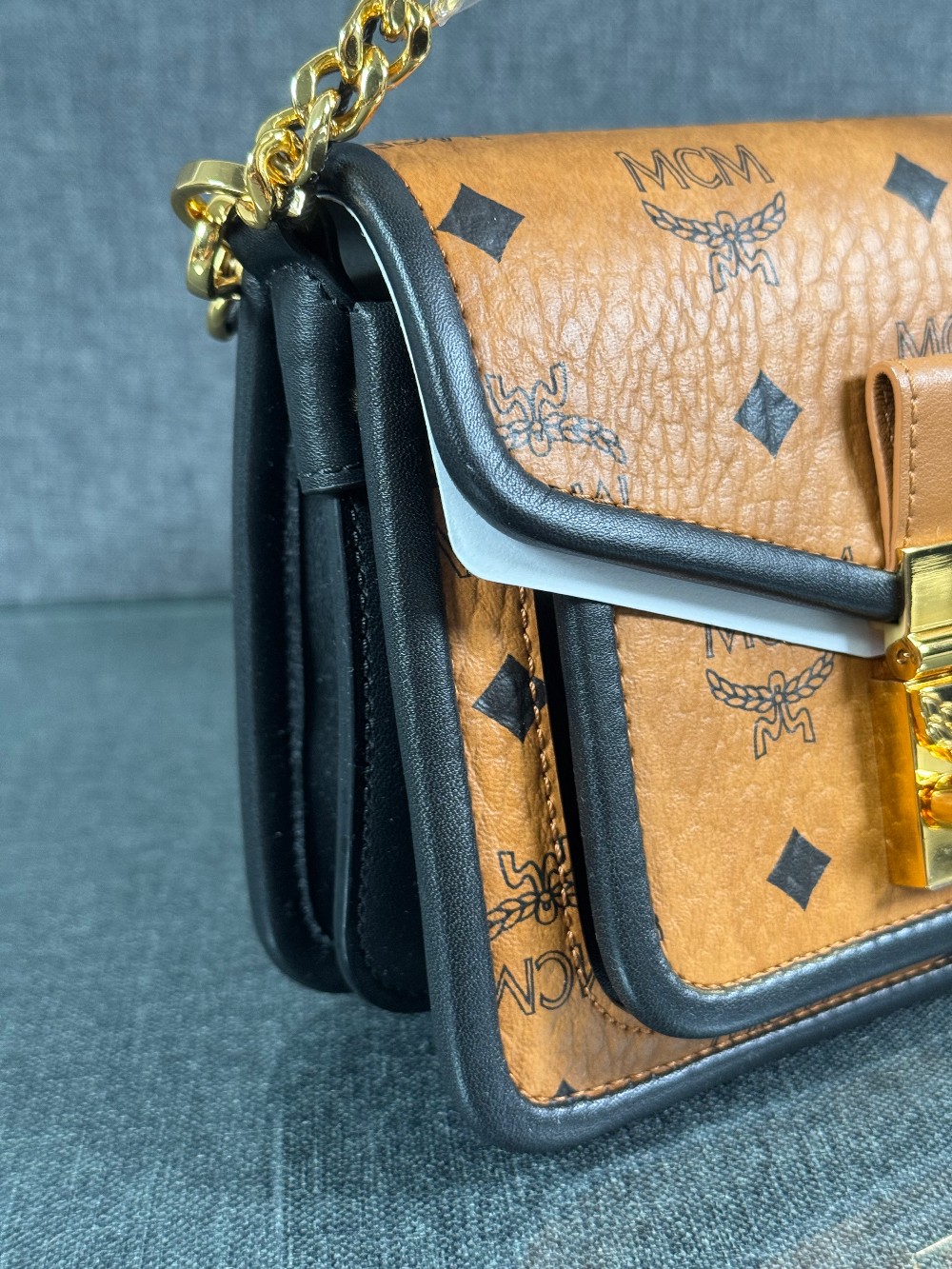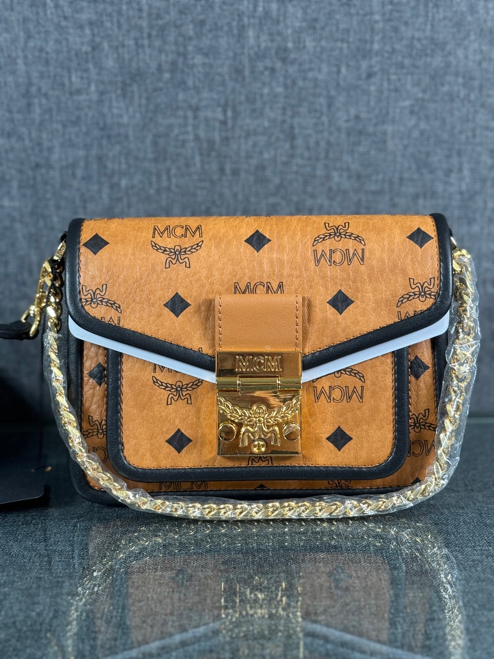 This is an authentic MCM Visetos Mini Patricia Crossbody Bag in Cognac and Black. This chic crossbody bag is crafted of grained calfskin leather in white and black. The bag features a gold chain strap and a black leather crossover flap that opens with a gold flip-lock to a partitioned brown microfiber interior with zipper and patch pockets.