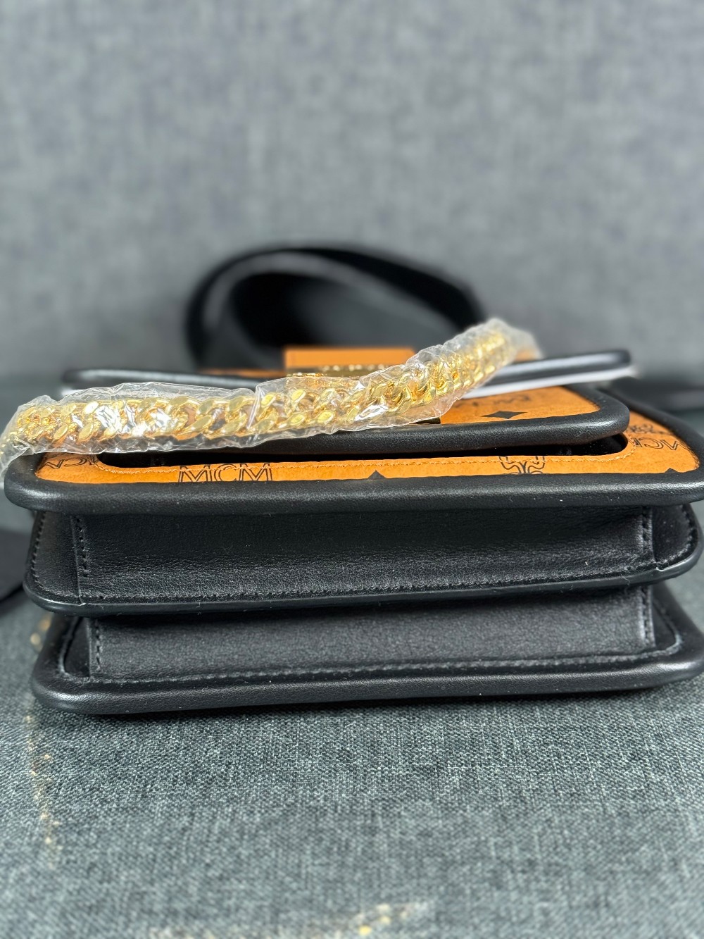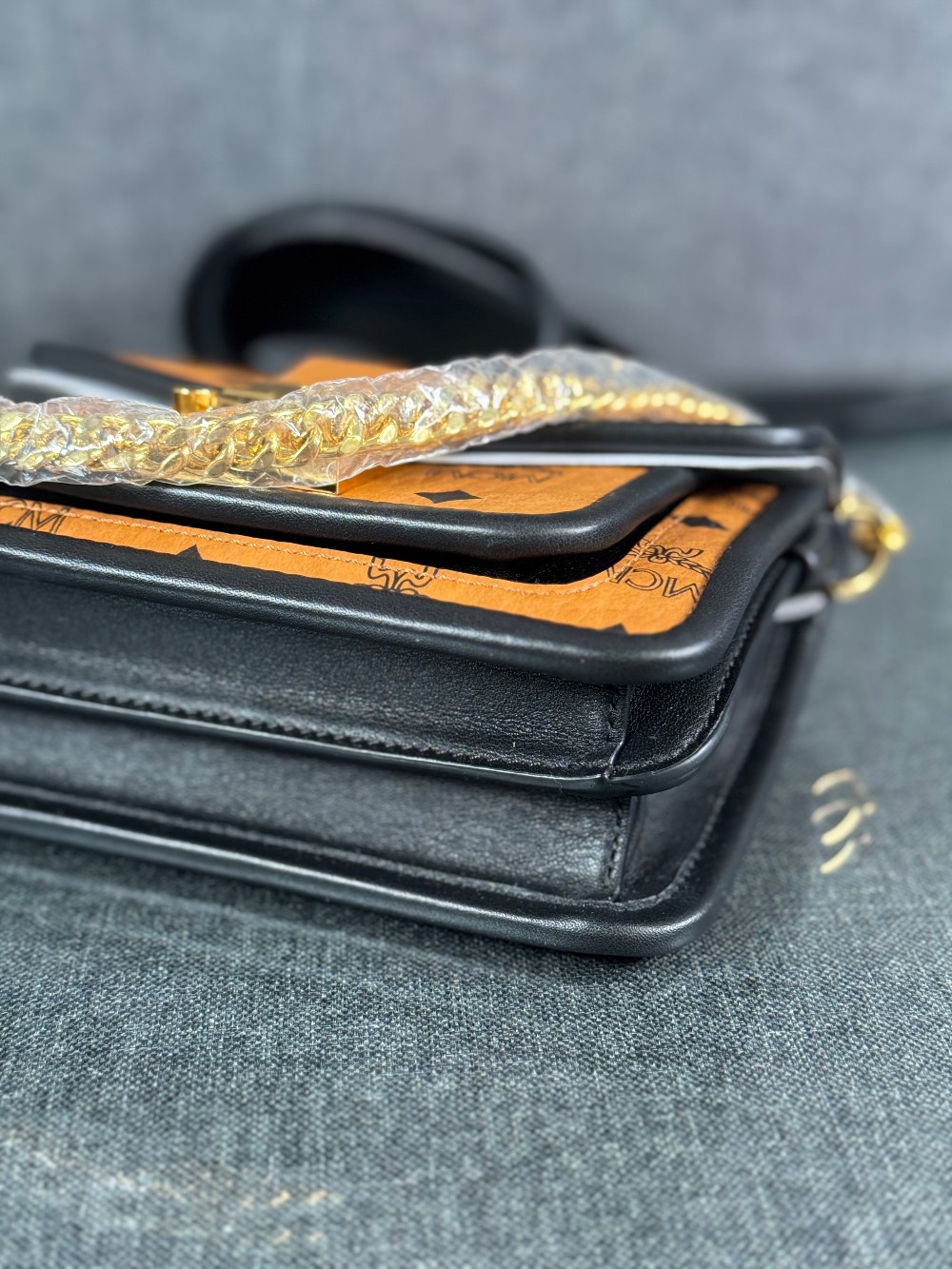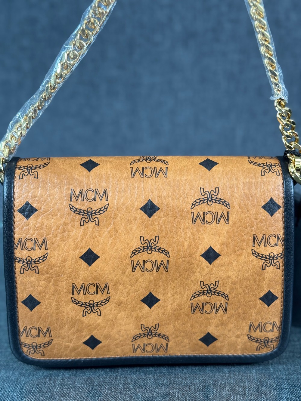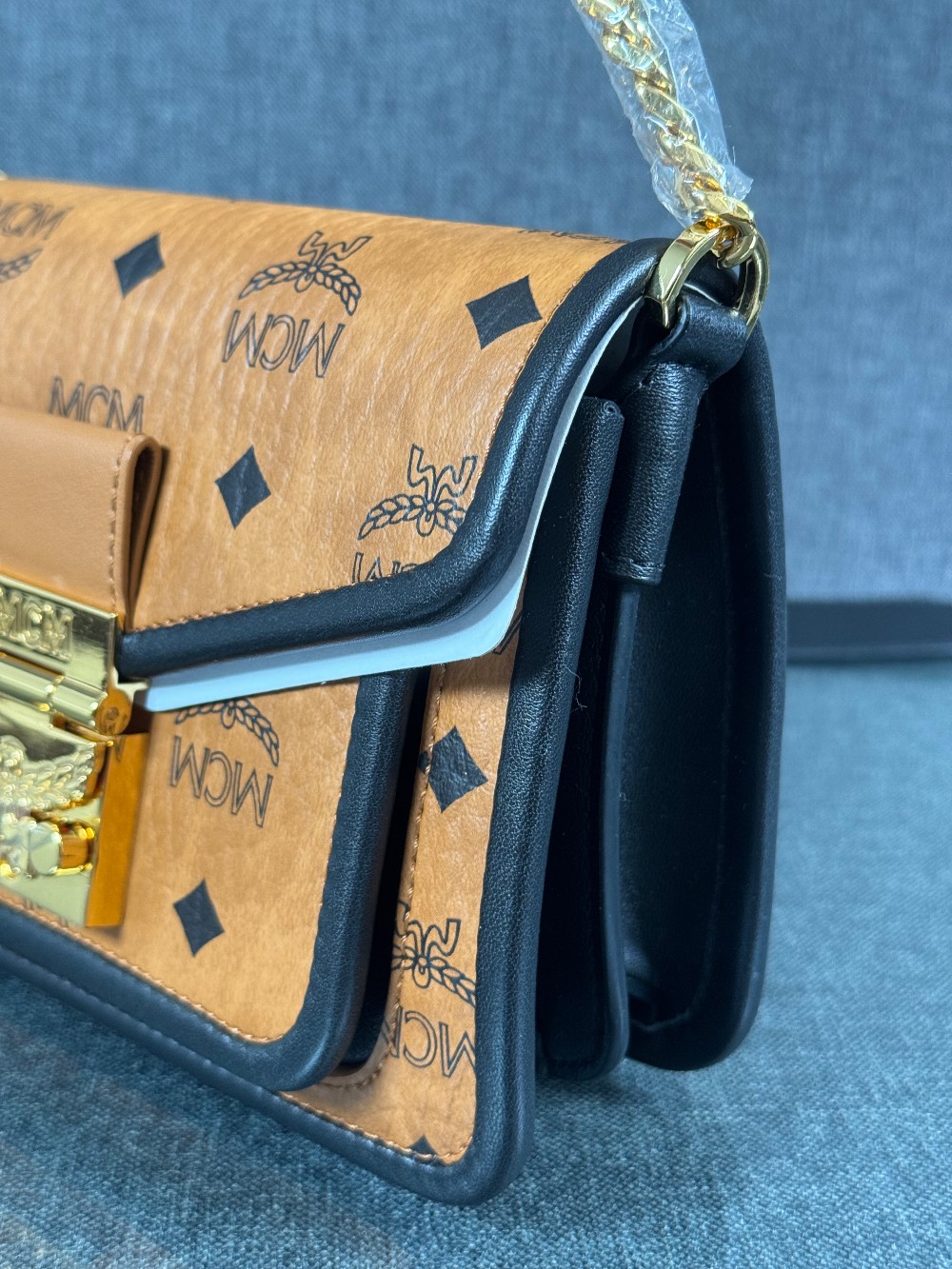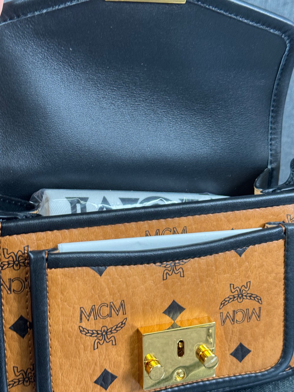 This is an authentic MCM Visetos Mini Patricia Crossbody Bag in Cognac and Black. This chic crossbody bag is crafted of grained calfskin leather in white and black. The bag features a gold chain strap and a black leather crossover flap that opens with a gold flip-lock to a partitioned brown microfiber interior with zipper and patch pockets.
