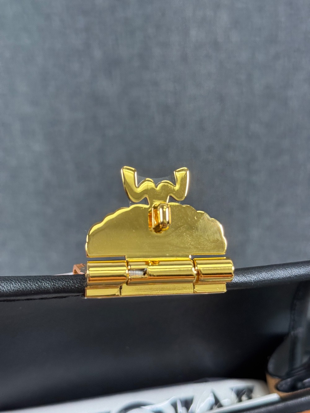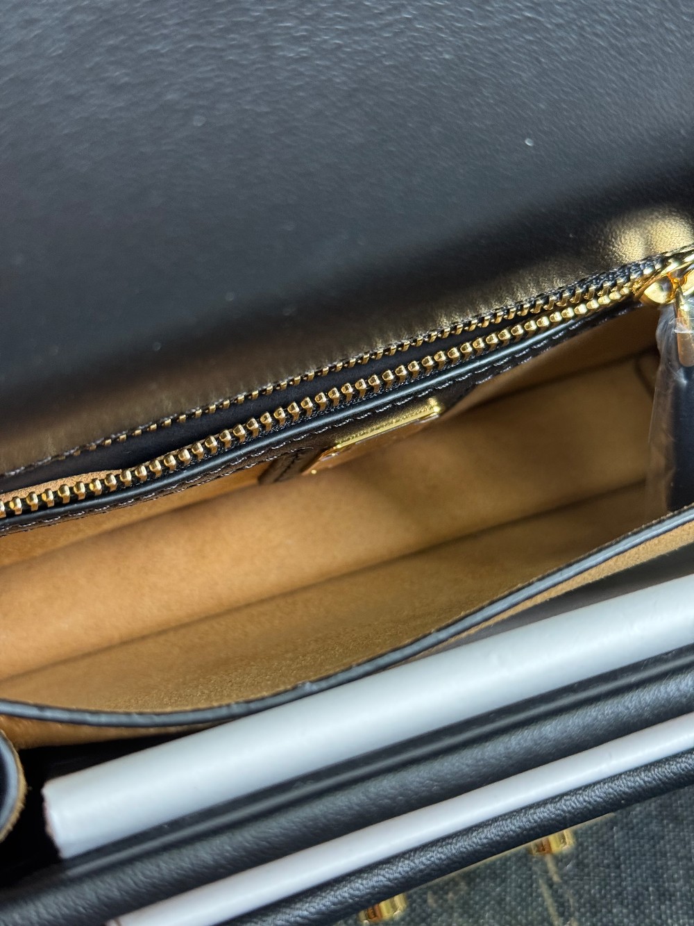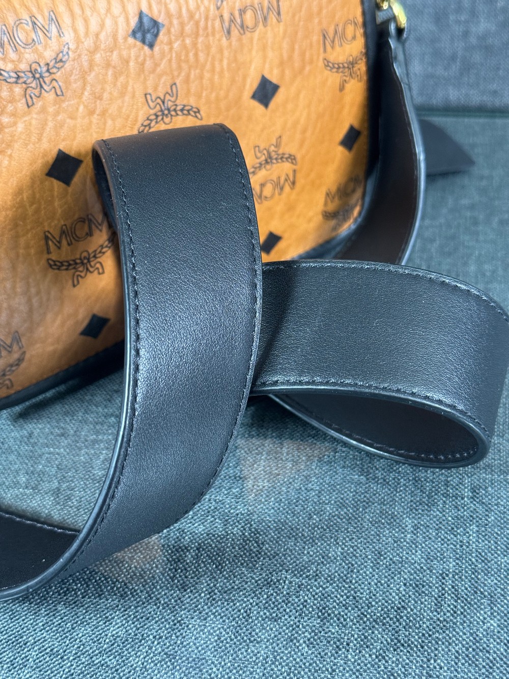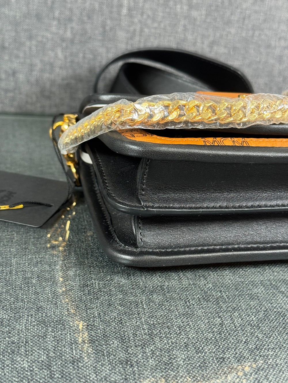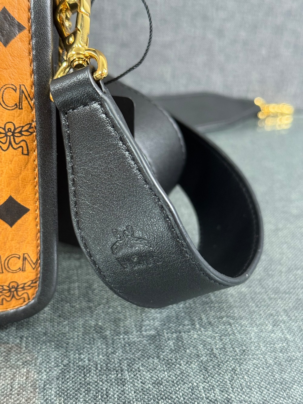 This is an authentic MCM Visetos Mini Patricia Crossbody Bag in Cognac and Black. This chic crossbody bag is crafted of grained calfskin leather in white and black. The bag features a gold chain strap and a black leather crossover flap that opens with a gold flip-lock to a partitioned brown microfiber interior with zipper and patch pockets.