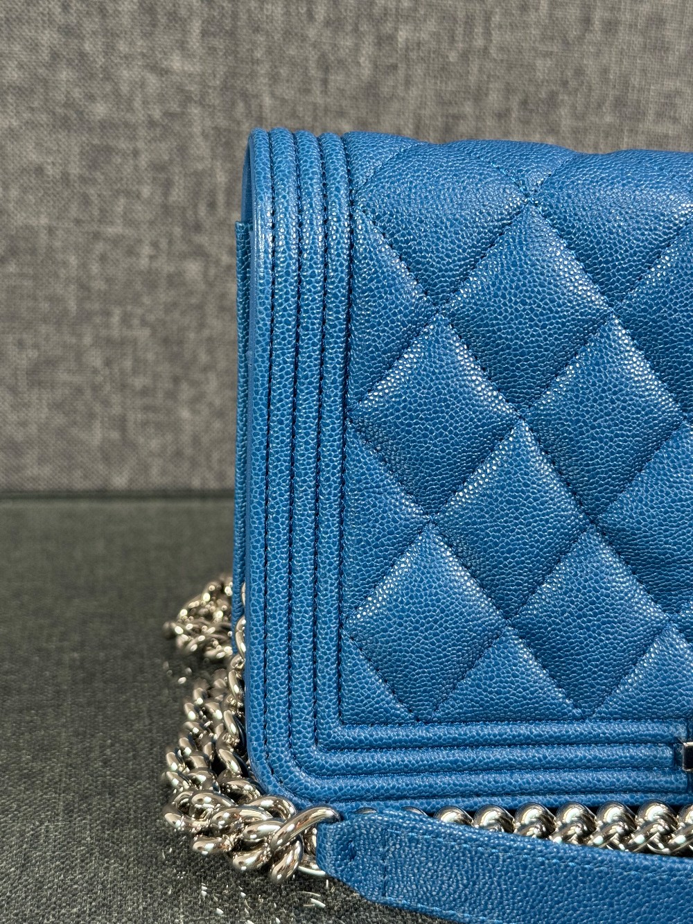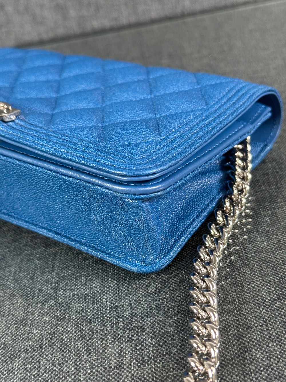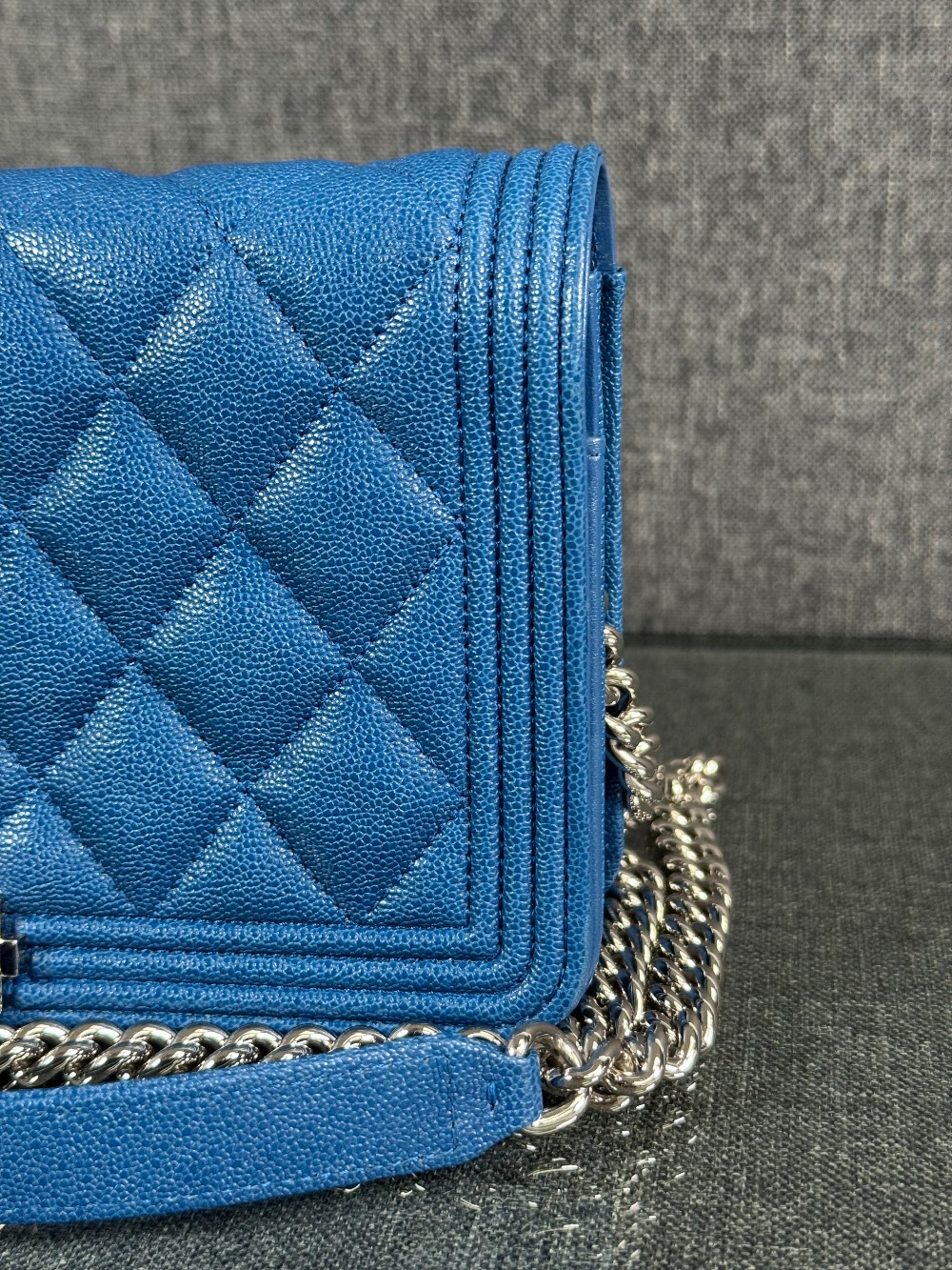 This is an authentic CHANEL Caviar Quilted Boy Wallet On Chain WOC in Blue. This stunning wallet on chain is crafted of luxurious diamond quilted caviar leather in blue with peripheral linear quilting. The bag features a silvet chain-link shoulder strap and a silver Chanel Boy CC push lock detail. The facing flap opens to a compact blue leather and fabric interior with card slots and a zipper compartment.
