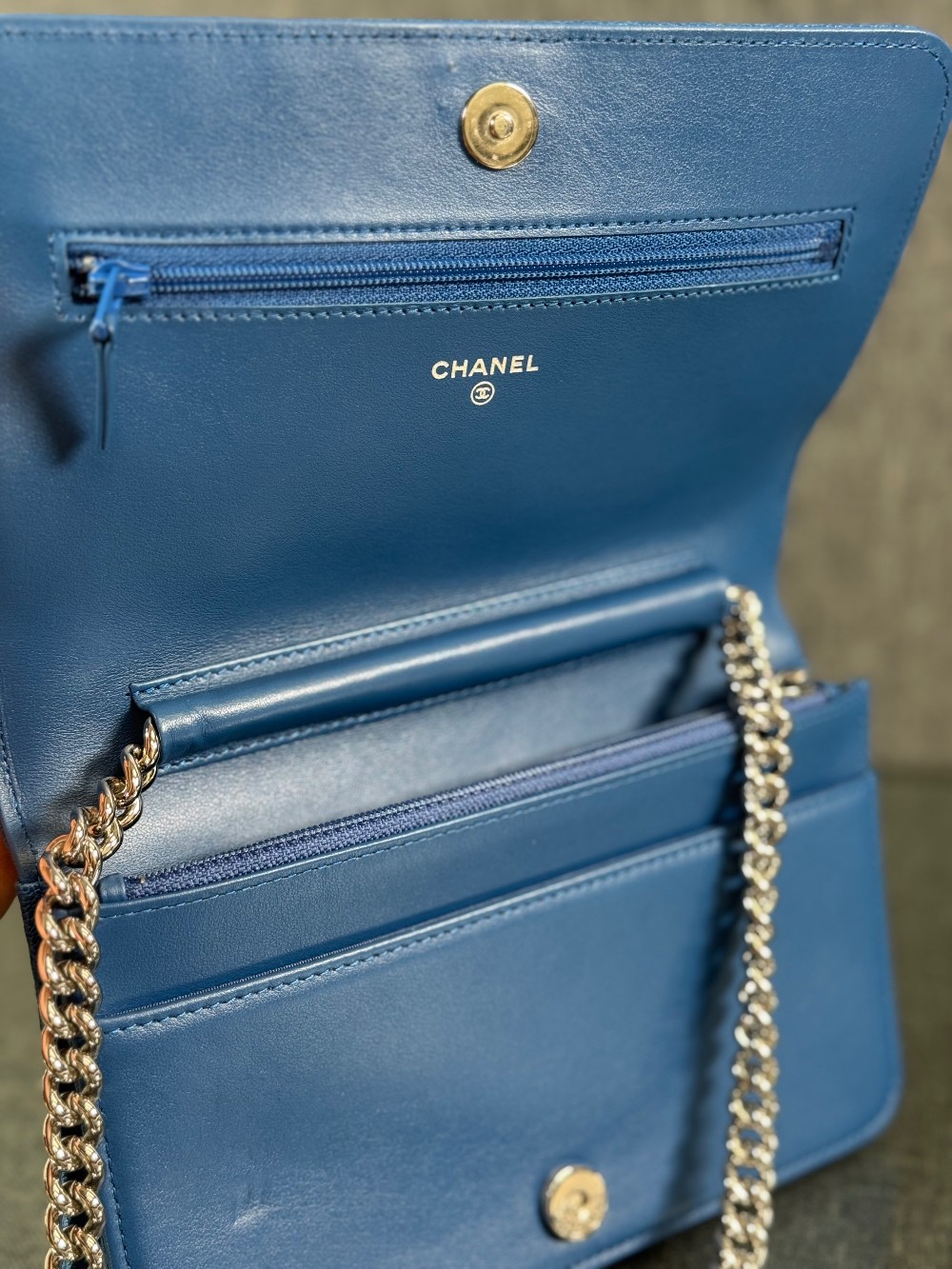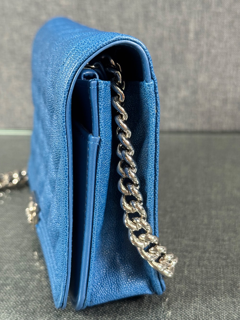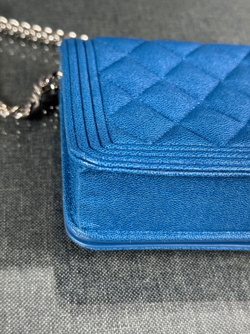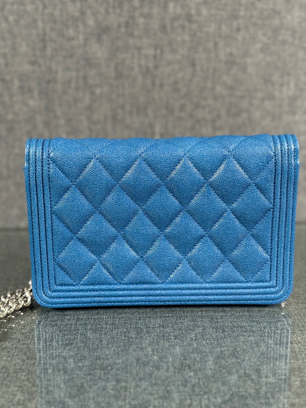 This is an authentic CHANEL Caviar Quilted Boy Wallet On Chain WOC in Blue. This stunning wallet on chain is crafted of luxurious diamond quilted caviar leather in blue with peripheral linear quilting. The bag features a silvet chain-link shoulder strap and a silver Chanel Boy CC push lock detail. The facing flap opens to a compact blue leather and fabric interior with card slots and a zipper compartment.