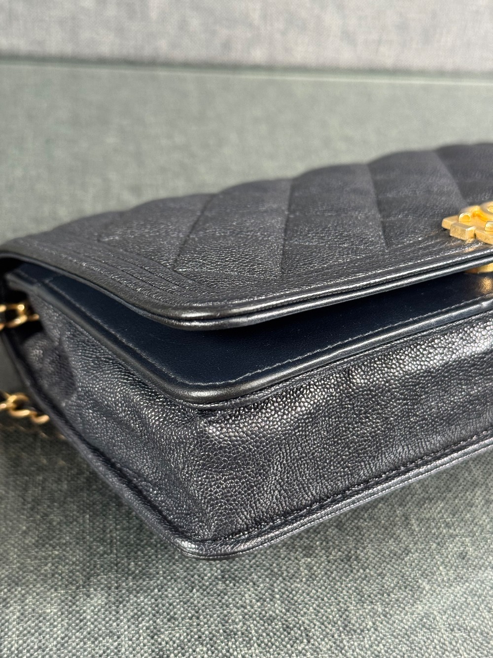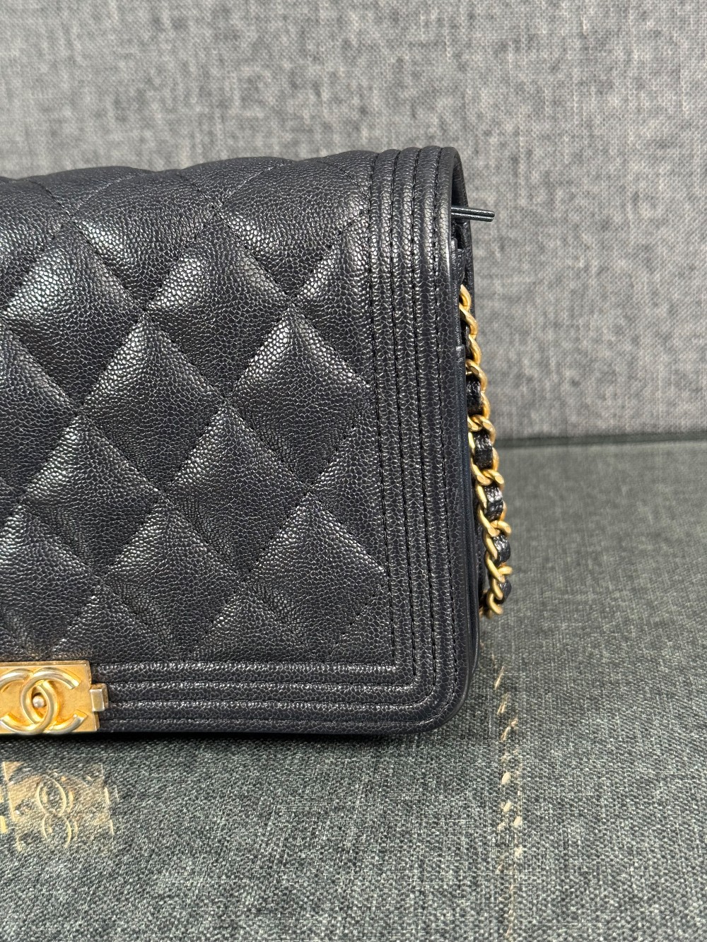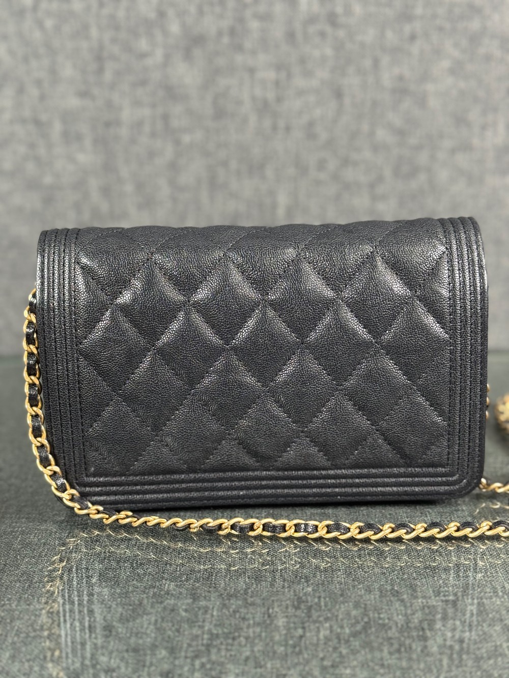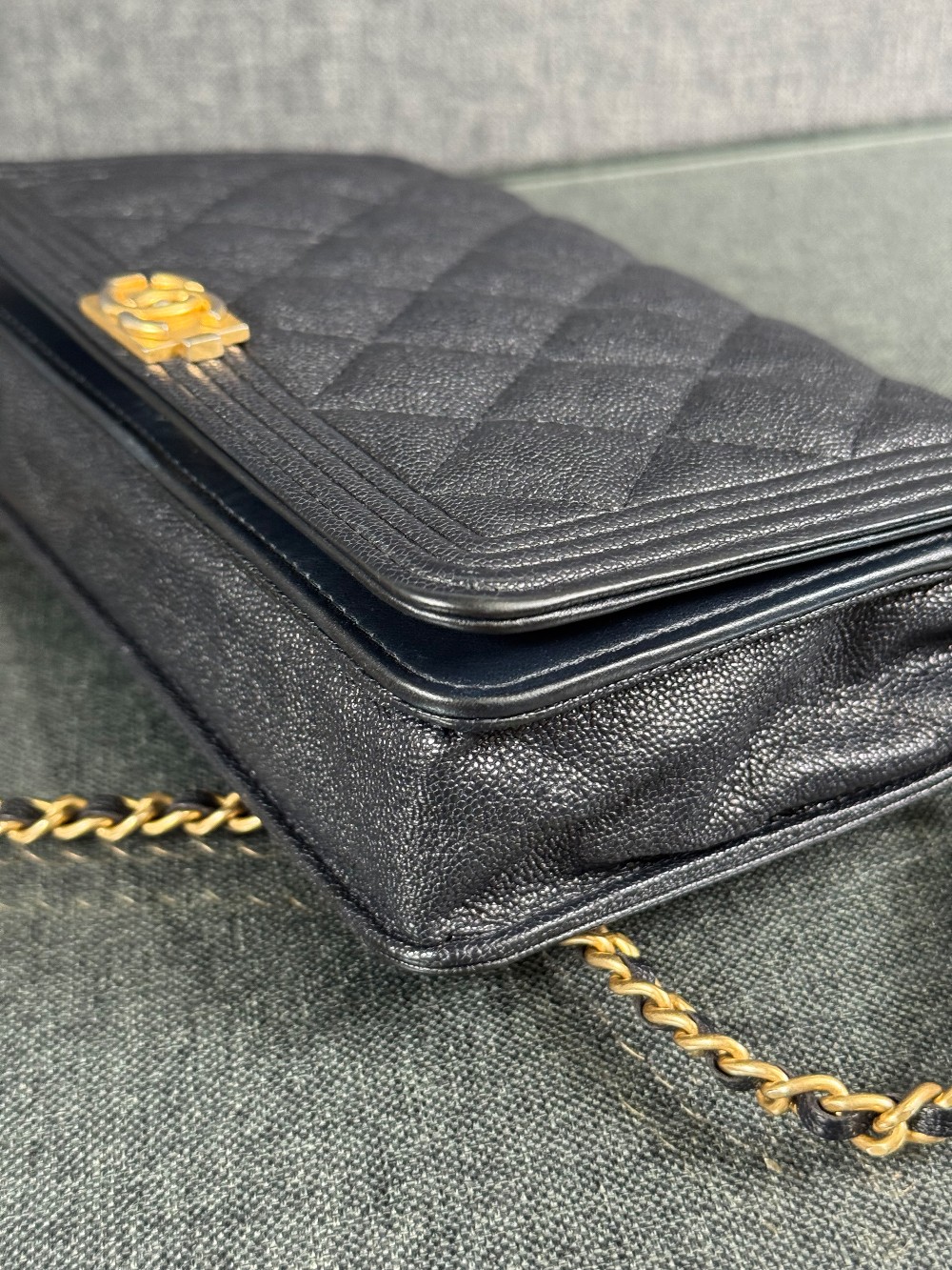This is an authentic CHANEL Caviar Quilted Boy Wallet On Chain WOC in Black. This stunning wallet on chain is crafted of luxurious diamond quilted caviar leather in black with peripheral linear quilting. The bag features a gold chain-link shoulder strap and a gold Chanel Boy CC push lock detail. The facing flap opens to a compact black leather and fabric interior with card slots and a zipper compartment.