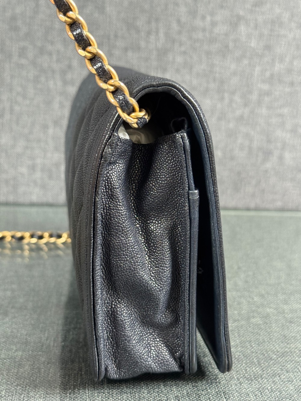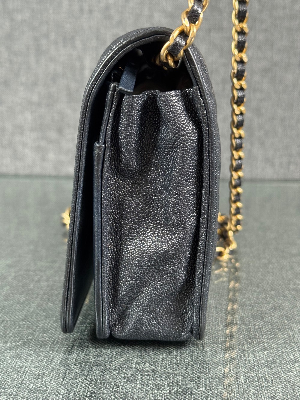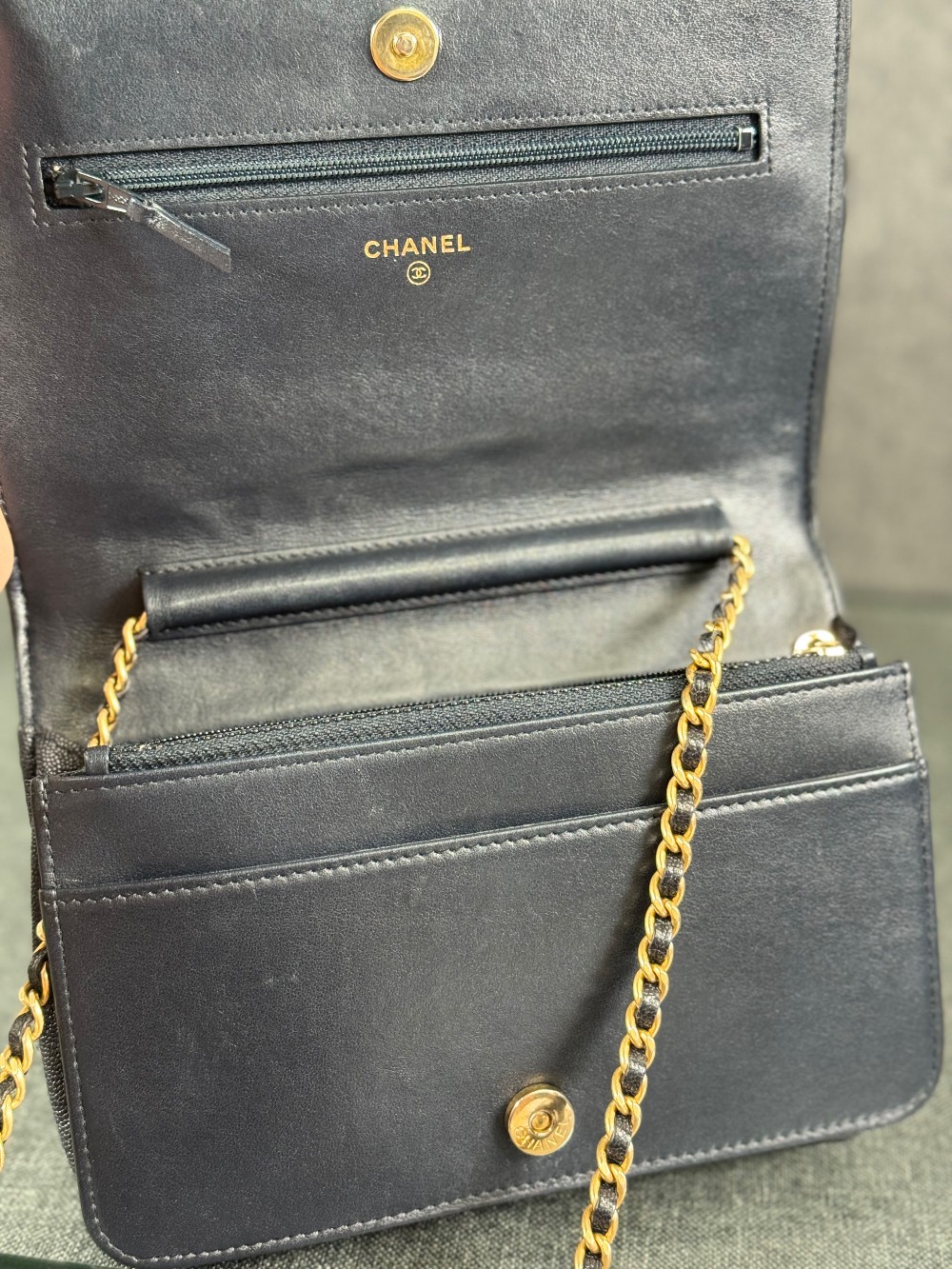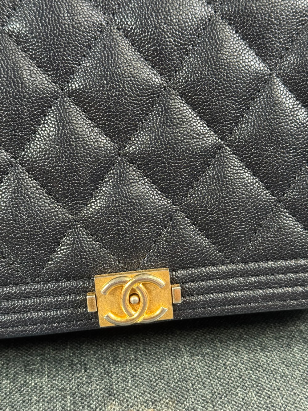 This is an authentic CHANEL Caviar Quilted Boy Wallet On Chain WOC in Black. This stunning wallet on chain is crafted of luxurious diamond quilted caviar leather in black with peripheral linear quilting. The bag features a gold chain-link shoulder strap and a gold Chanel Boy CC push lock detail. The facing flap opens to a compact black leather and fabric interior with card slots and a zipper compartment.
