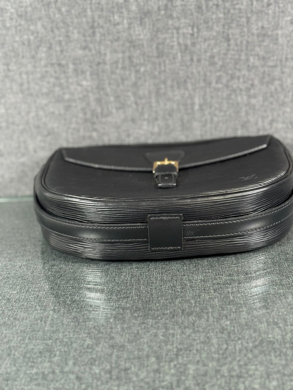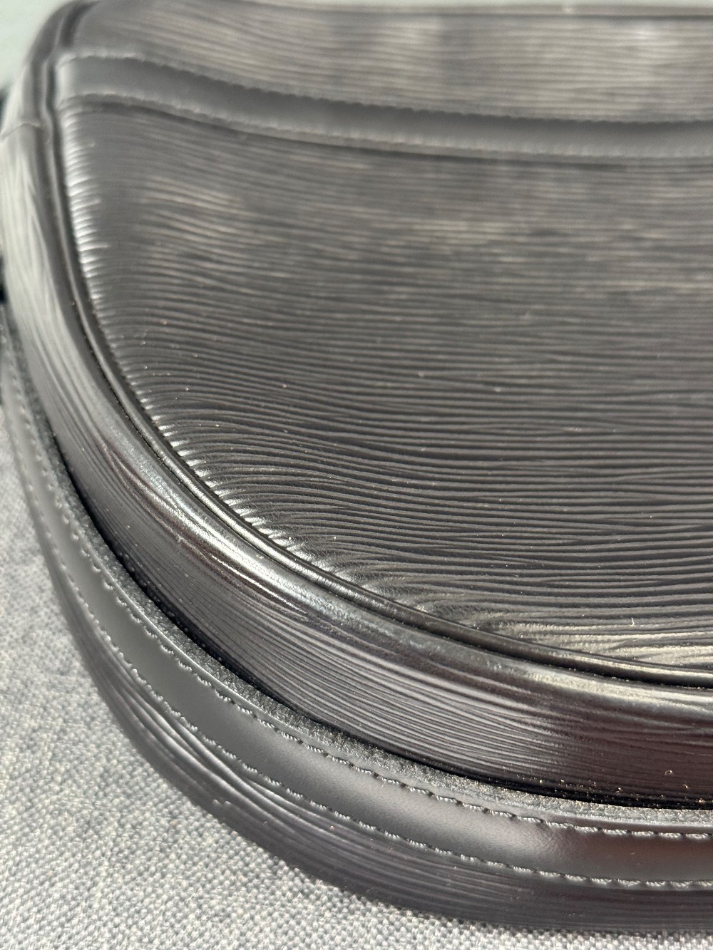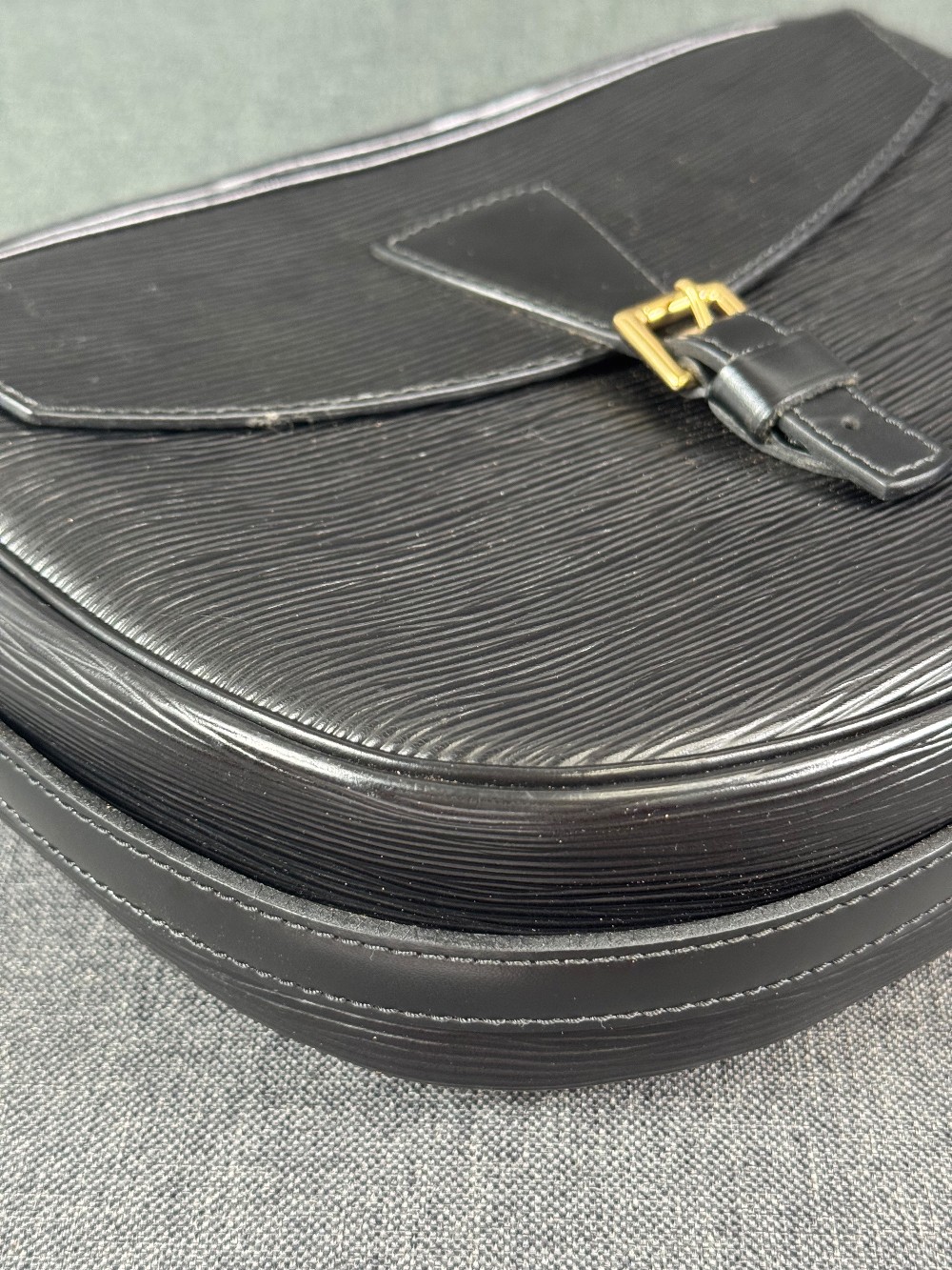 This is an authentic LOUIS VUITTON Epi Jeune Fille in Black. This chic shoulder bag is crafted of Louis Vuitton signature textured epi leather. The bag features an adjustable leather cross-body strap with a belt and polished brass buckle for the frontal flap. This opens to a cross-grain leather interior. This is an excellent shoulder bag, ideal for everyday use, from Louis Vuitton!