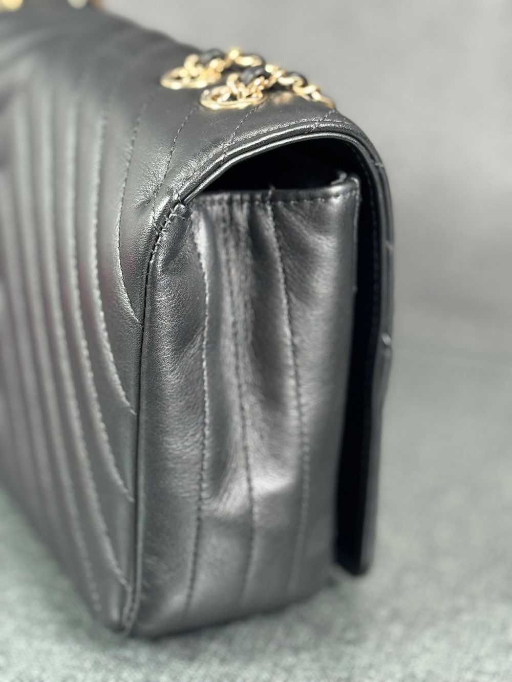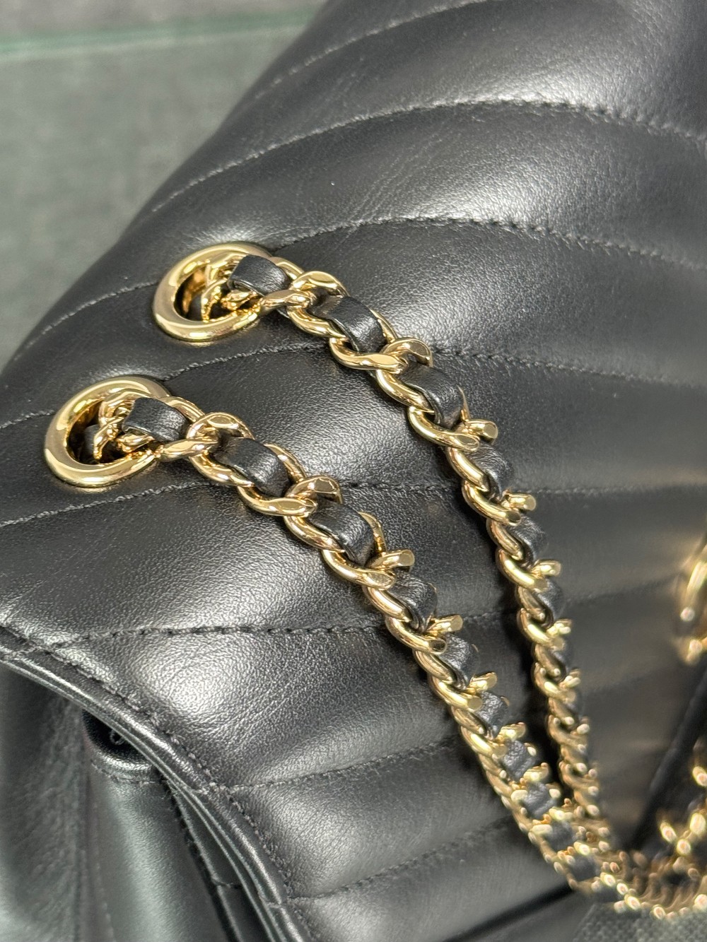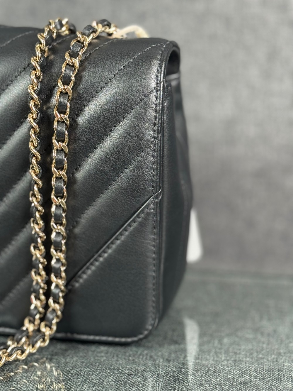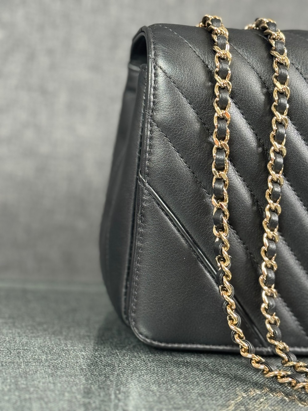 This is an authentic CHANEL Calfskin Chevron Quilted Small Statement Flap in Black. This stylish shoulder bag is crafted of chevron quilted calfskin leather in black. The bag features gold chain link leather threaded shoulder straps and a full frontal flap with a gold Chanel CC turn lock. This opens to a black fabric interior with zipper and patch pockets.
