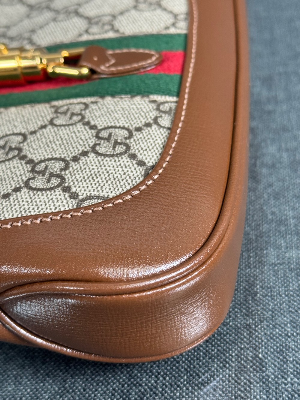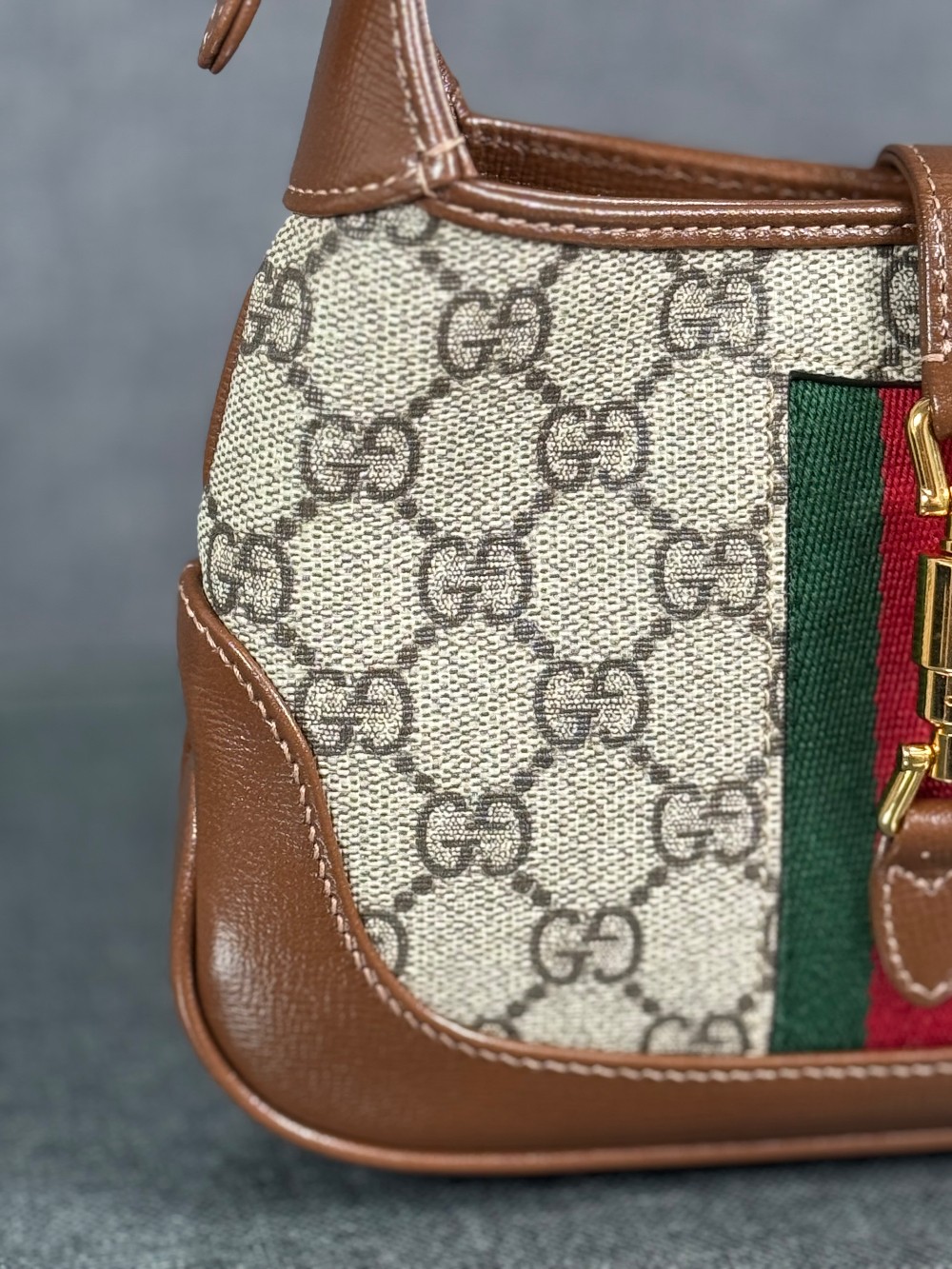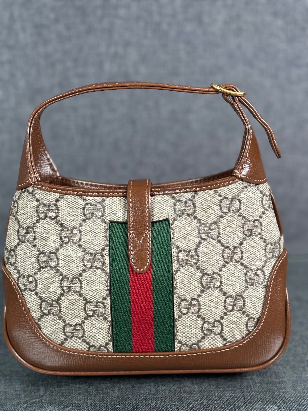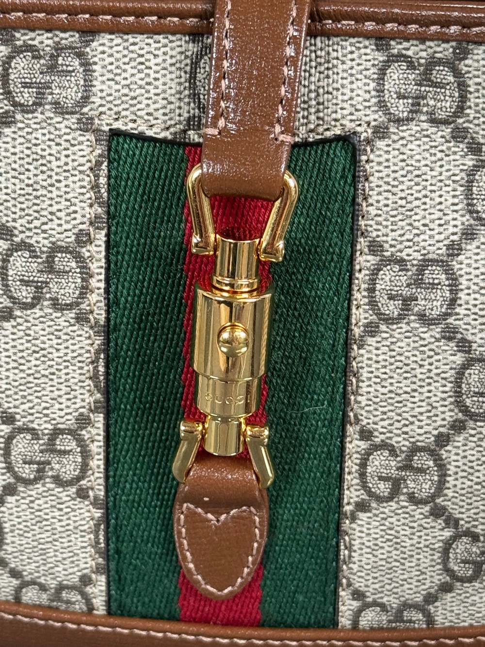 This is an authentic GUCCI GG Supreme Monogram Azalea Calfskin Web Mini Jackie 1961 Hobo in Beige Ebony and Brown Sugar. This bag crafted of traditional brown on beige monogram coated canvas, brown leather trim and gold hardware. The top opens to a beige microfiber interior with a brown leather patch pocket.