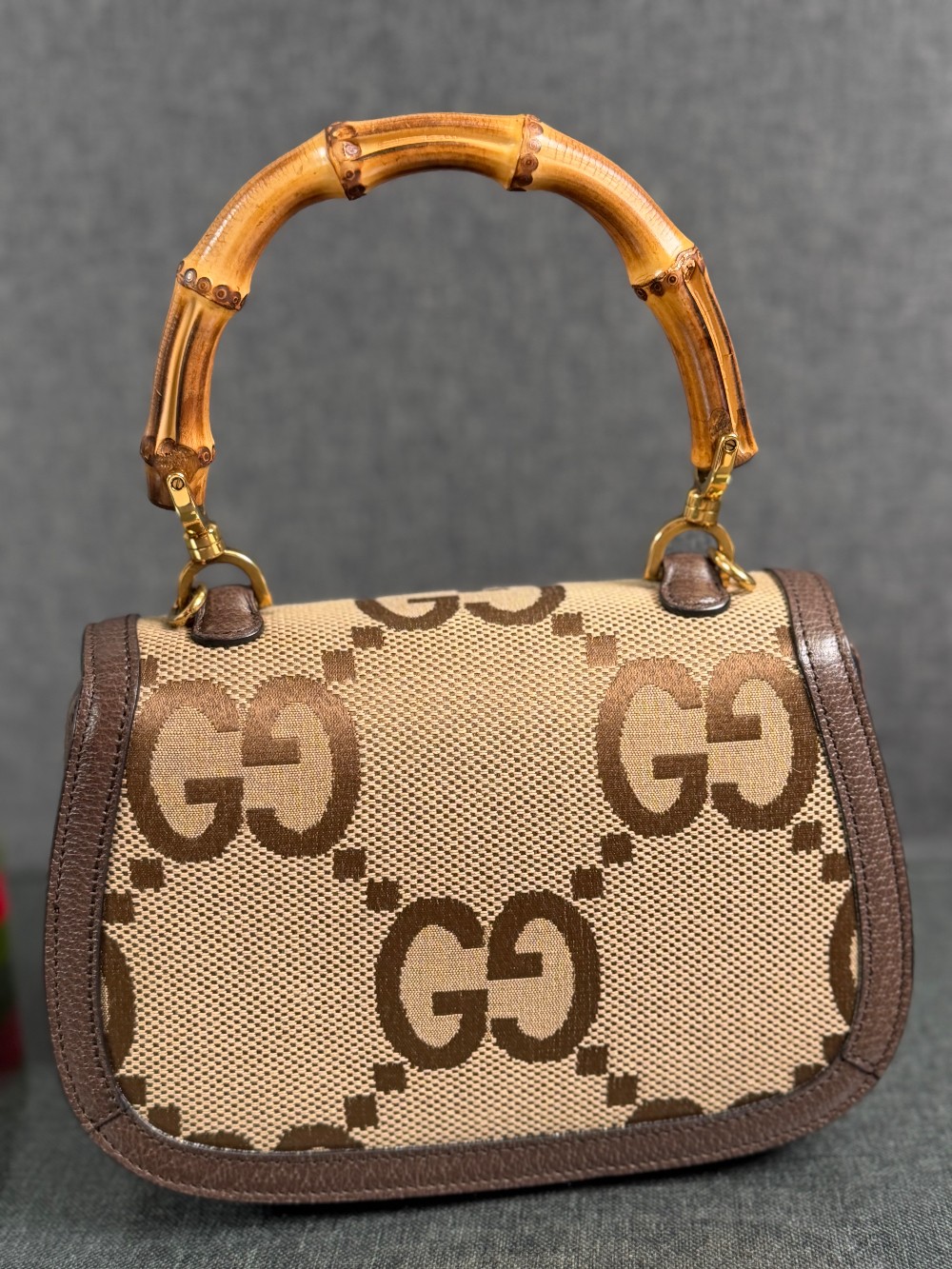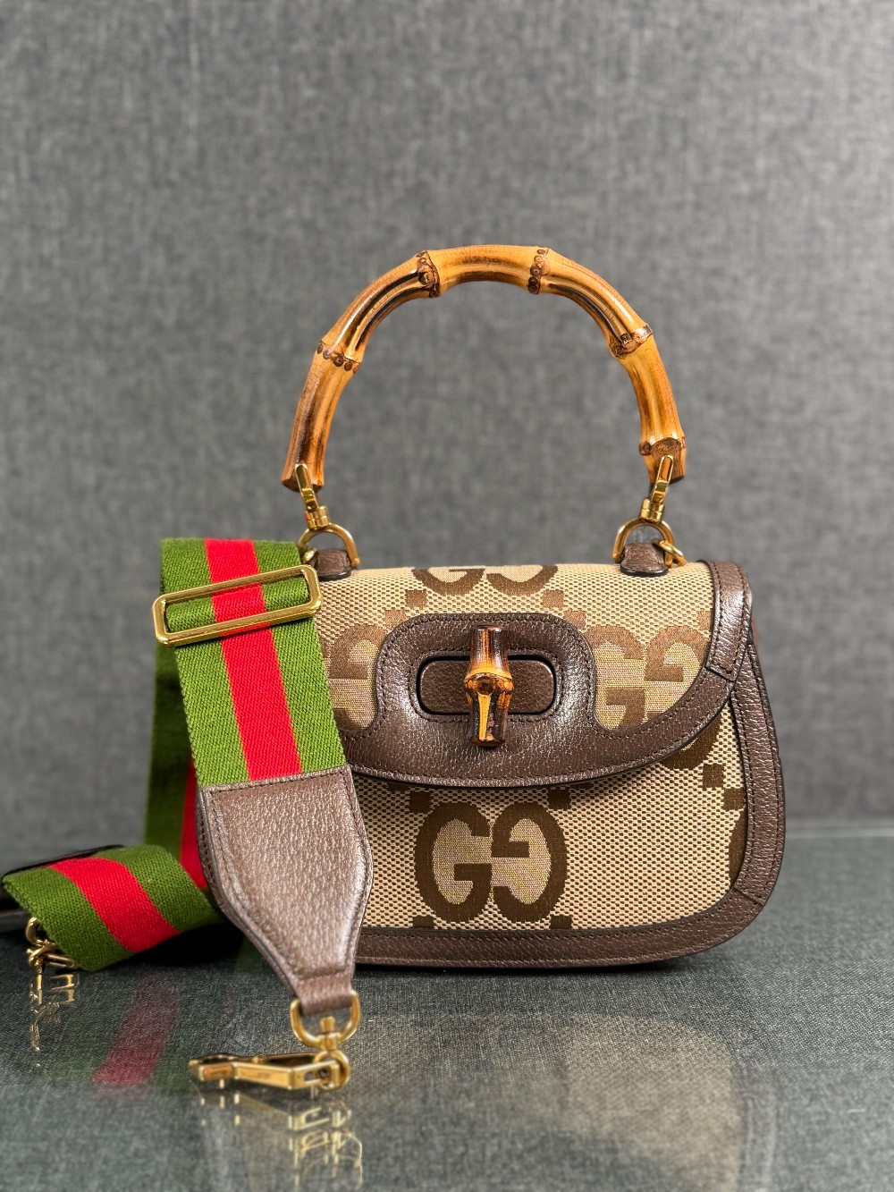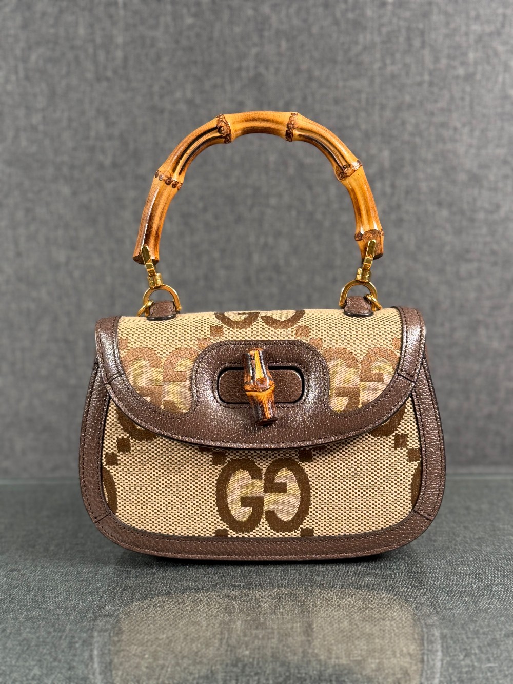 This is an authentic GUCCI Monogram Jumbo GG Textured Dollar Calfskin Web Small Bamboo 1947 Top Handle Bag in Camel, Ebony and New Acero. This chic bag is crafted of calfskin leather. The bag has a sturdy looping bamboo top handle and a bamboo turn lock for the frontal flap. This opens to a calfskin leather interior with a zipper and patch pocket.