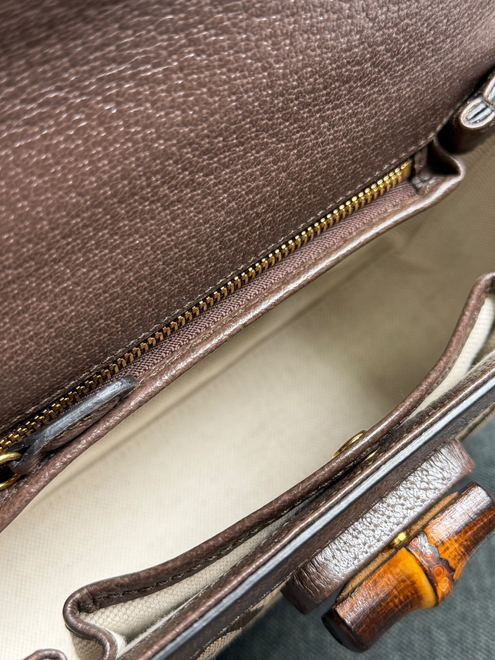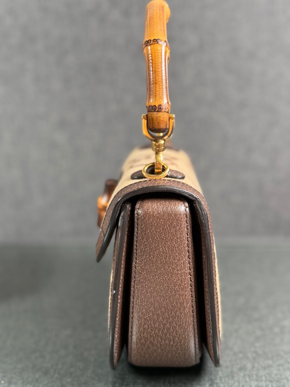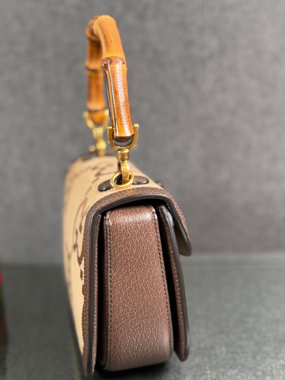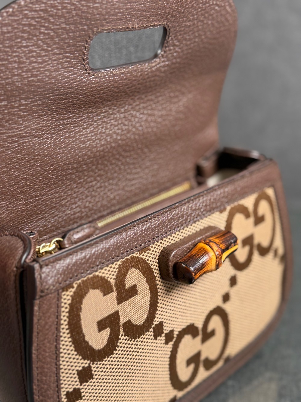 This is an authentic GUCCI Monogram Jumbo GG Textured Dollar Calfskin Web Small Bamboo 1947 Top Handle Bag in Camel, Ebony and New Acero. This chic bag is crafted of calfskin leather. The bag has a sturdy looping bamboo top handle and a bamboo turn lock for the frontal flap. This opens to a calfskin leather interior with a zipper and patch pocket.