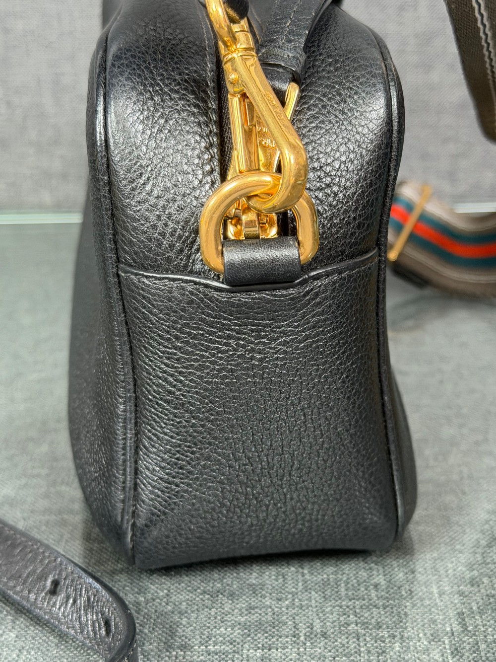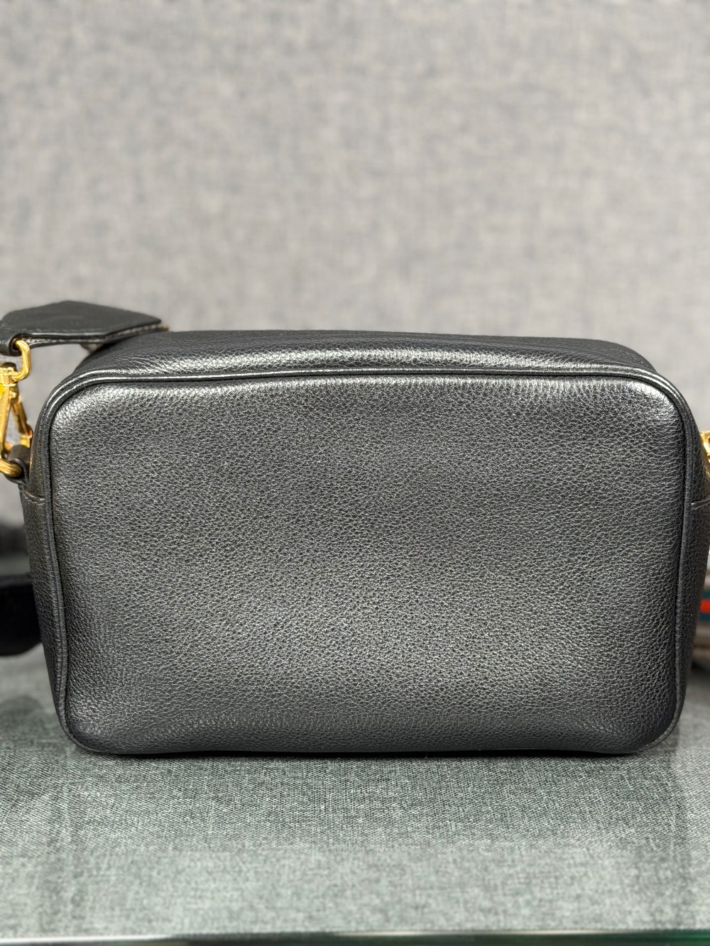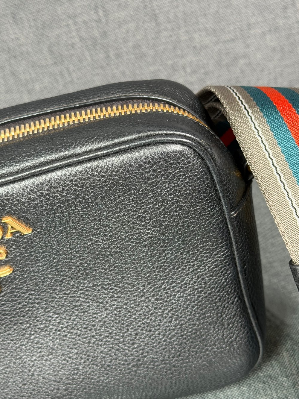 This is an authentic PRADA Vitello Daino Soft Camera Crossbody in Black. This stunning crossbody bag is beautifully crafted of calfskin leather in black. The bag features an adjustable leather shoulder strap, a canvas shoulder strap, and golden hardware. The zipper open to a compact black Prada monogrammed fabric interior with a flat pocket.