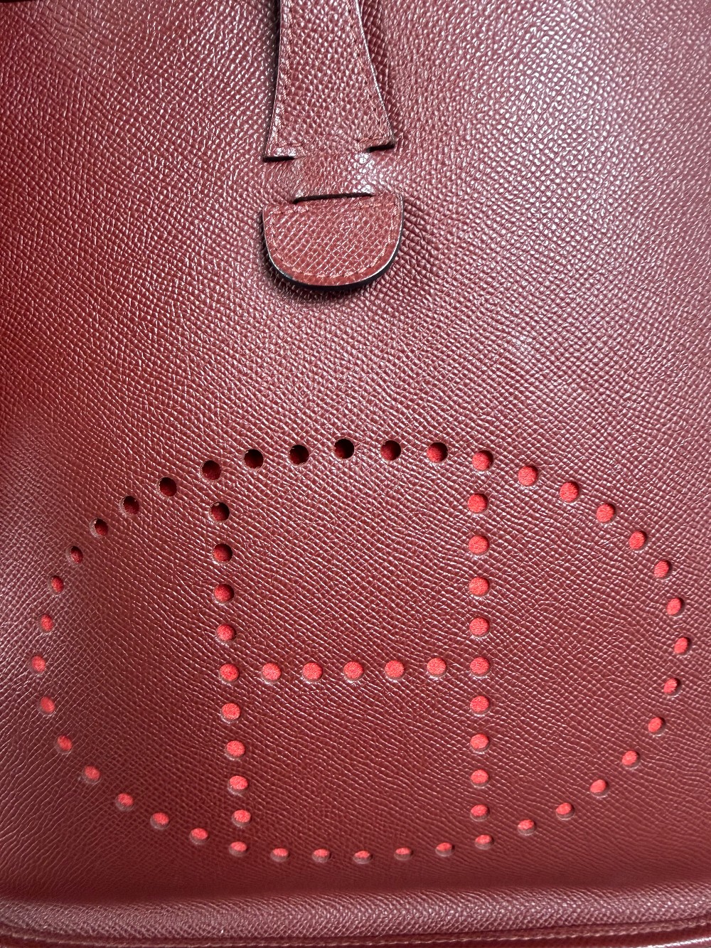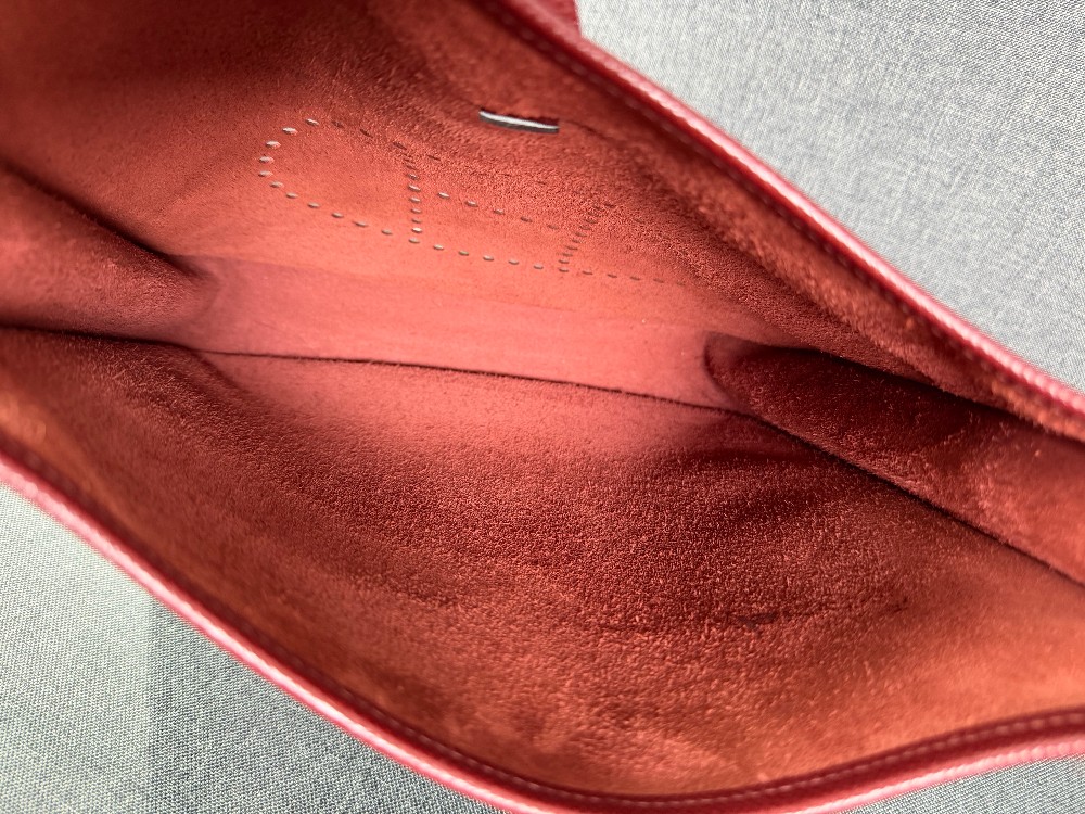 The bag has a casual, saddle-shaped silhouette, originally designed in 1978 by Evelyne Bertrand for horse groomers. "H" Logo: A signature large, oval "H" logo is perforated into the front panel of the leather. This was initially a functional design choice to promote airflow for grooming tools.