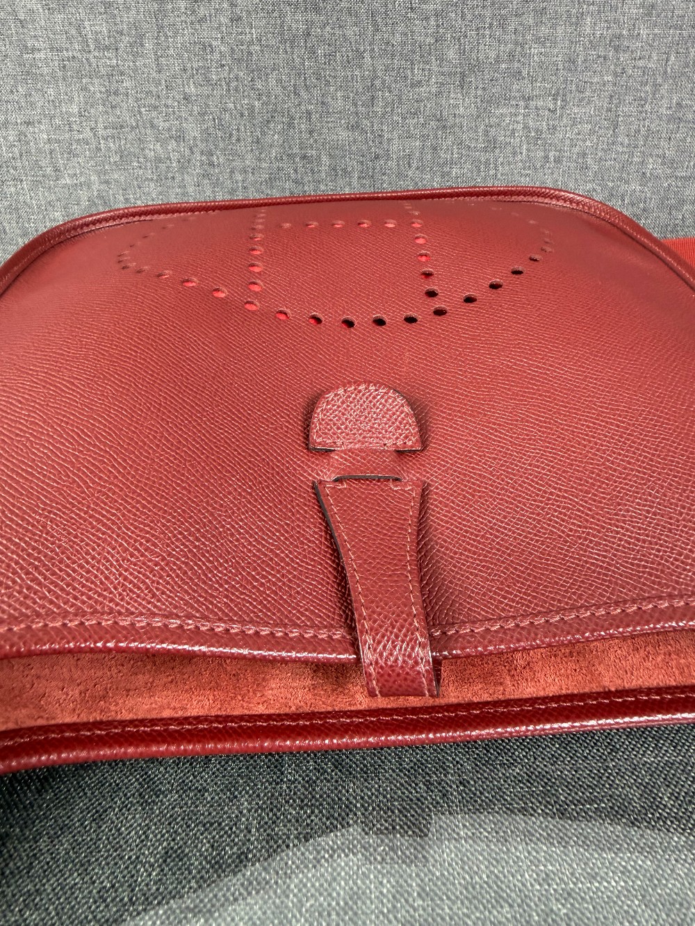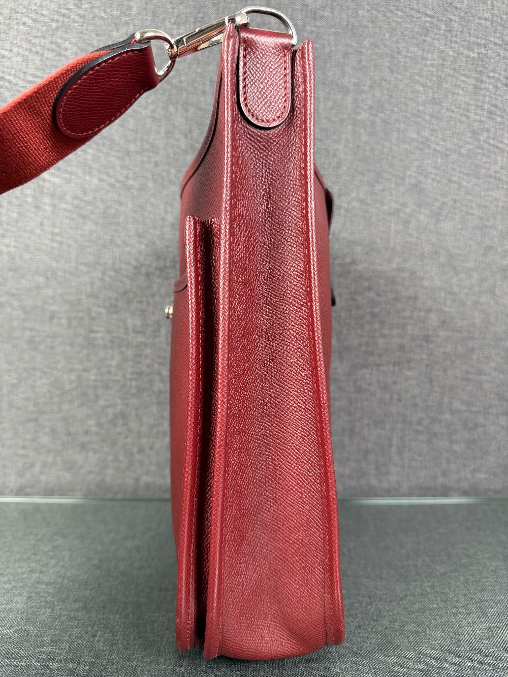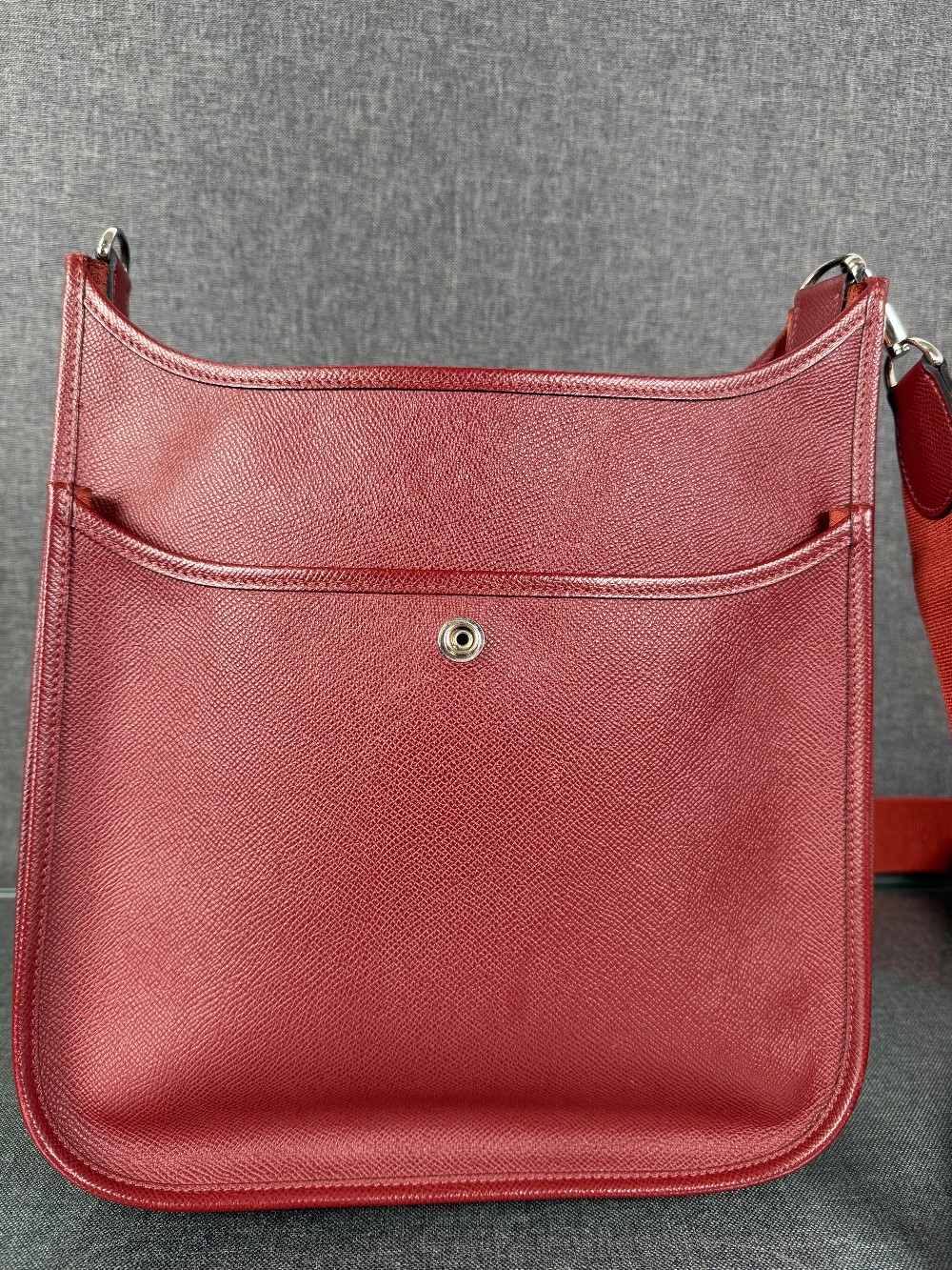 It is crafted from durable grained calfskin leather. The hardware appears to be palladium.The bag features a wide, adjustable canvas shoulder or crossbody strap, allowing for hands-free wear.The Evelyne is a popular, gender-neutral bag known for its lightweight and practical nature, suitable for everyday use.