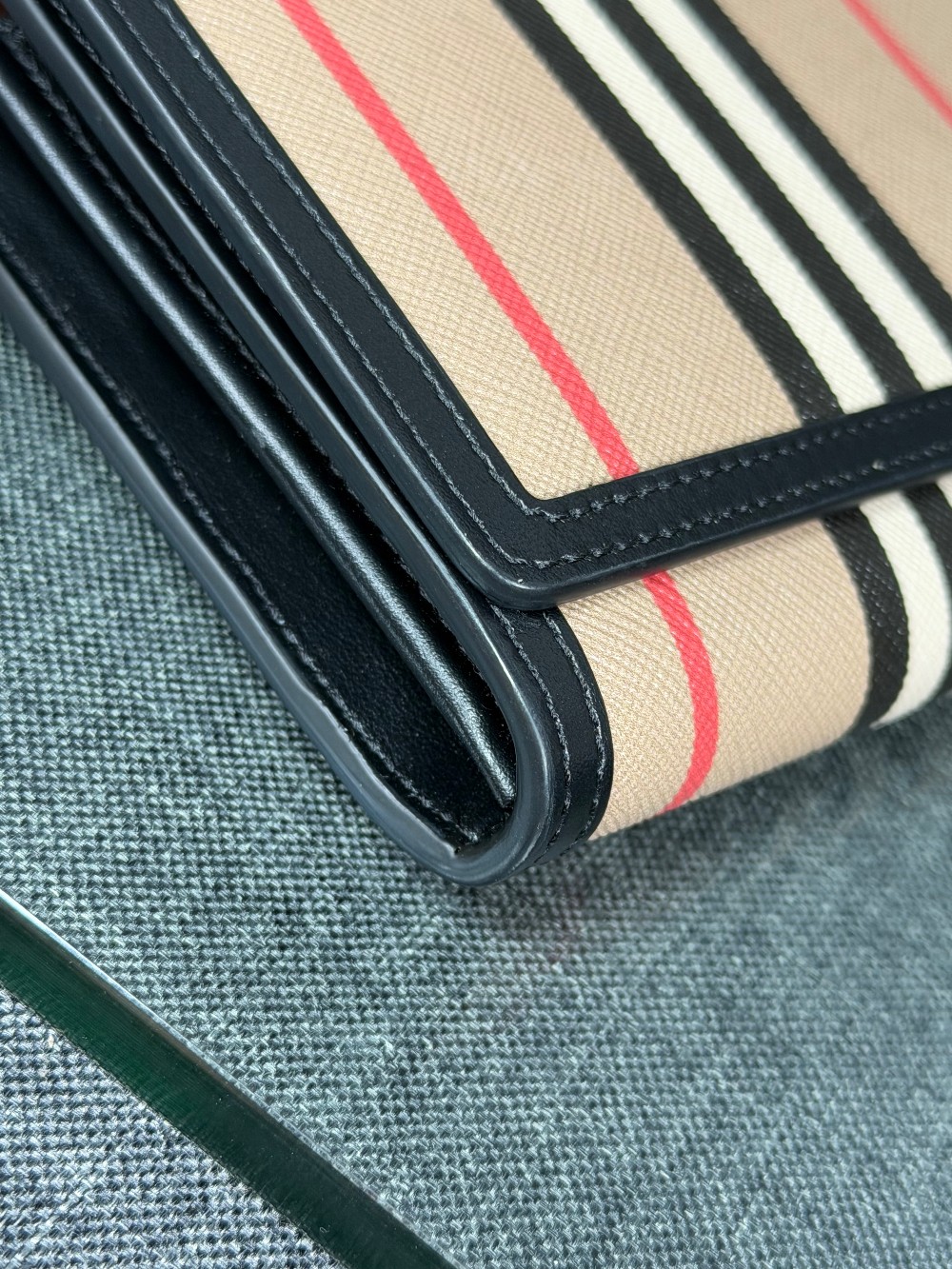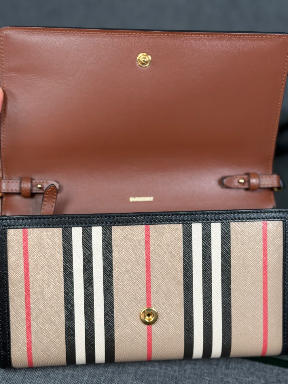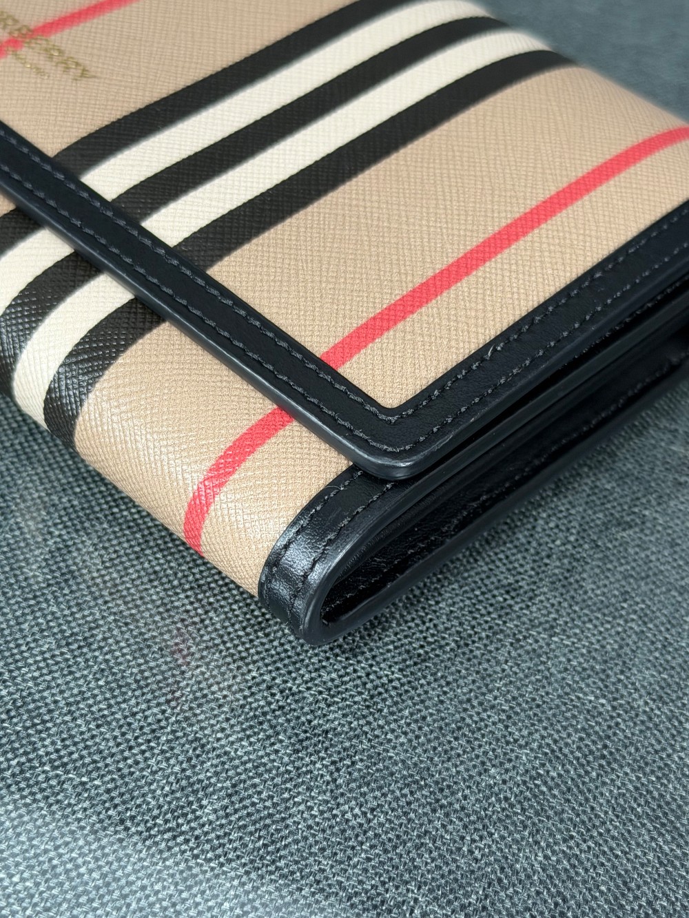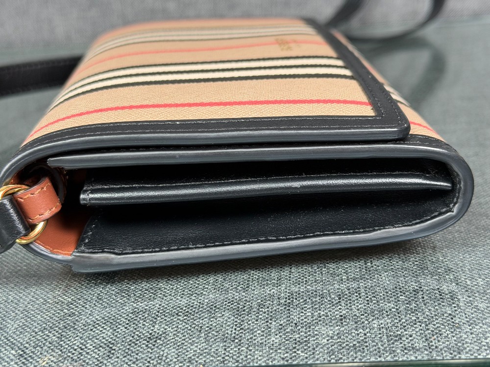 This authentic BURBERRY WALLET ON STRAP bag featuring a classic check pattern in beige with black, white, and red stripes. The structured silhouette is finished with smooth black leather trim and a slim adjustable leather strap for easy wear. A subtle logo detail on the front adds a refined touch.
